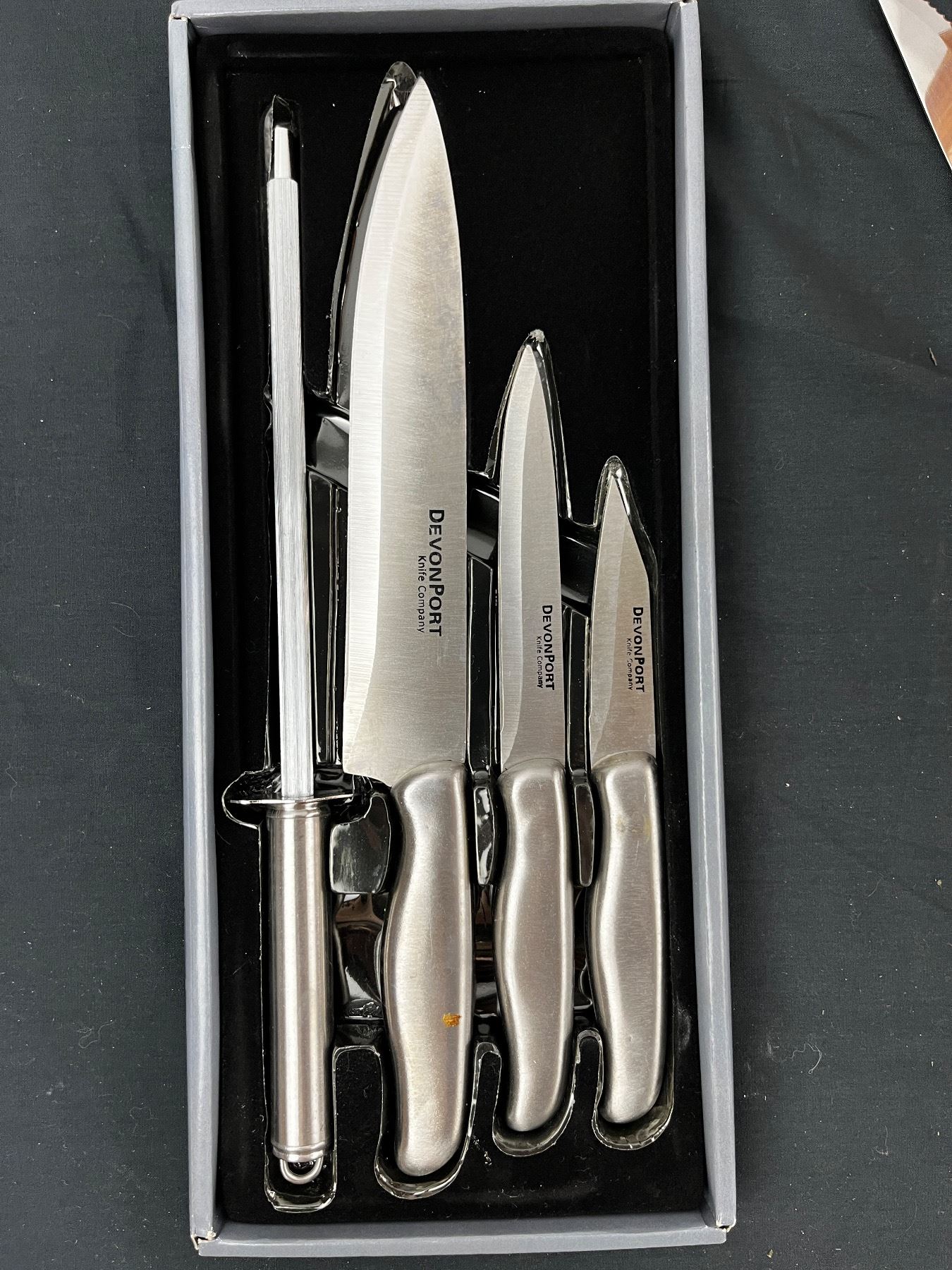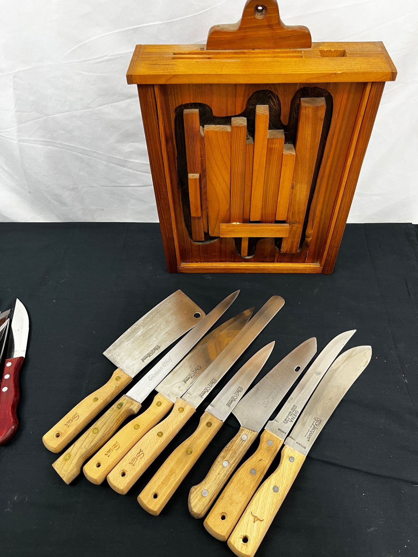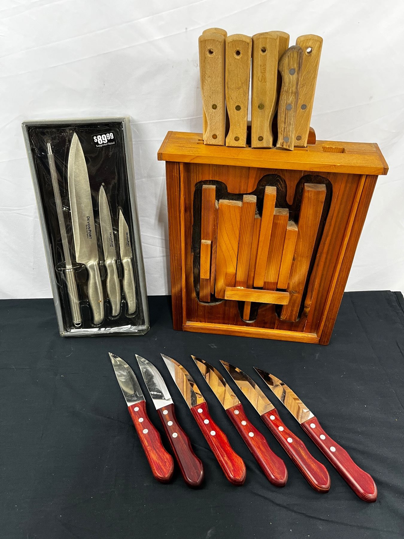 Includes, New Devon Port knife set, set of 6 Tramontina steak knives, hanging knife block with various brands