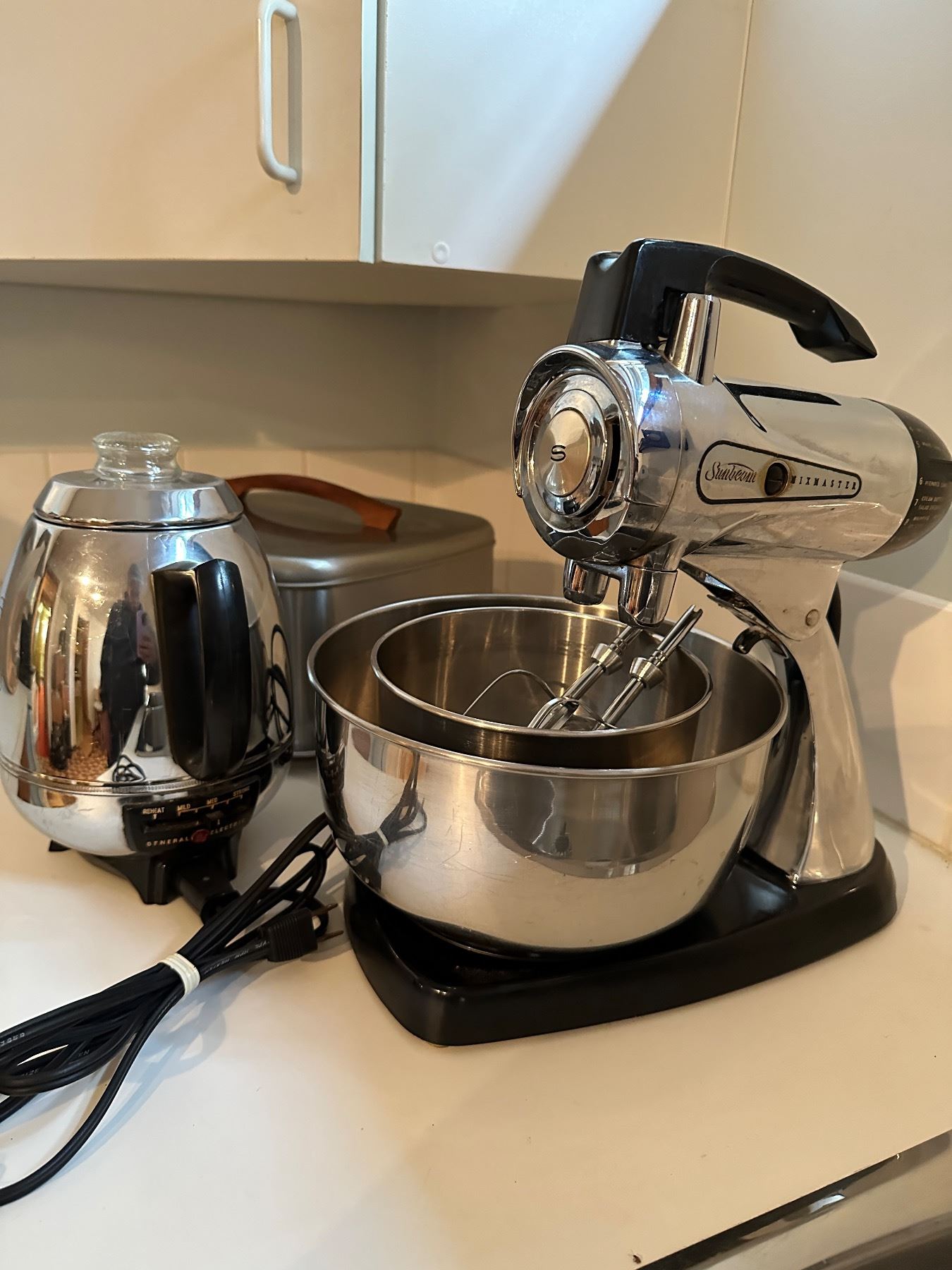 Including Sunbeam Mixer - works, General Electric Coffee Pot - works and cake plate