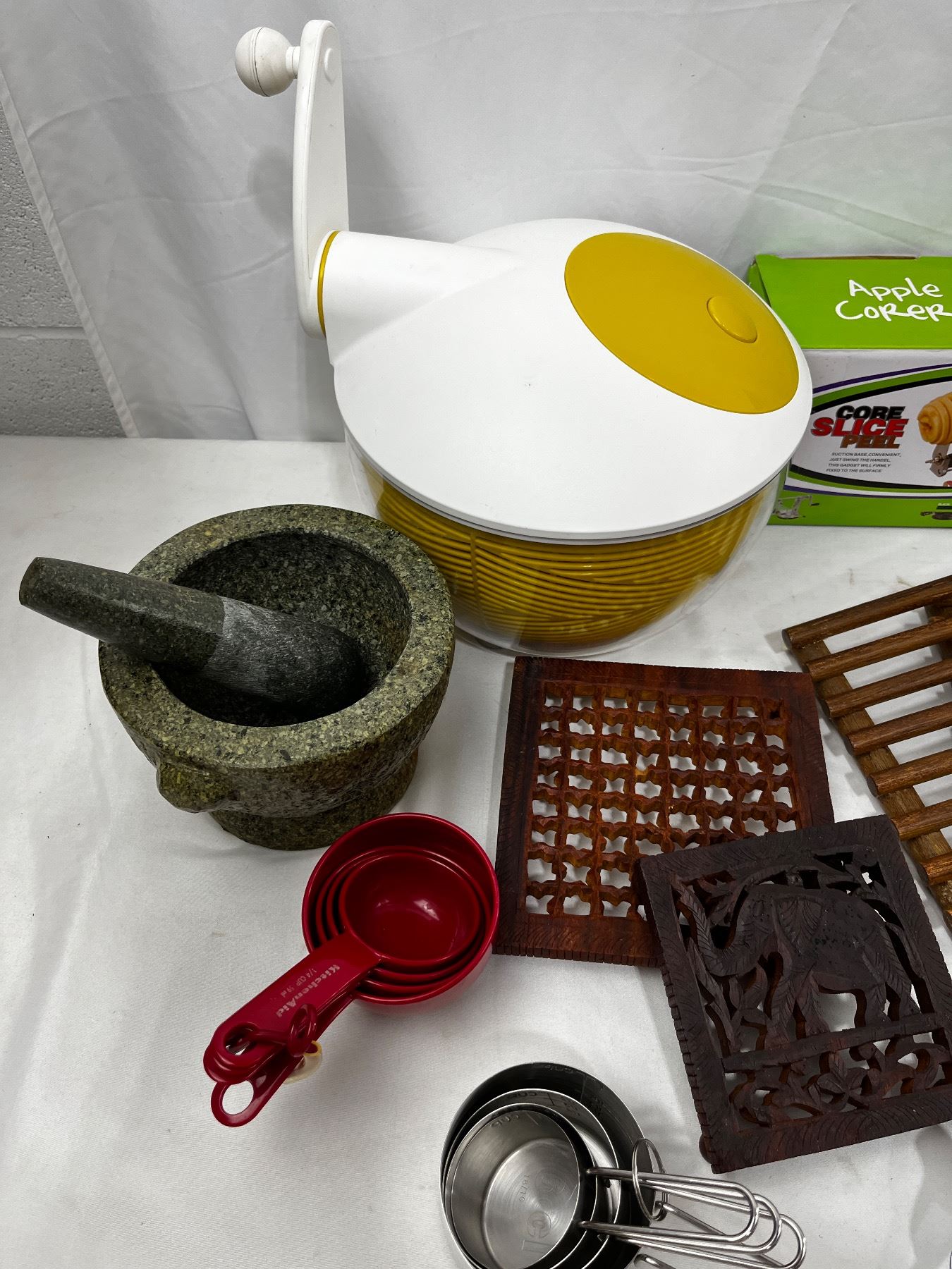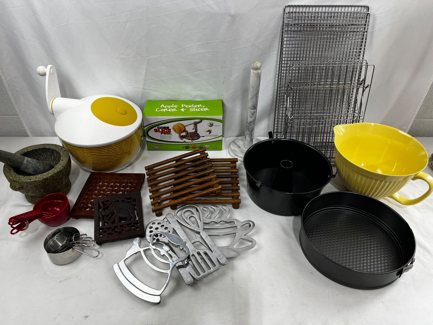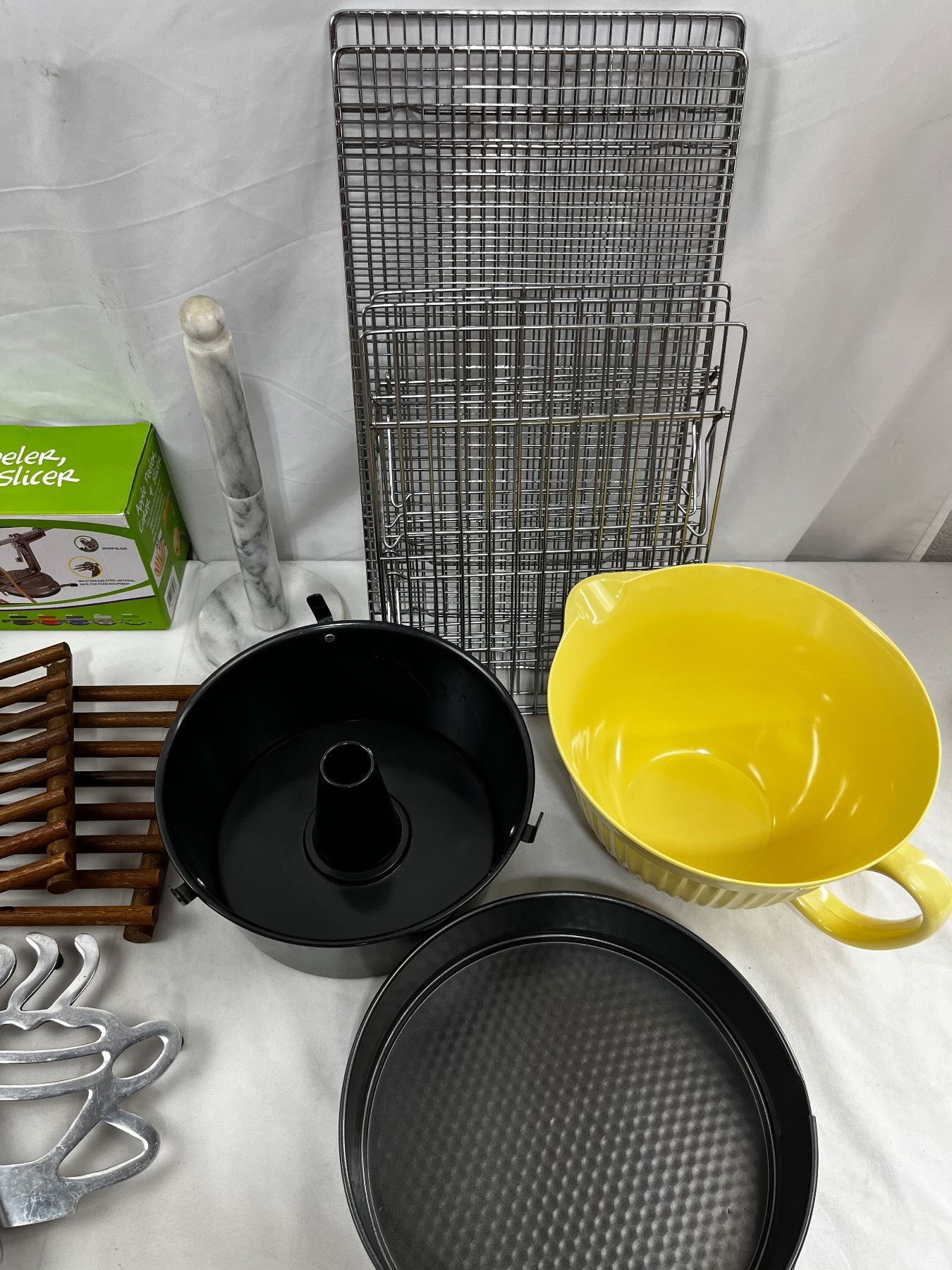 Includes, Apple peeler/corer/slicer, baking pans and cooling racks, various trivets etc.