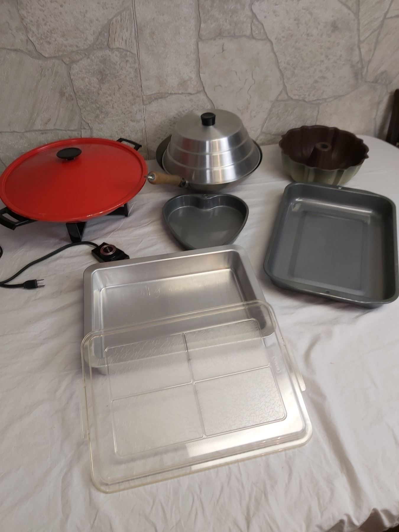 Includes an assortment of pots and pans, West Bend electric wok, etc.