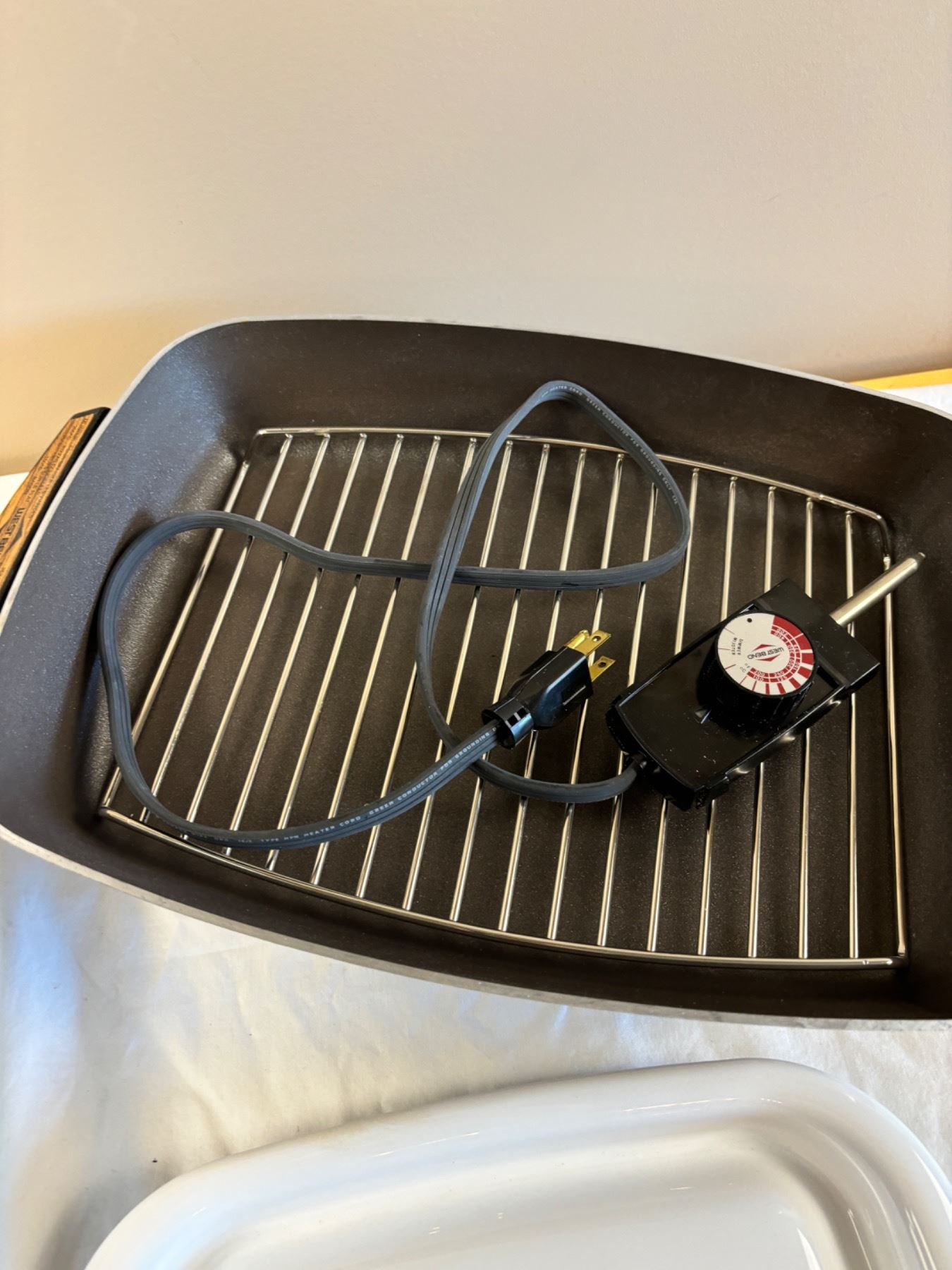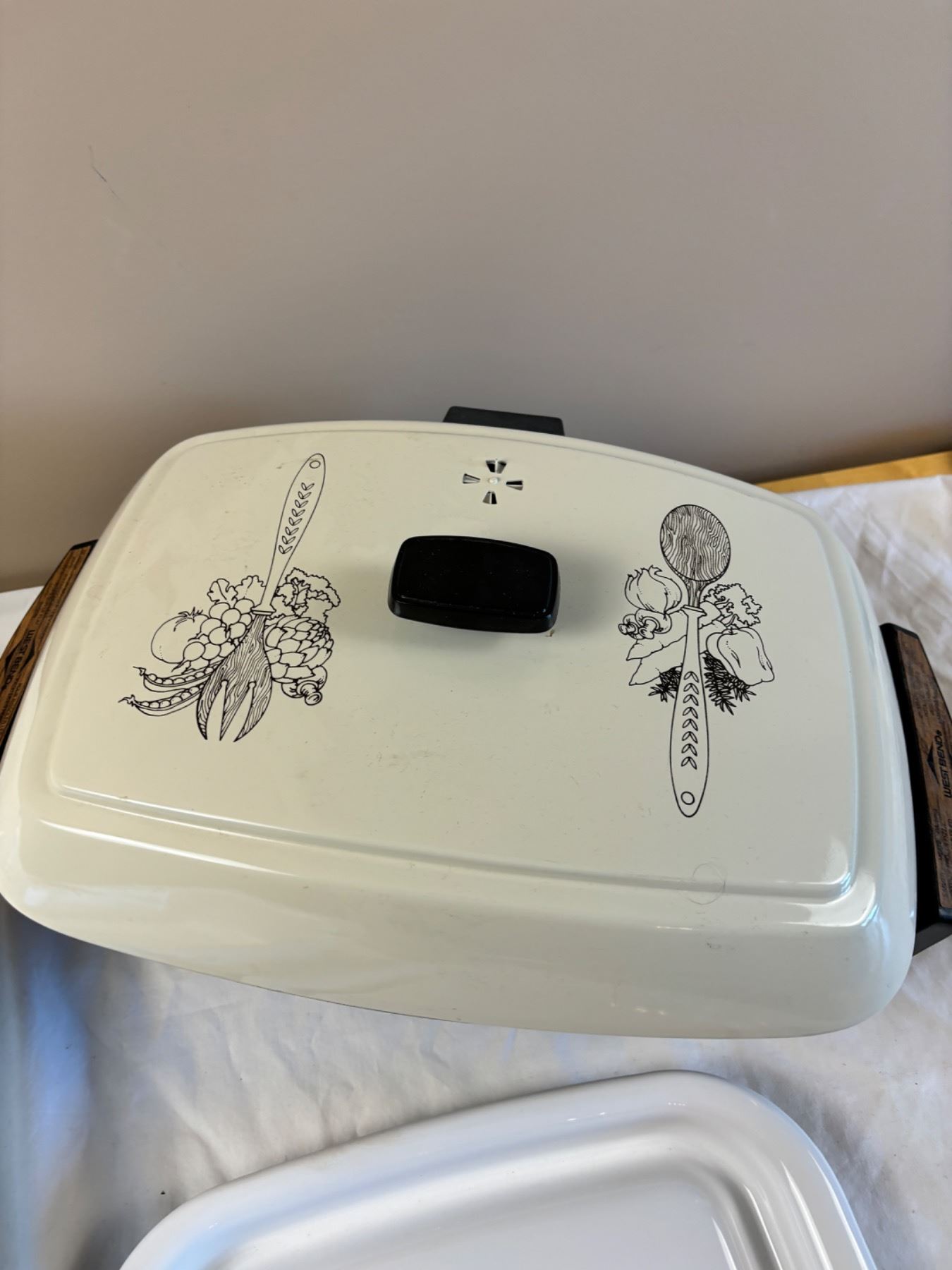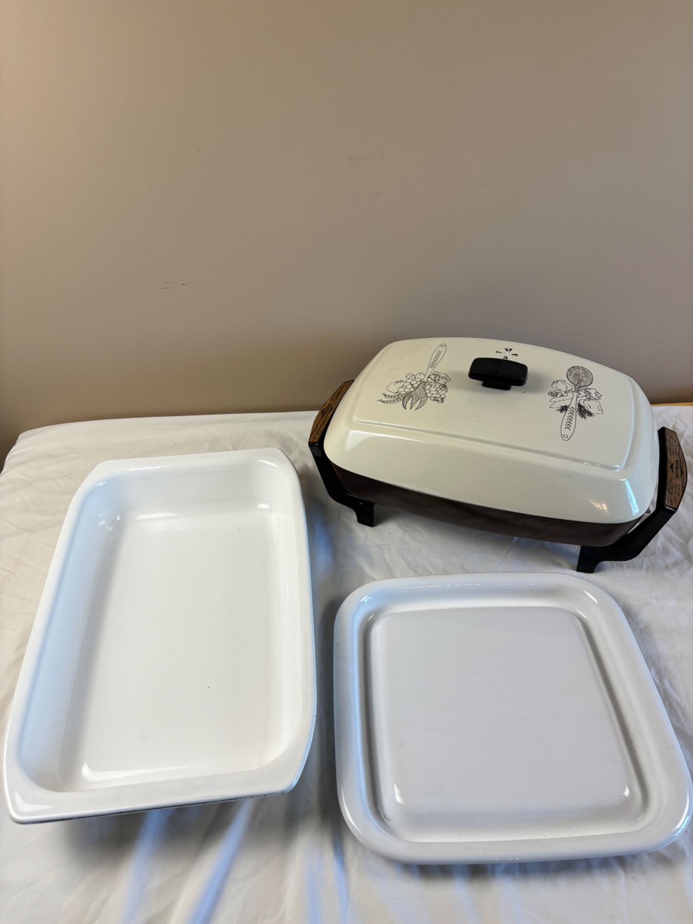 Includes, Westbend electric skillet (has power), 2 corning ware dishes, both have some wear