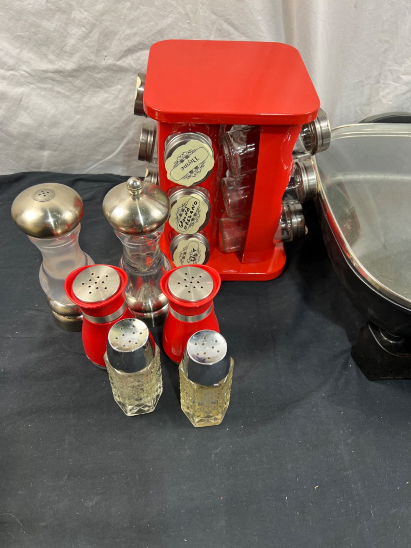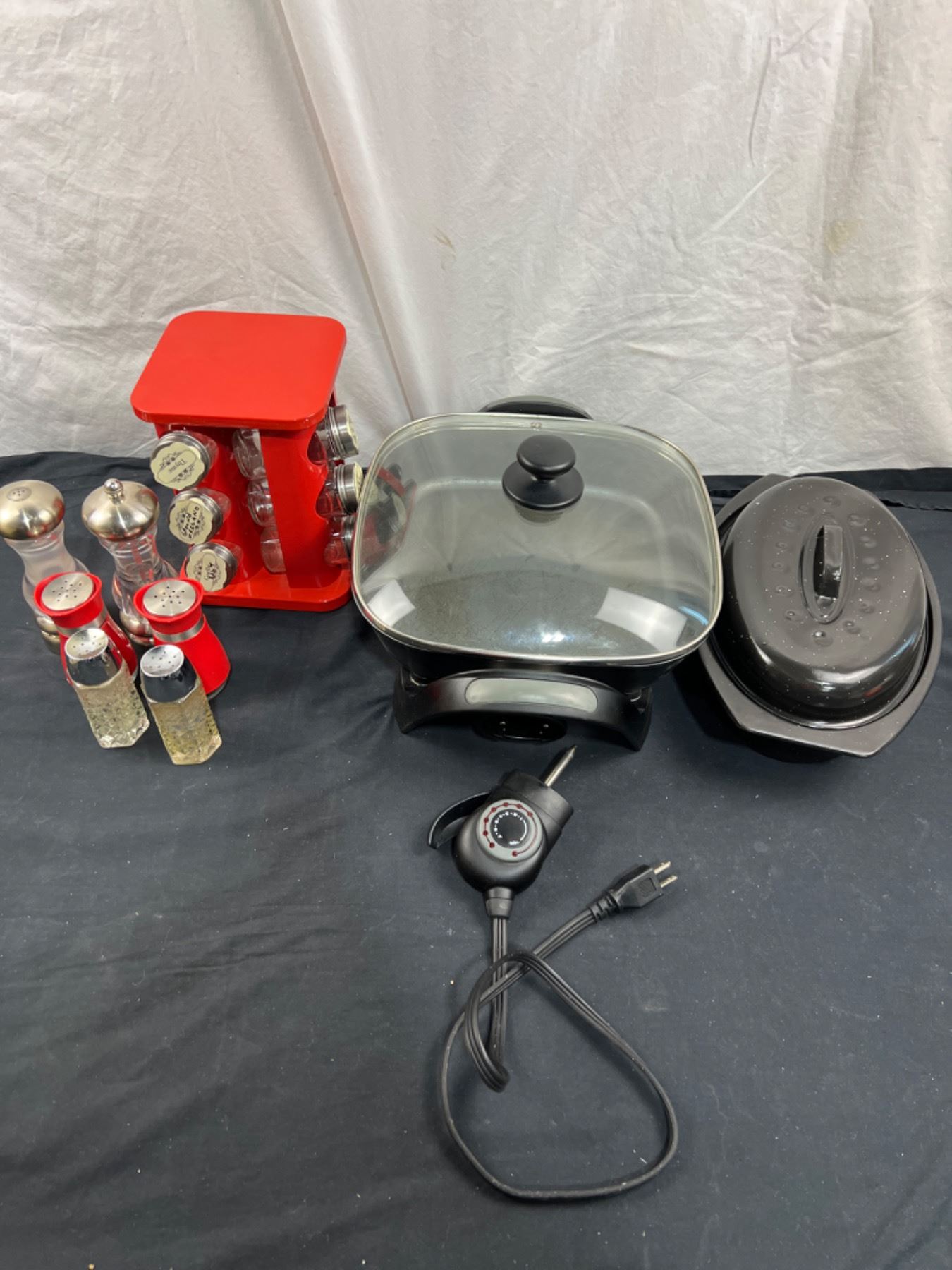 Includes Spice Rack, Salt & Pepper Shakers, Small Roaster & Electric Frying Pan (Turns On)
