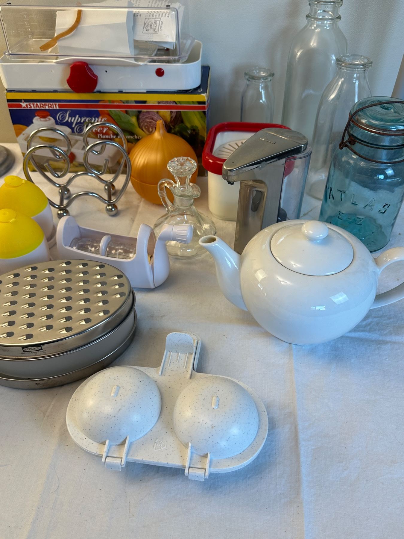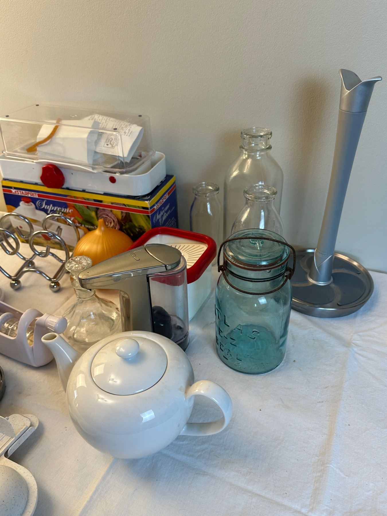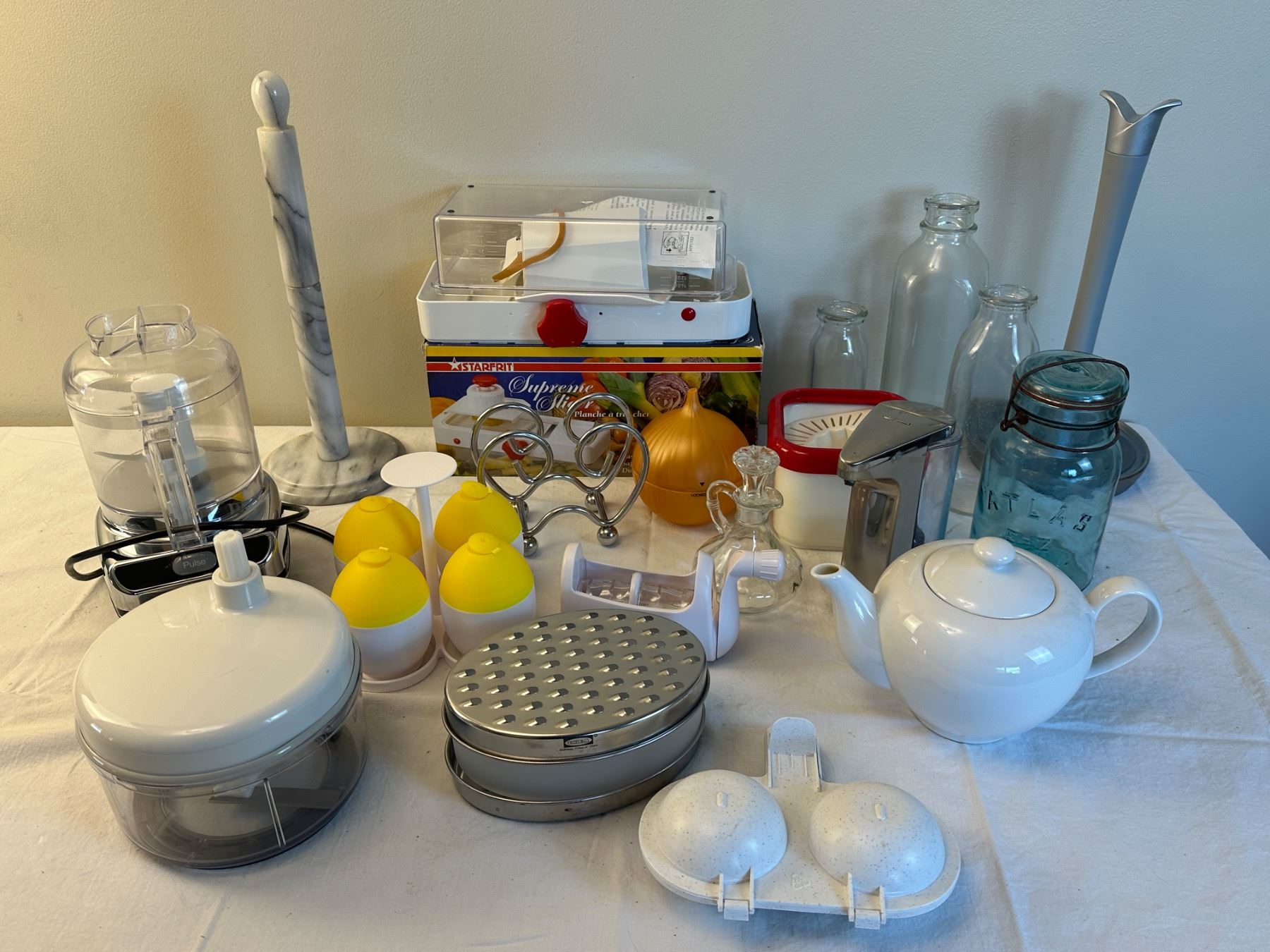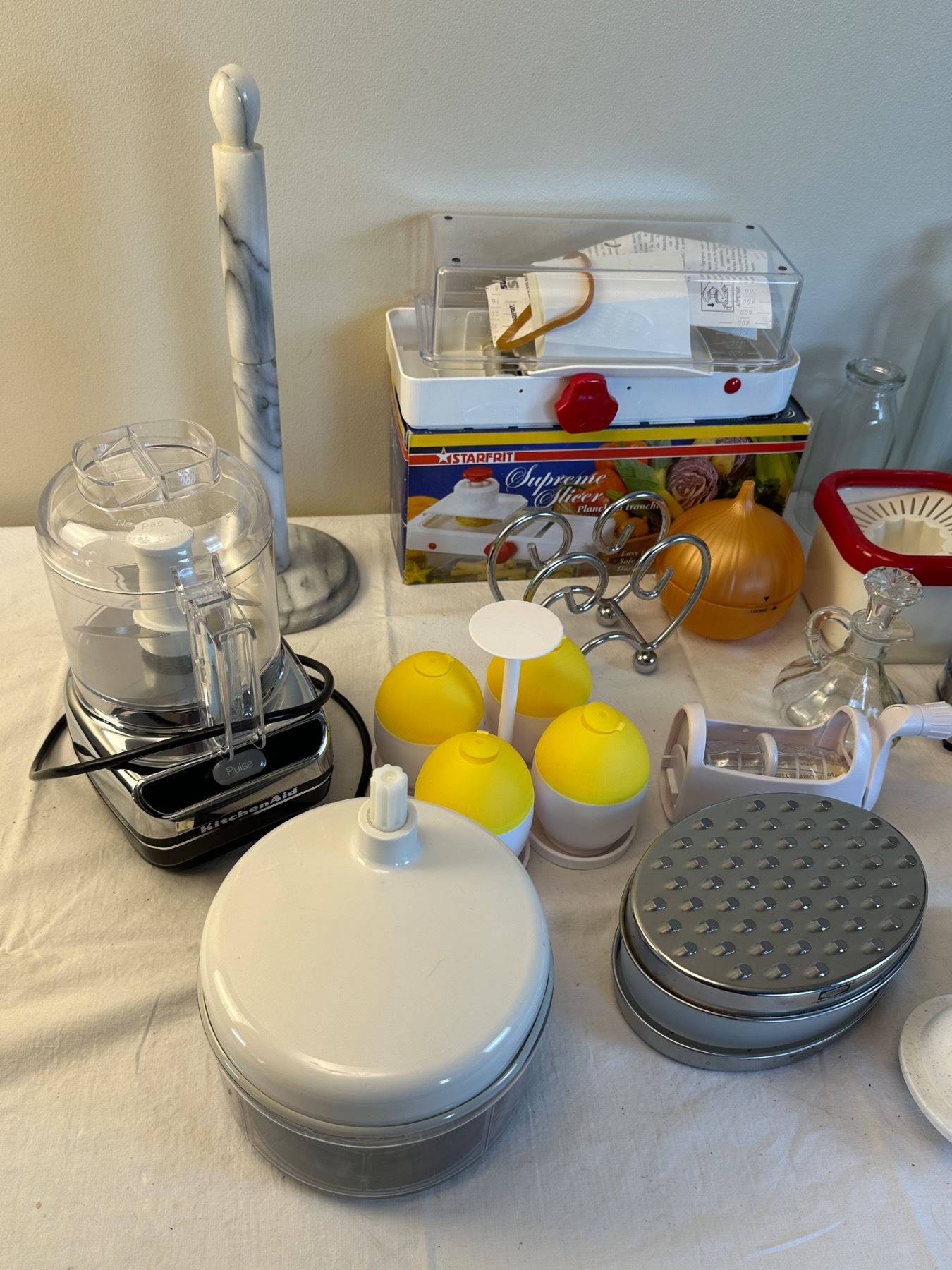 Includes KitchenAid Chef's Chopper (works), cheese graters, supreme slicer, paper towel holders, etc