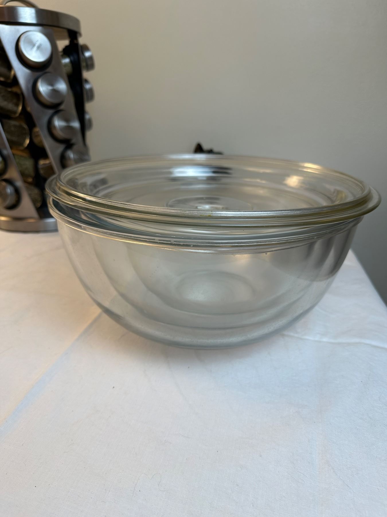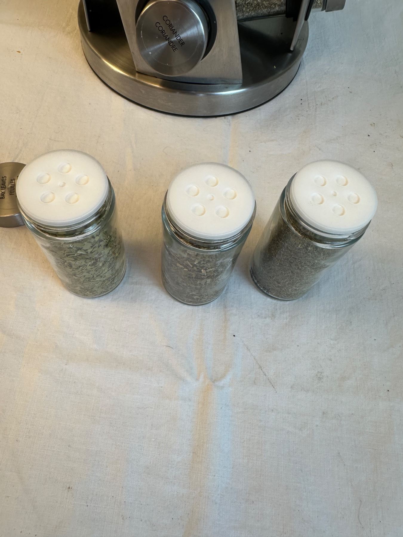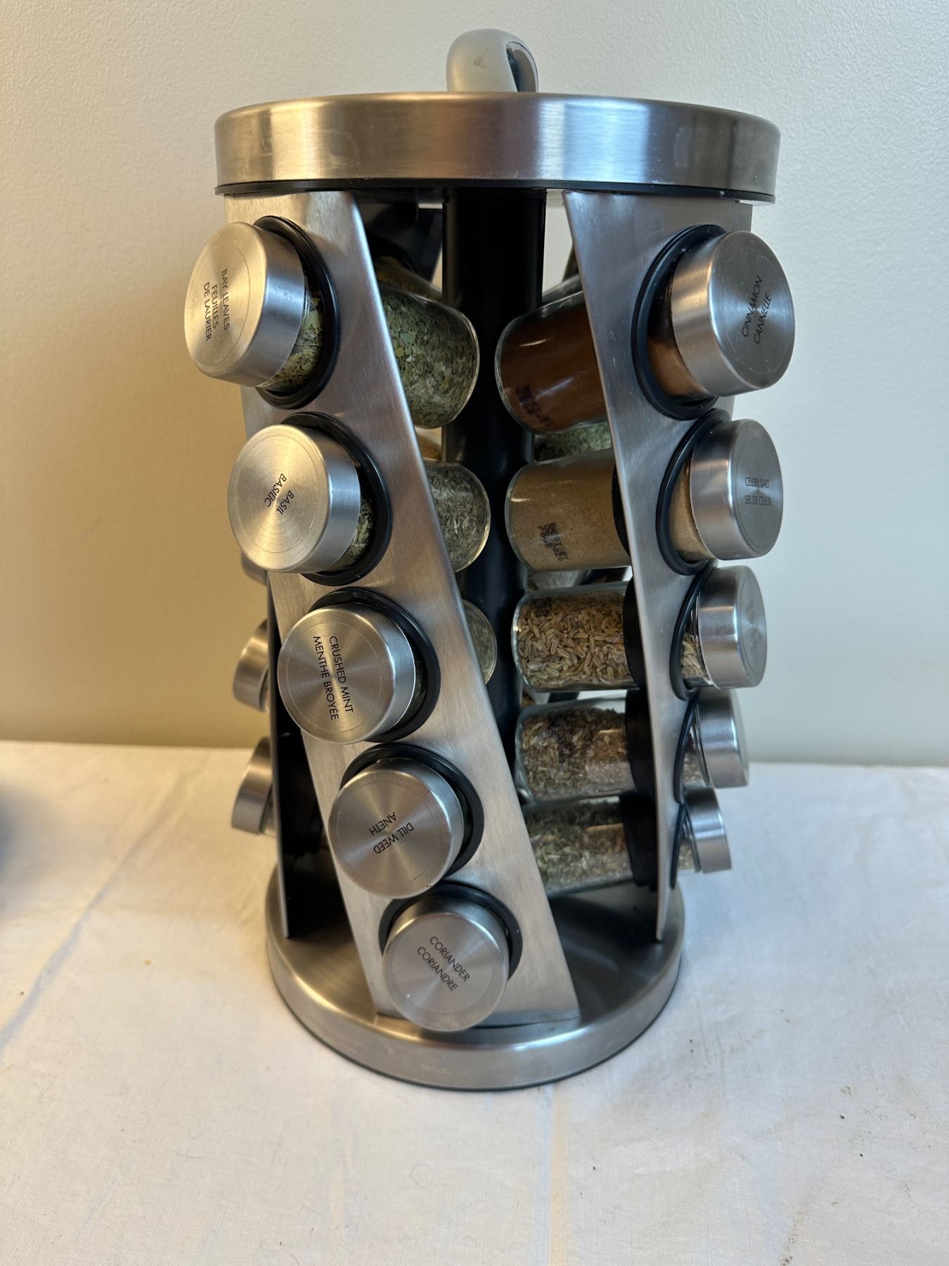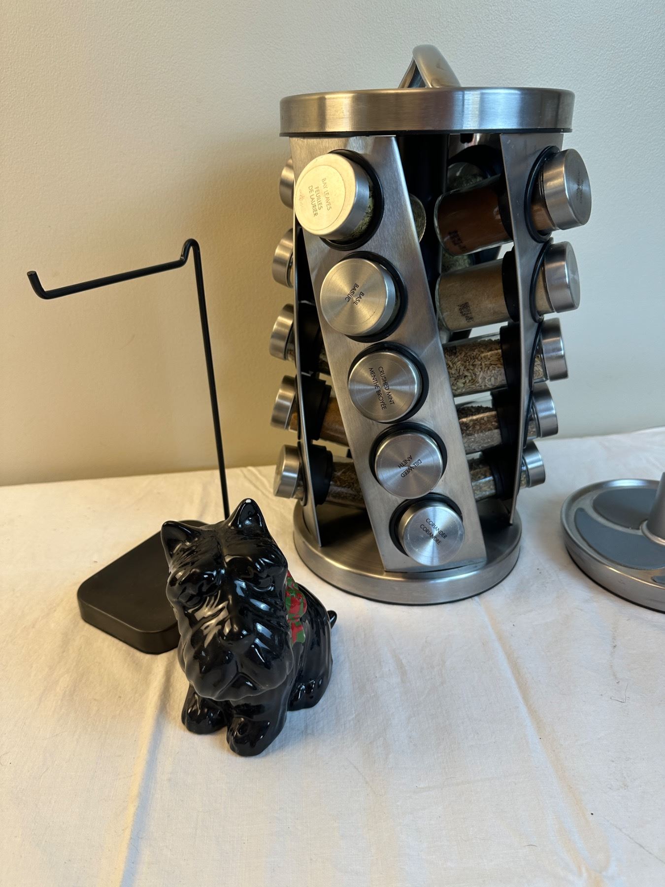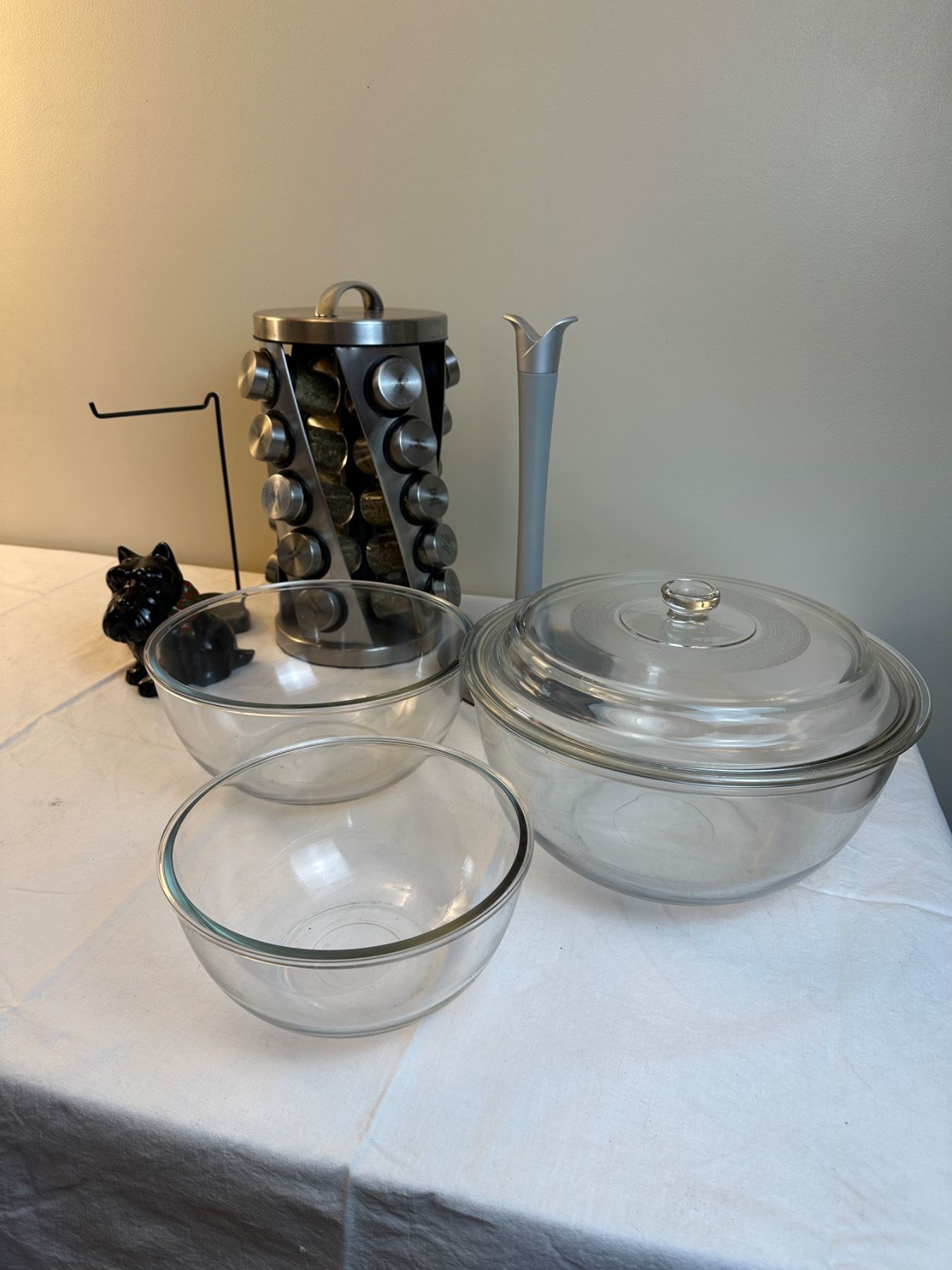Includes unopened spice rack, 3 glass bowls, paper towel holder, etc