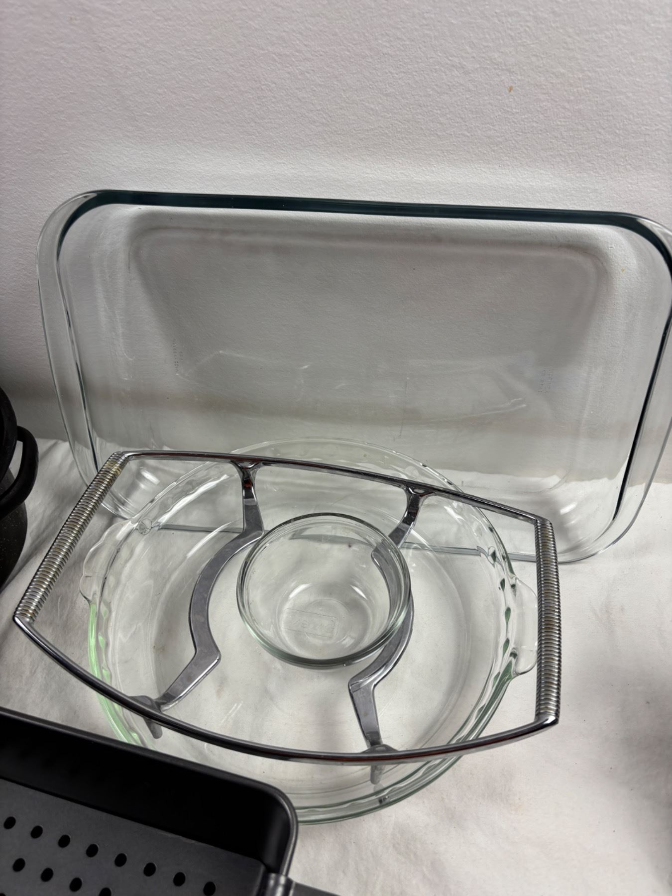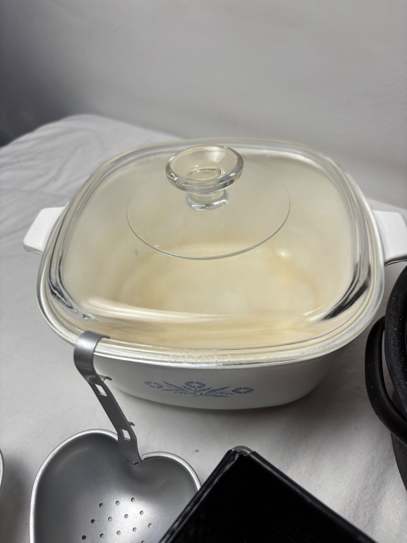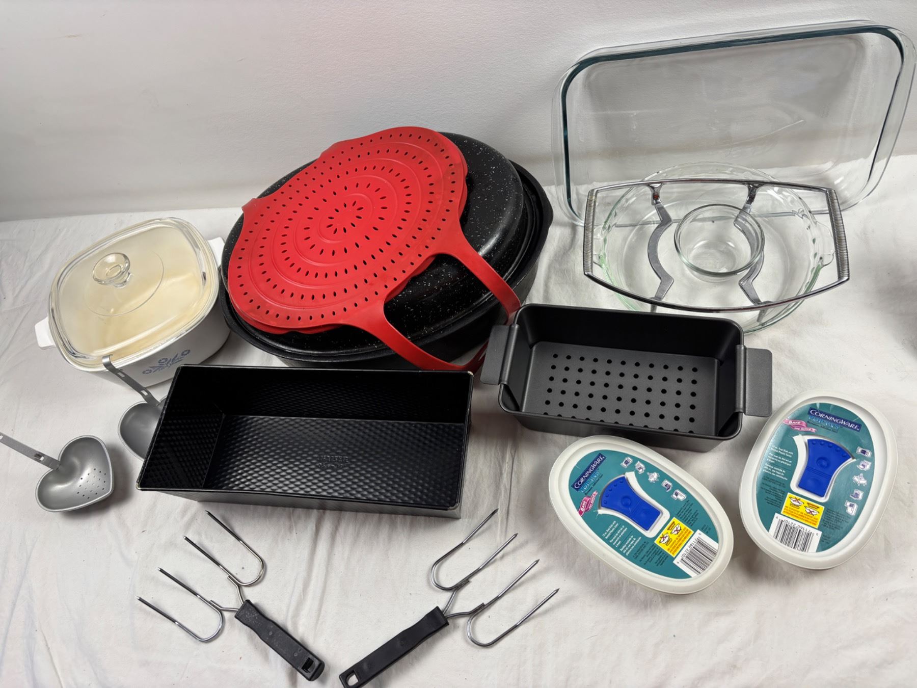Includes a 16" Graniteware roaster, Corningware Pop Ins, Pyrex pie dish, and more