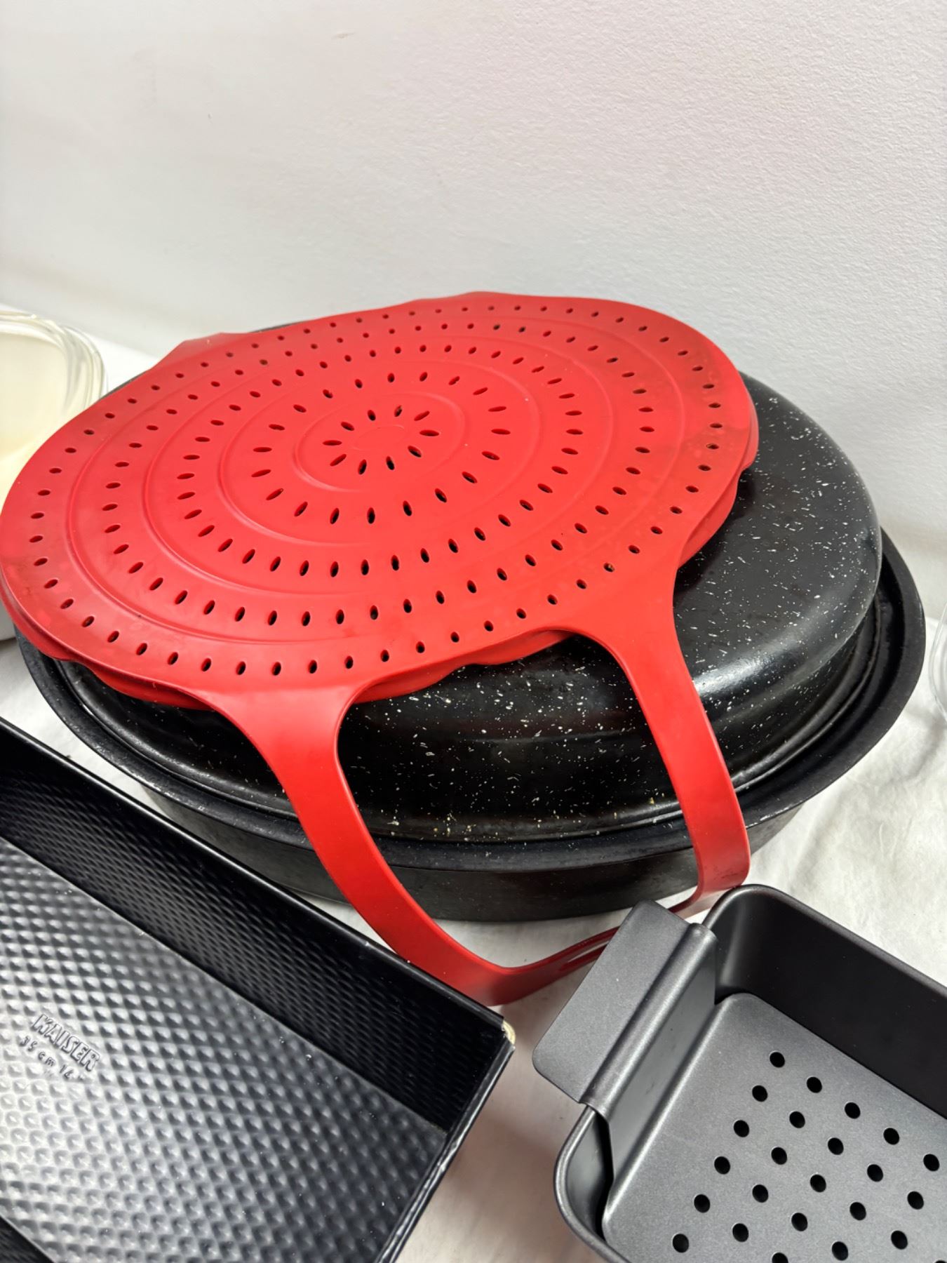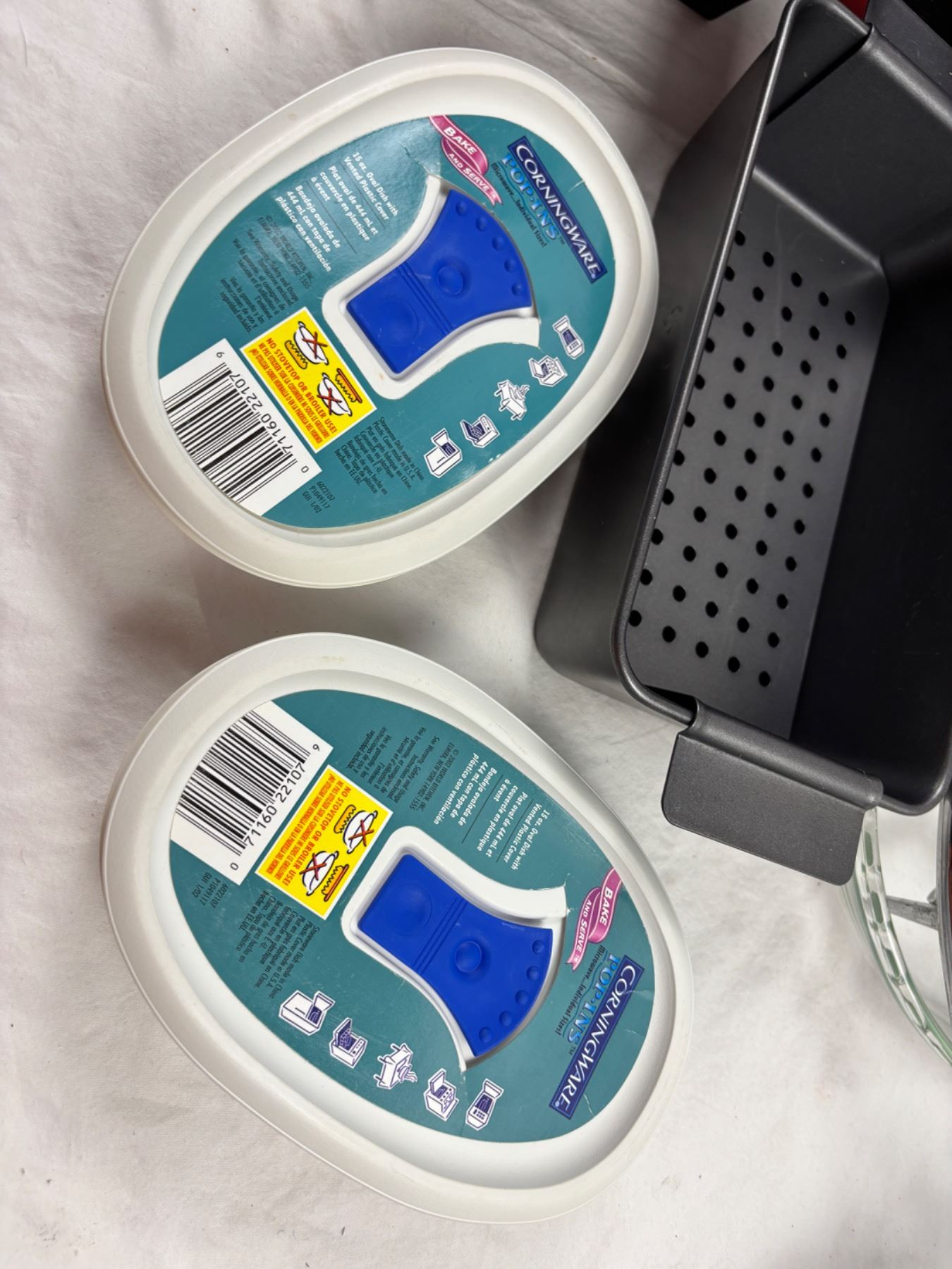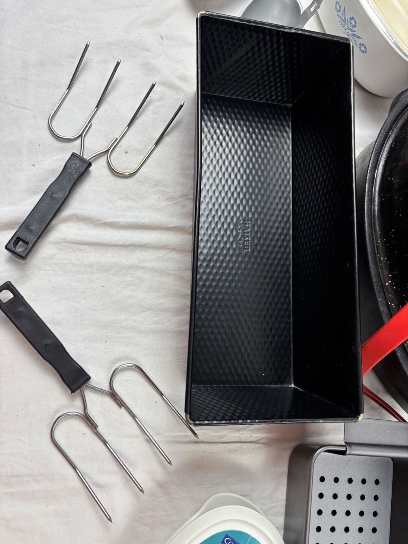 Includes a 16" Graniteware roaster, Corningware Pop Ins, Pyrex pie dish, and more