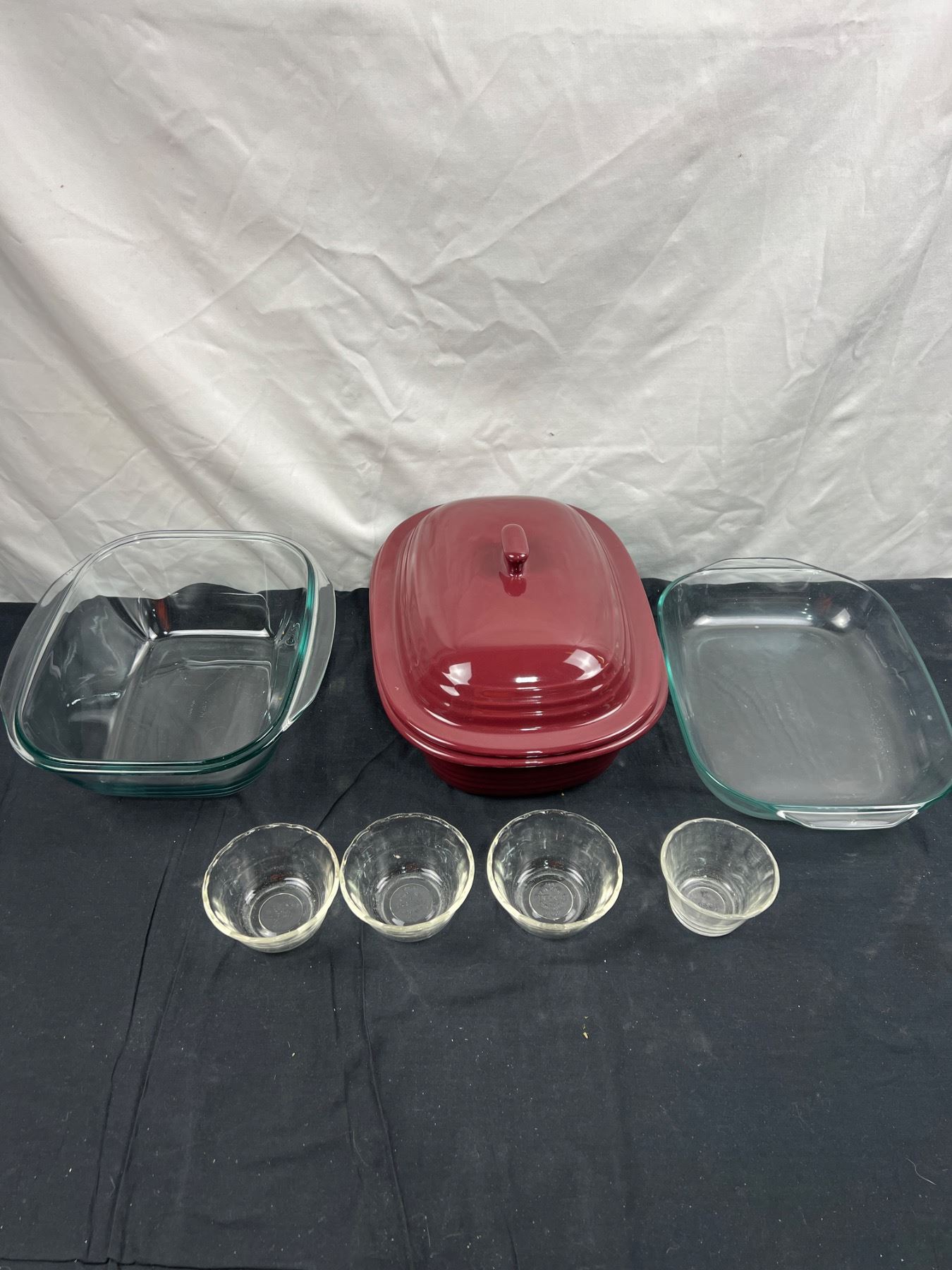 Includes a 3L Pampered Chef dish, two pyrex dishes, and four fire king bowls