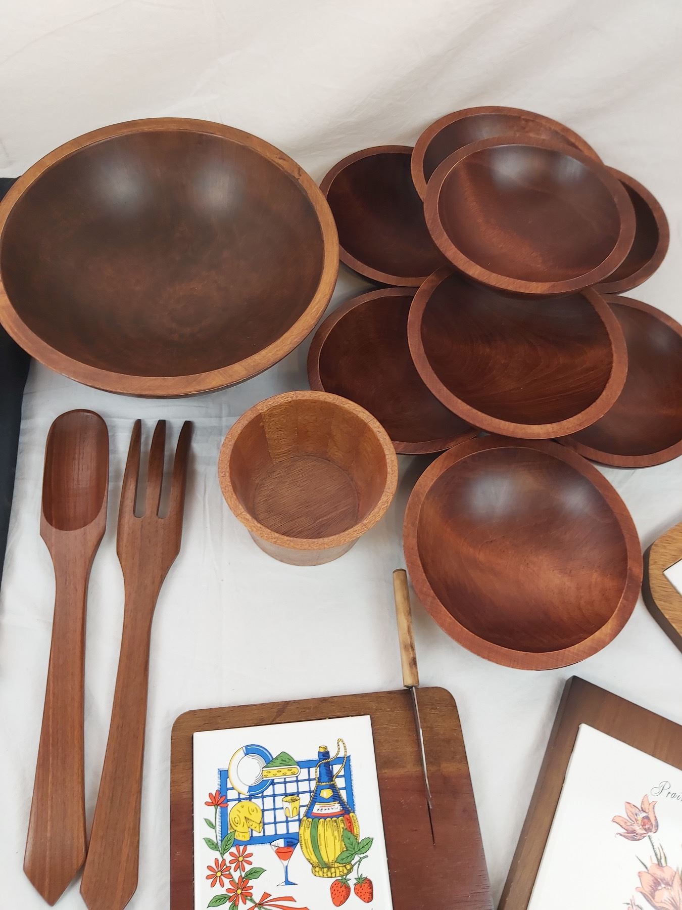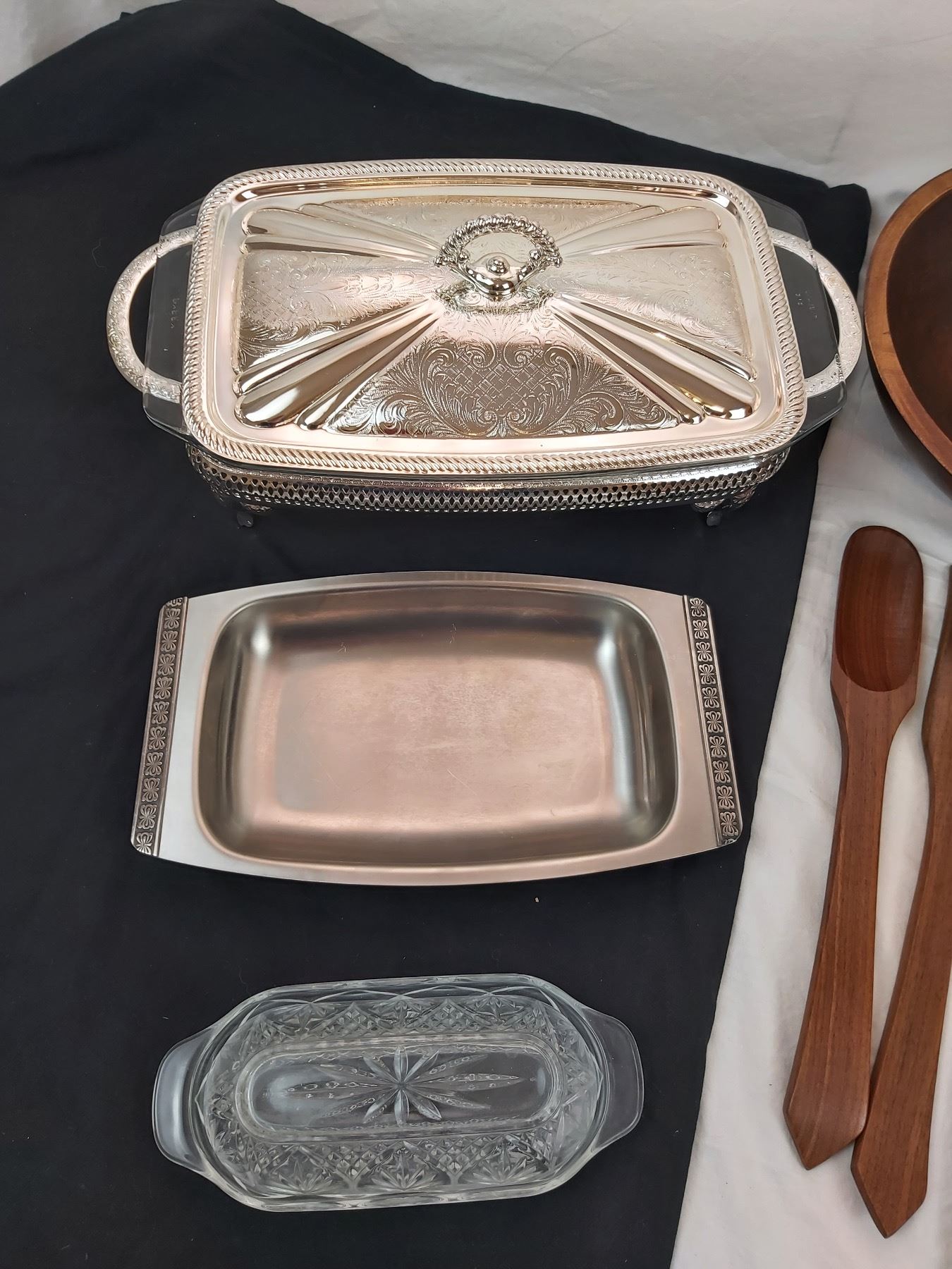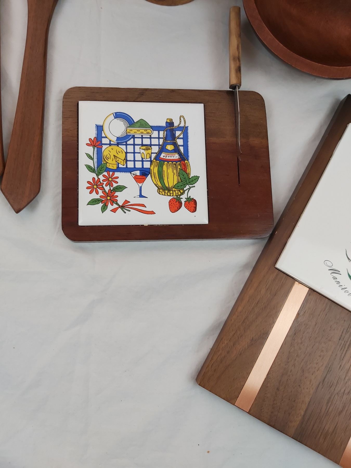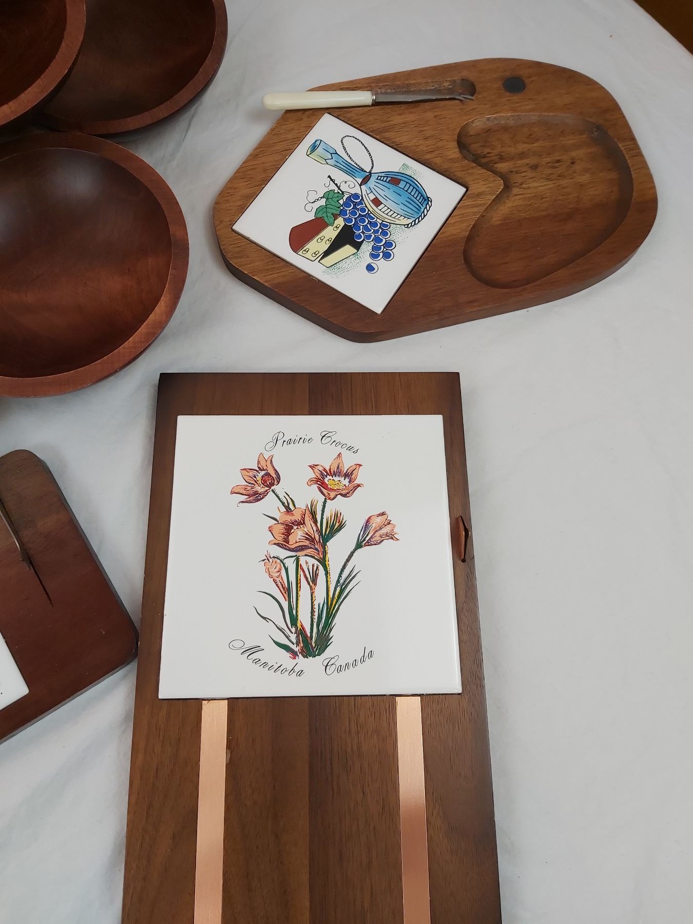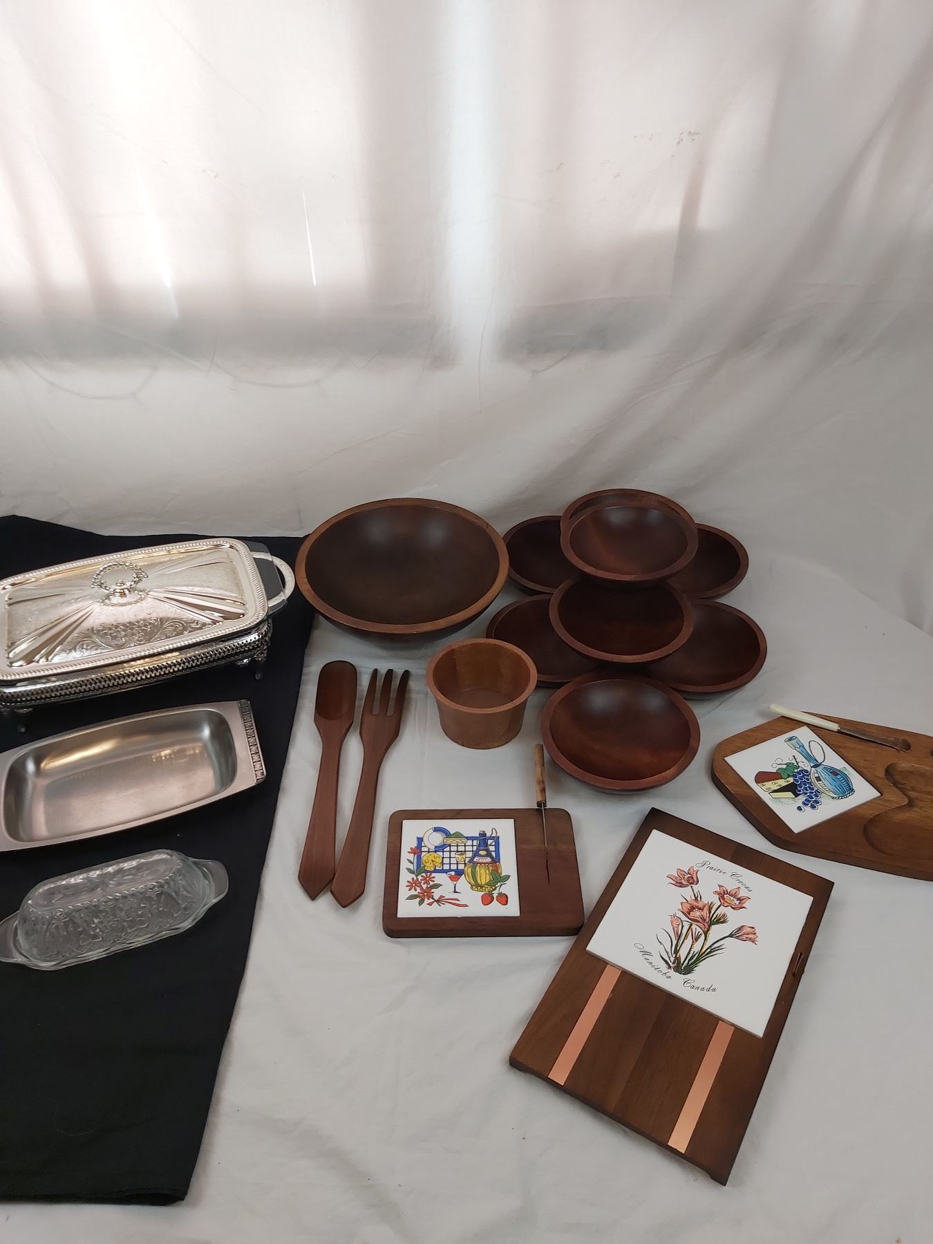 Includes a variety of wooden dishes, cheese boards, and a silver like server