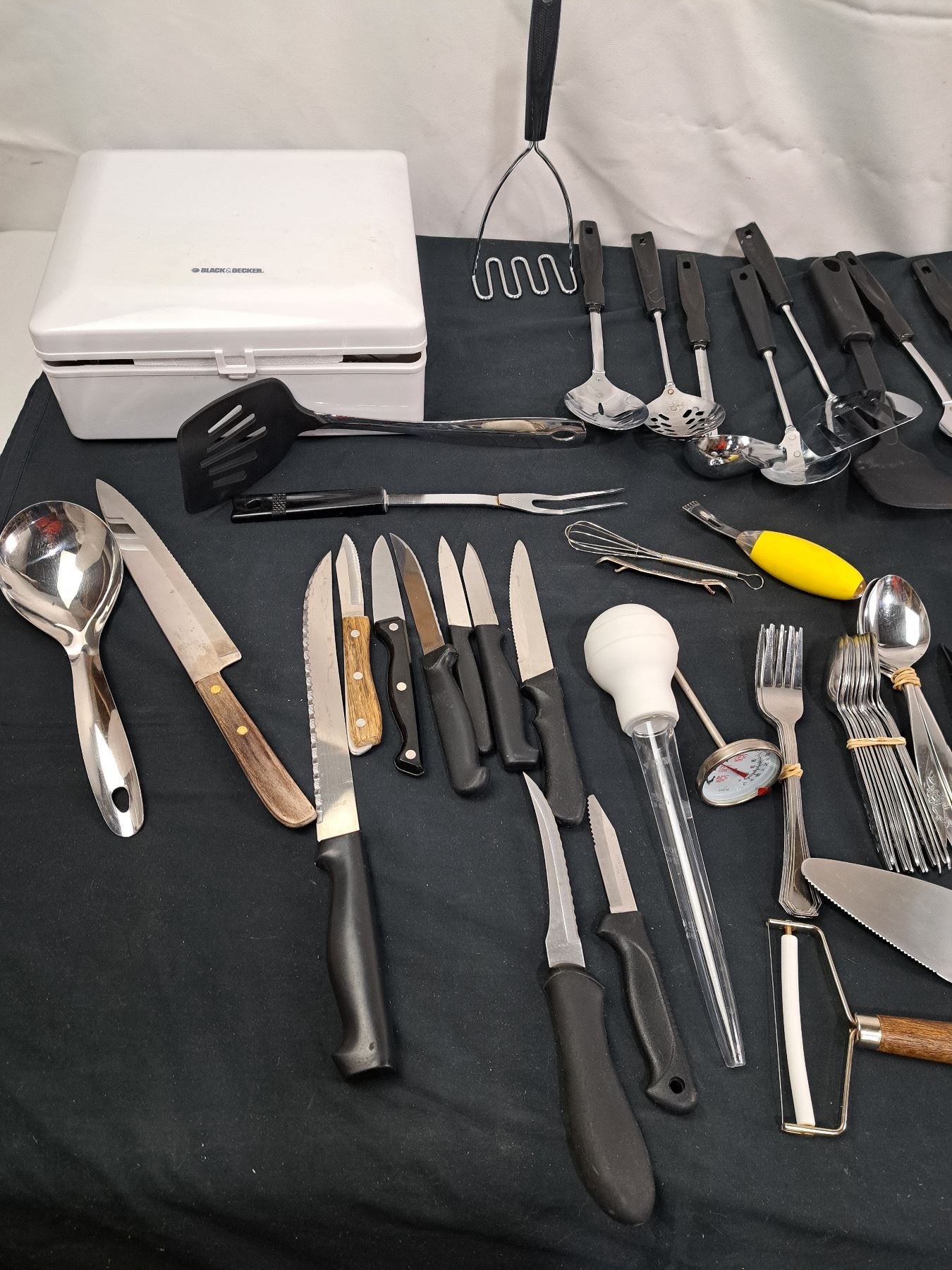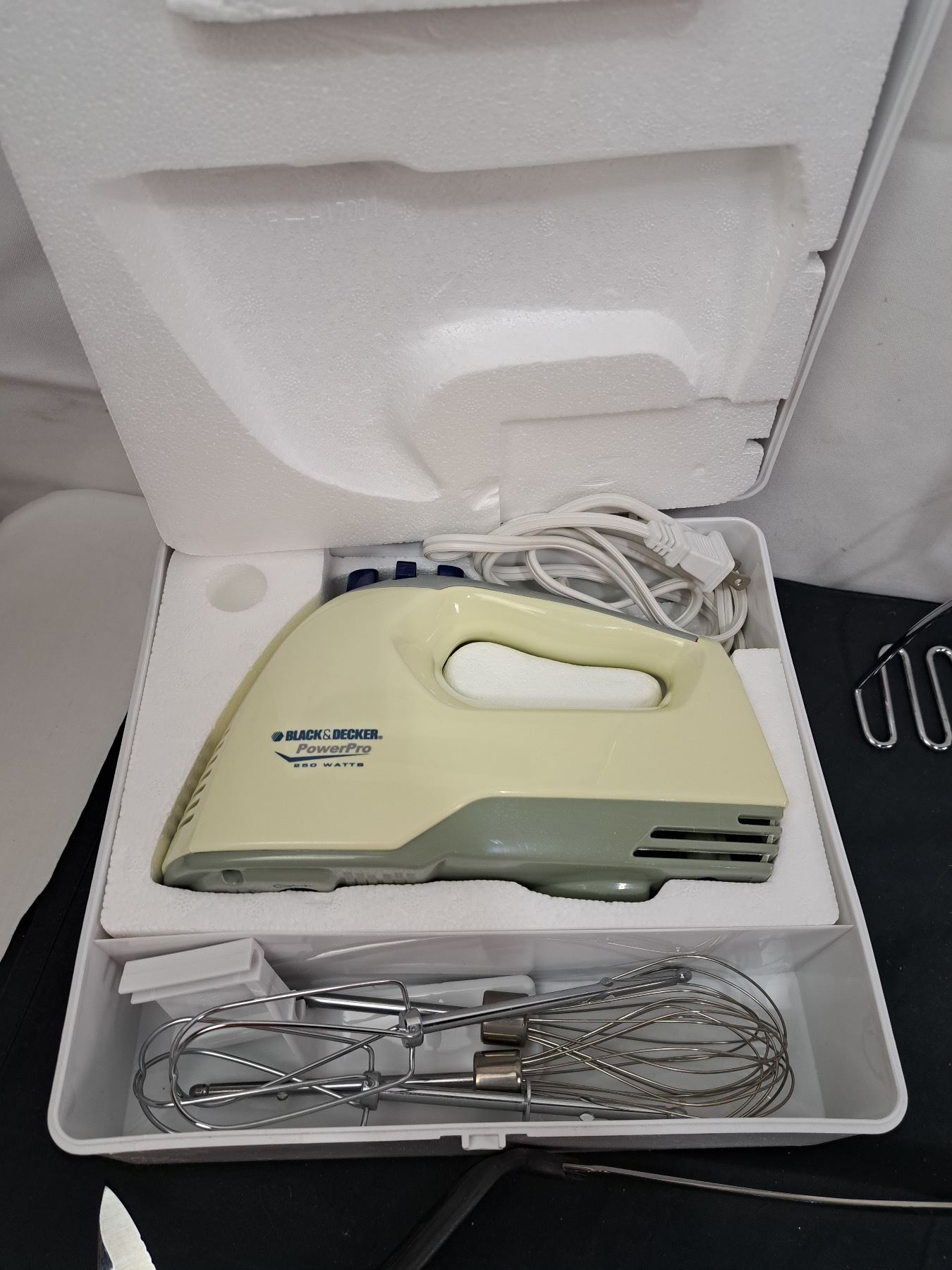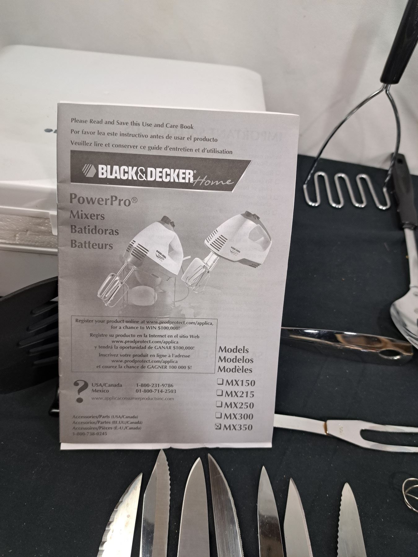 Includes, Black & Decker Power Pro Electric Hand Mixer (works), Braun Coffee Grinder (works), SILEA, assorted utensils, etc.
