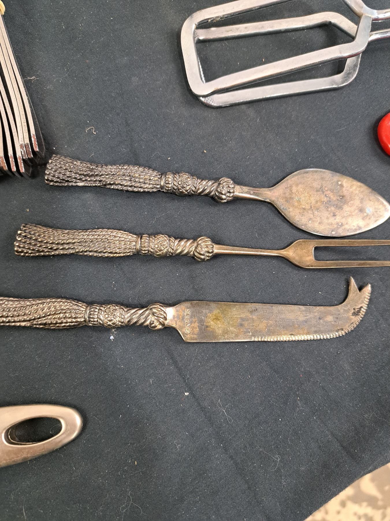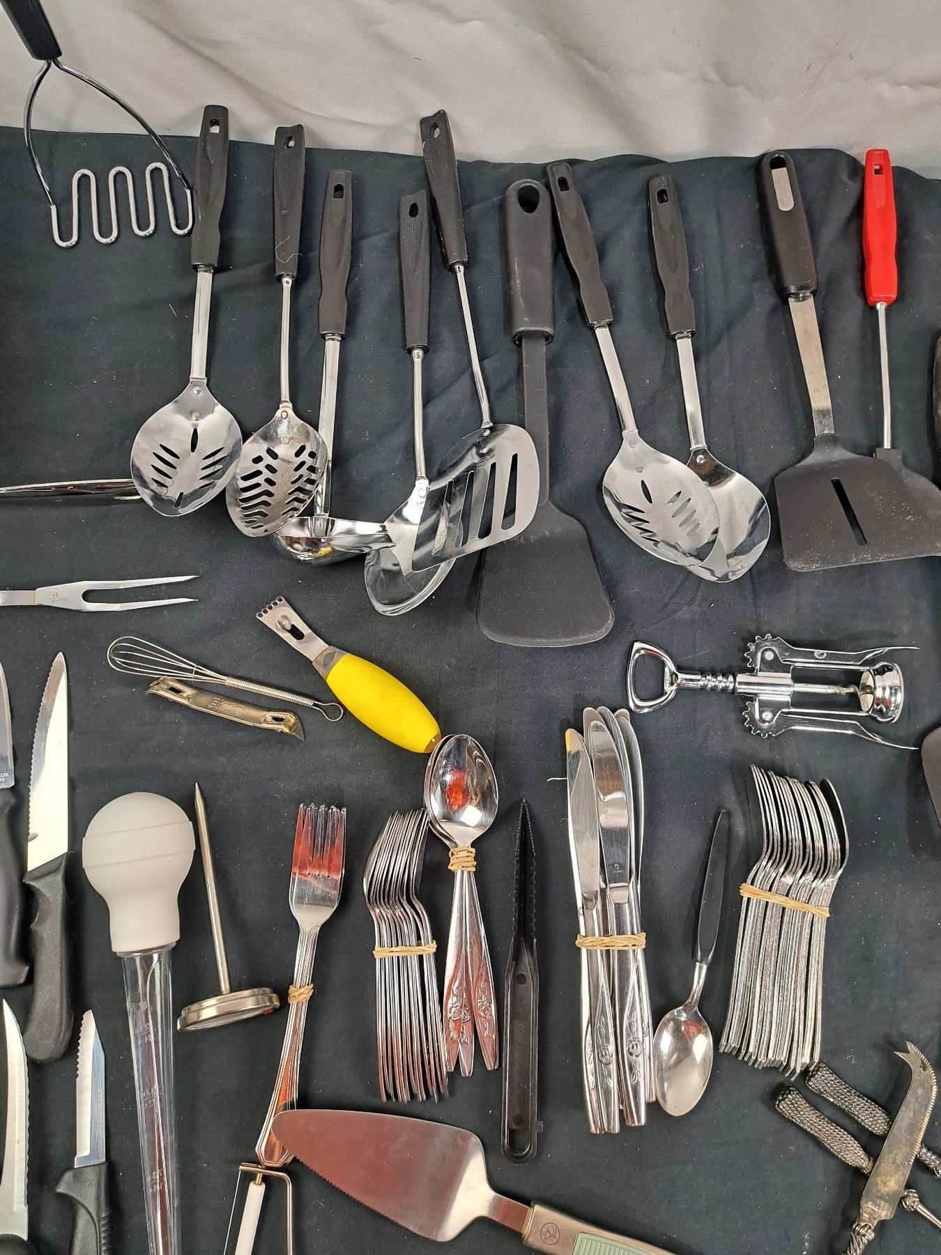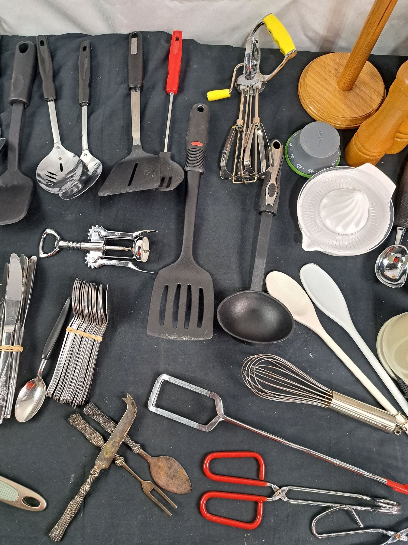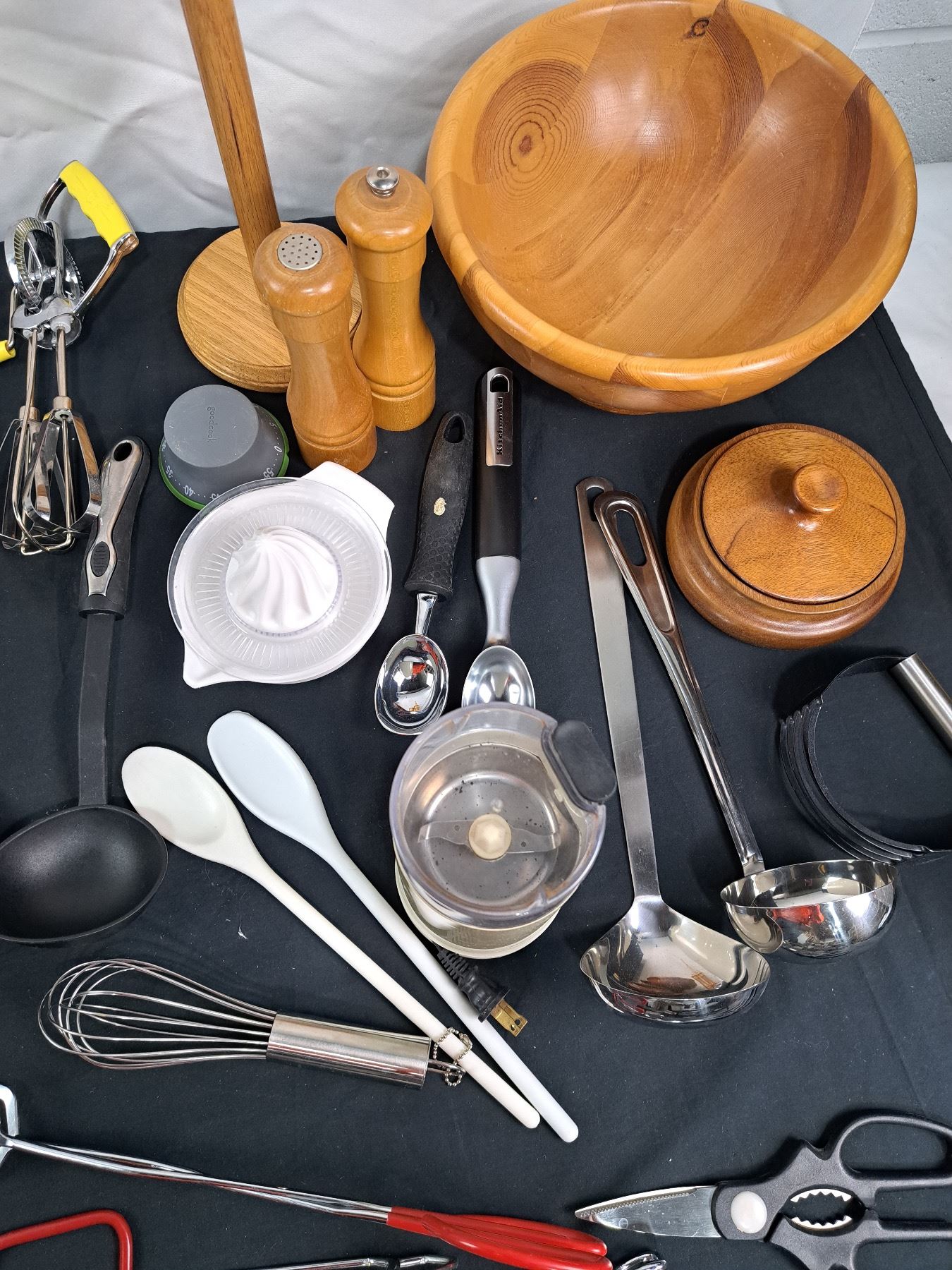 Includes, Black & Decker Power Pro Electric Hand Mixer (works), Braun Coffee Grinder (works), SILEA, assorted utensils, etc.