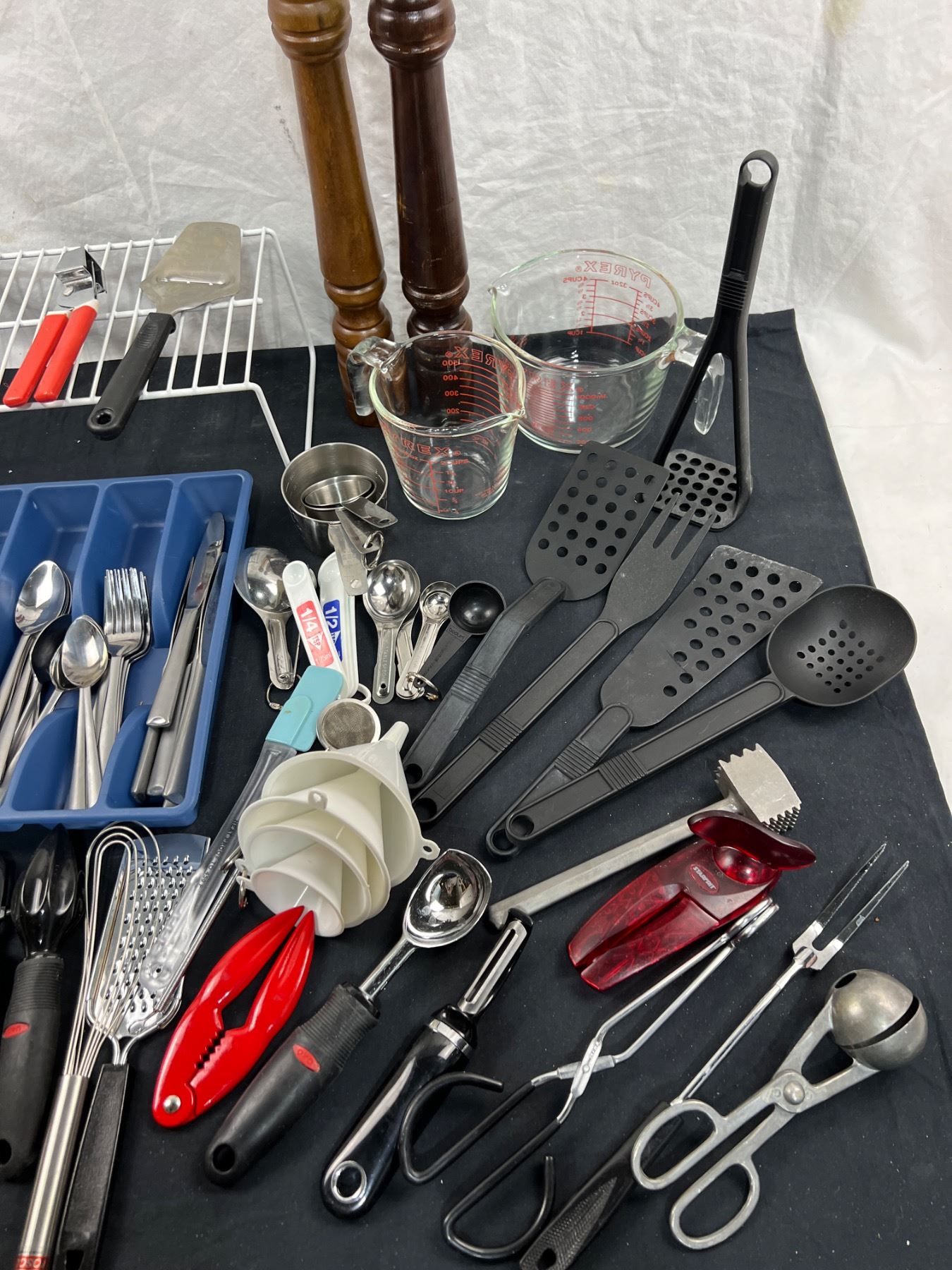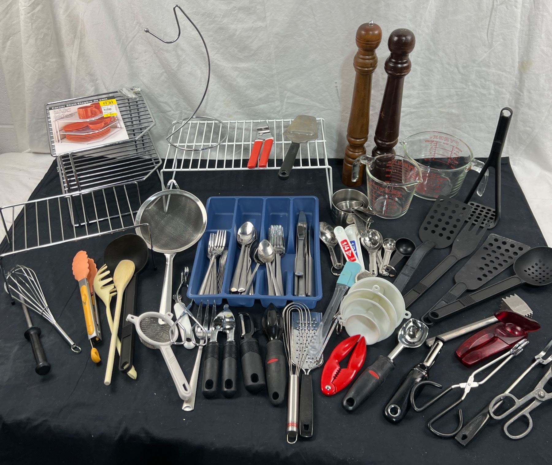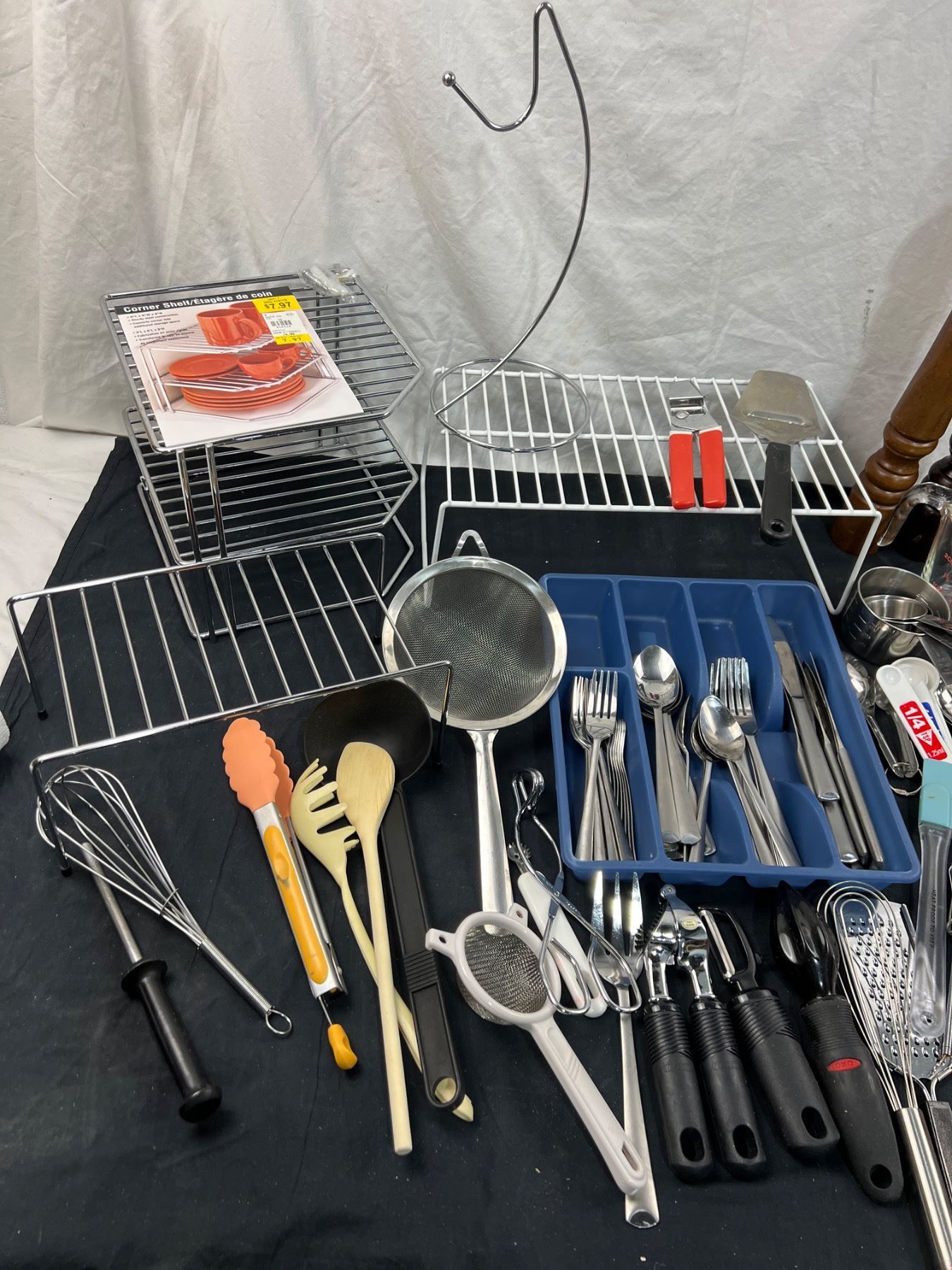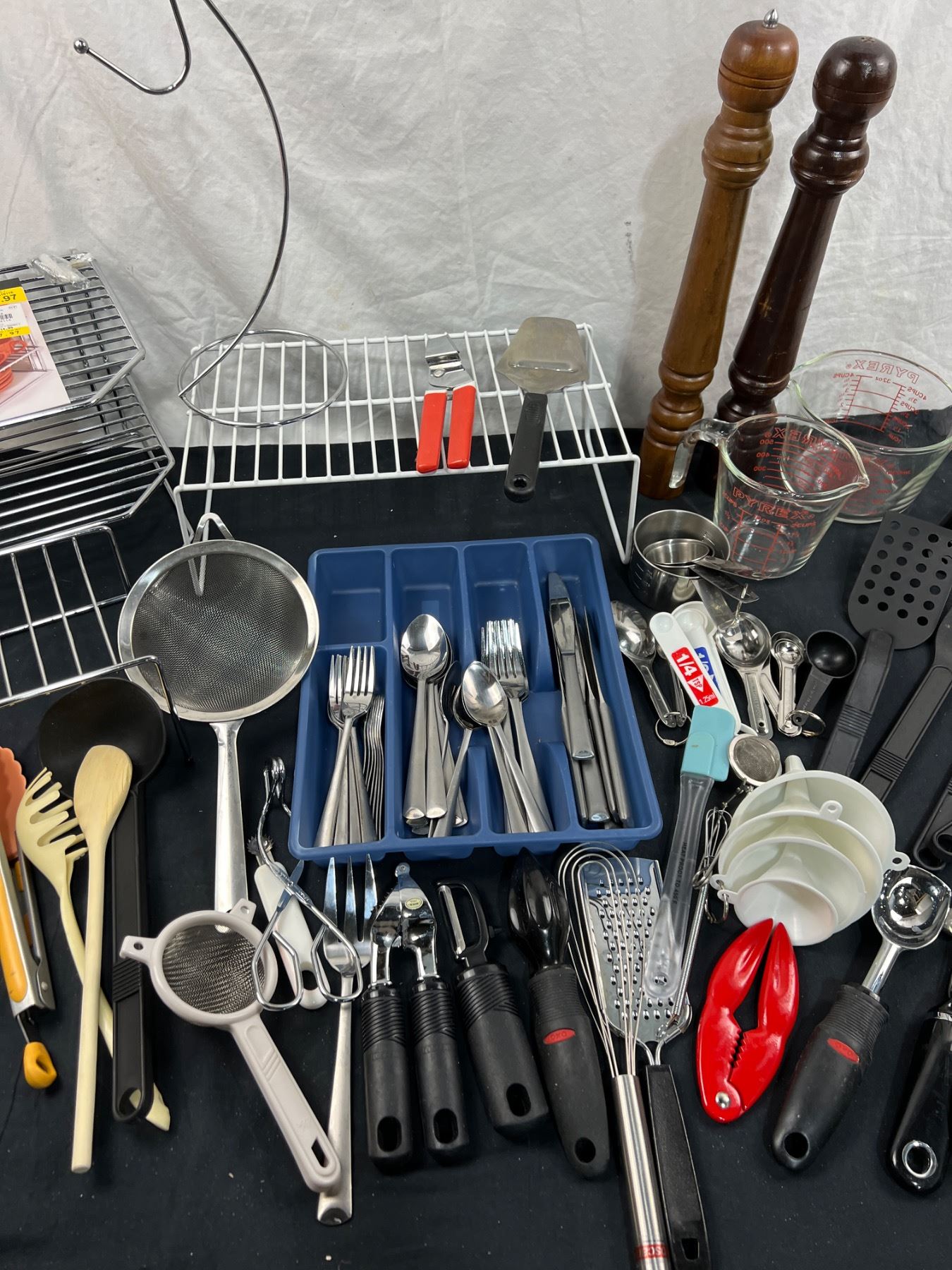 Includes, Pyrex measuring cups, shelf organizers, utensils, and more