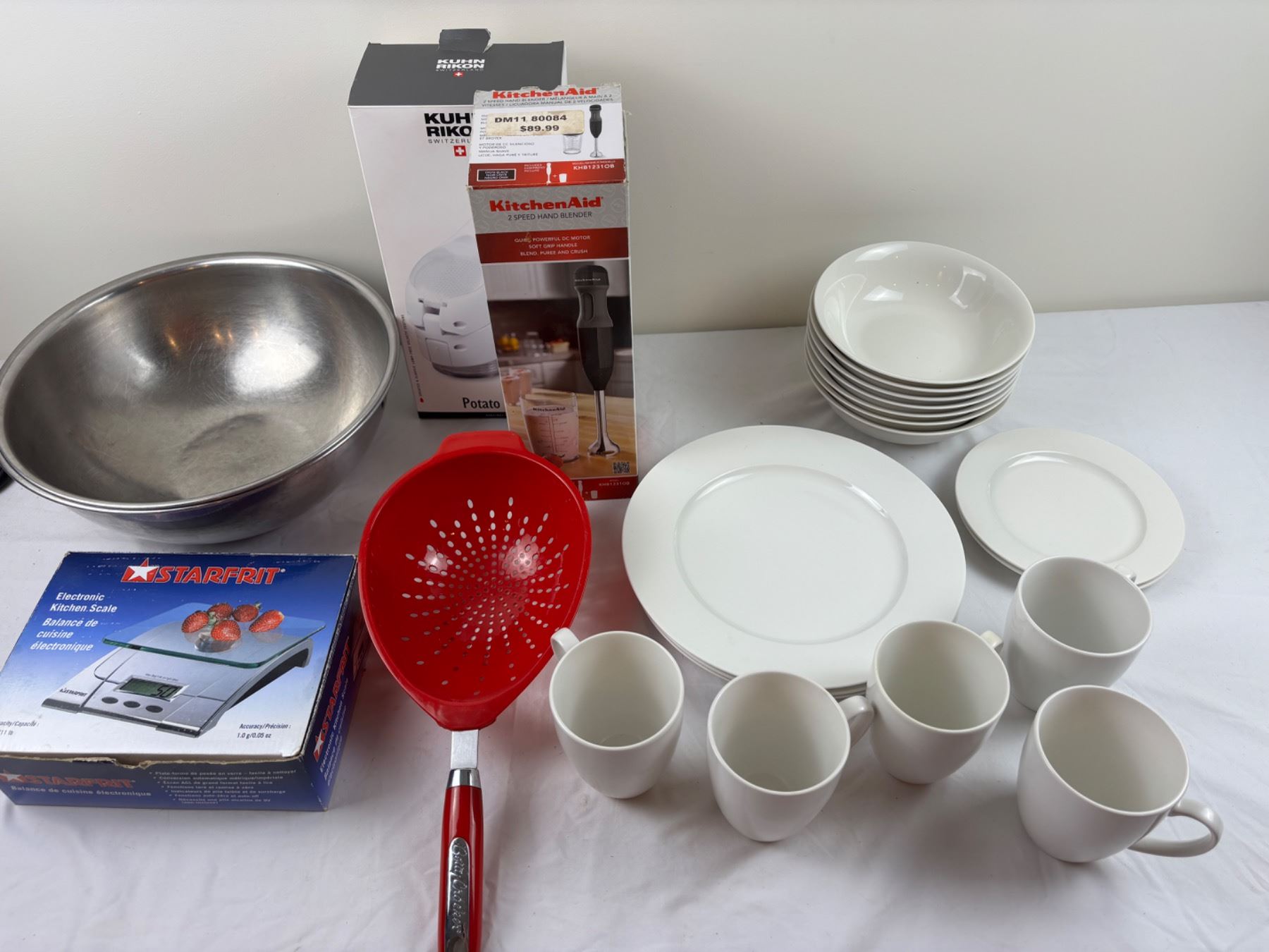 Includes, Kitchen Aid Hand Blender (works), Potato Ricer, Starfrit Scale, and more