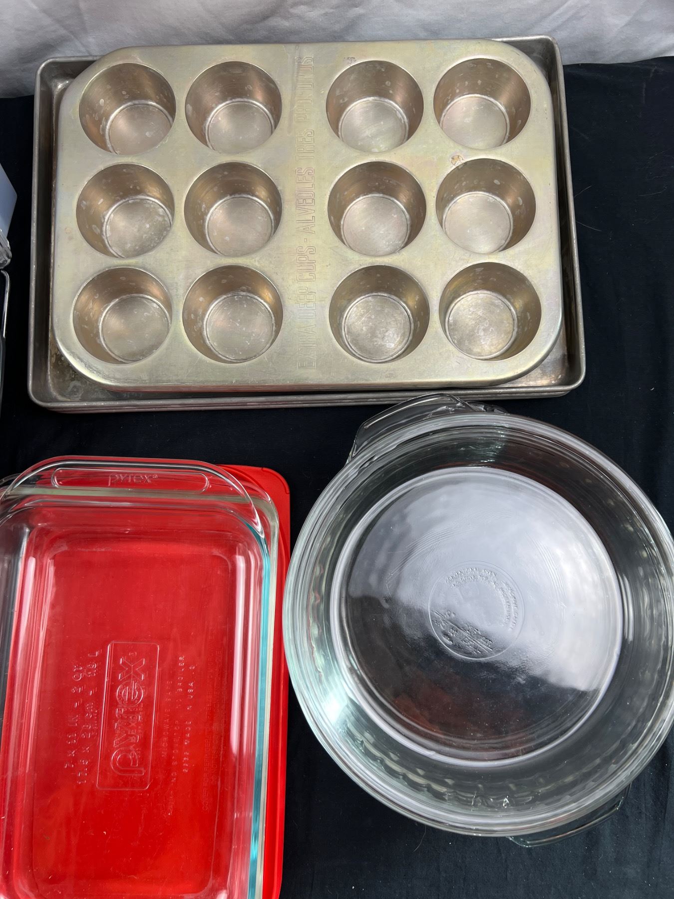 Includes, Cookie Press with Decorating Tips, Pyrex & Anchor pie dishes, Cookie cutters, and more,