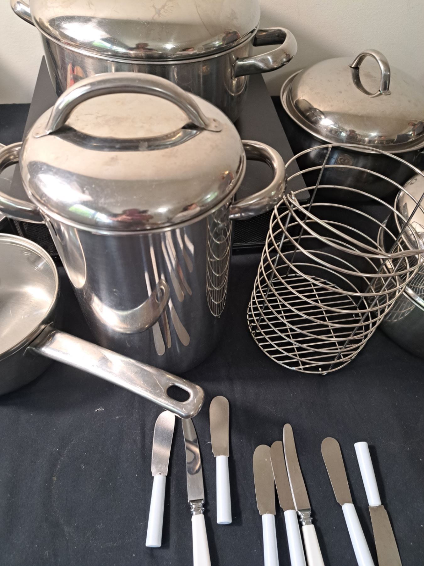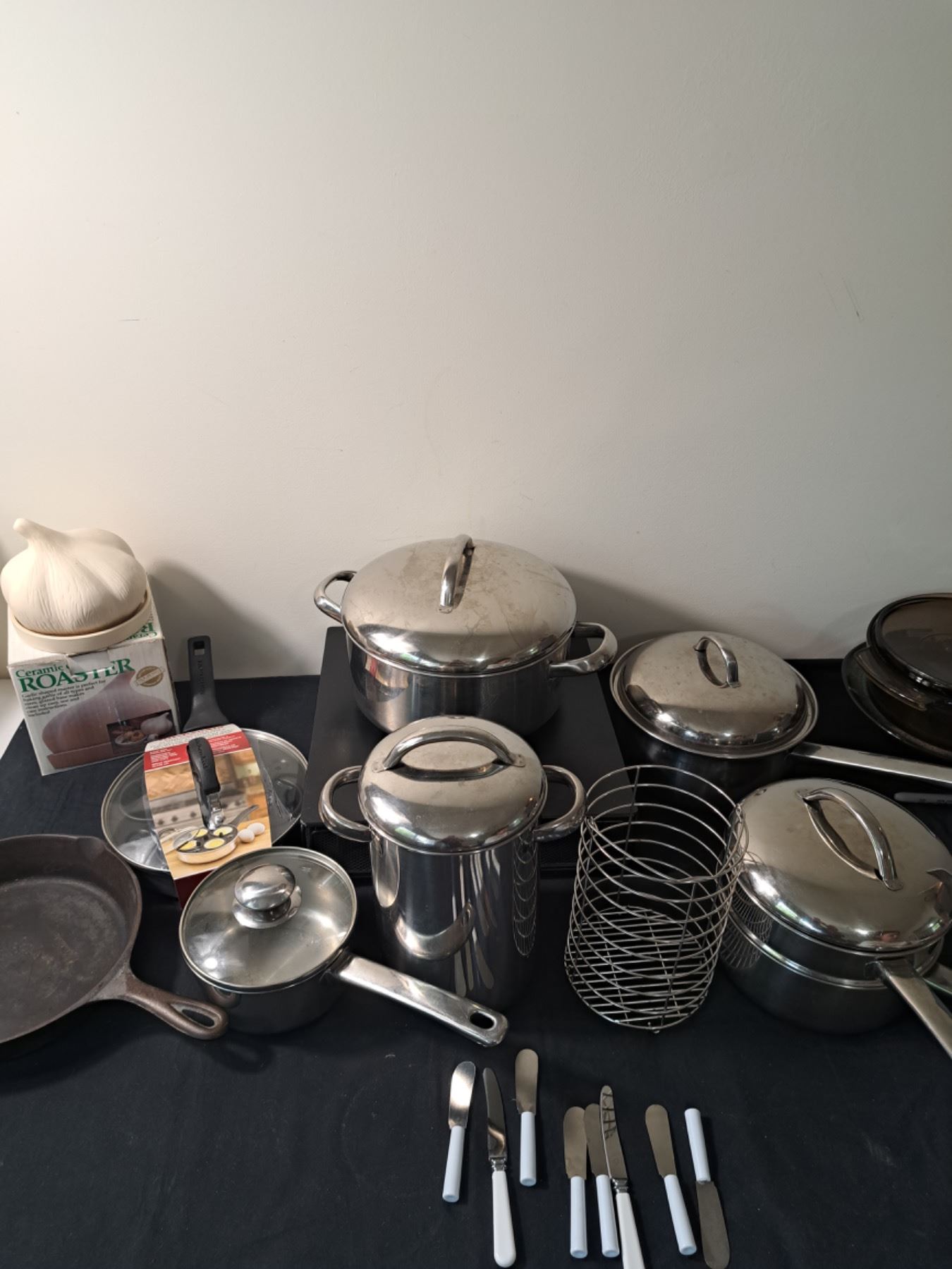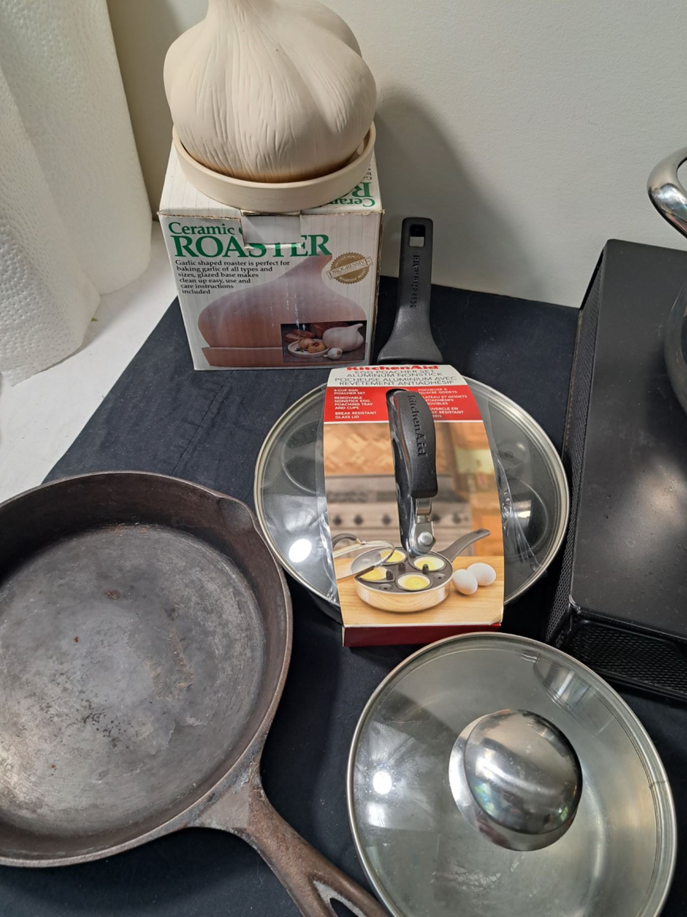 include egg poacher, cast iron, steamer, pasta pot, butter knifes