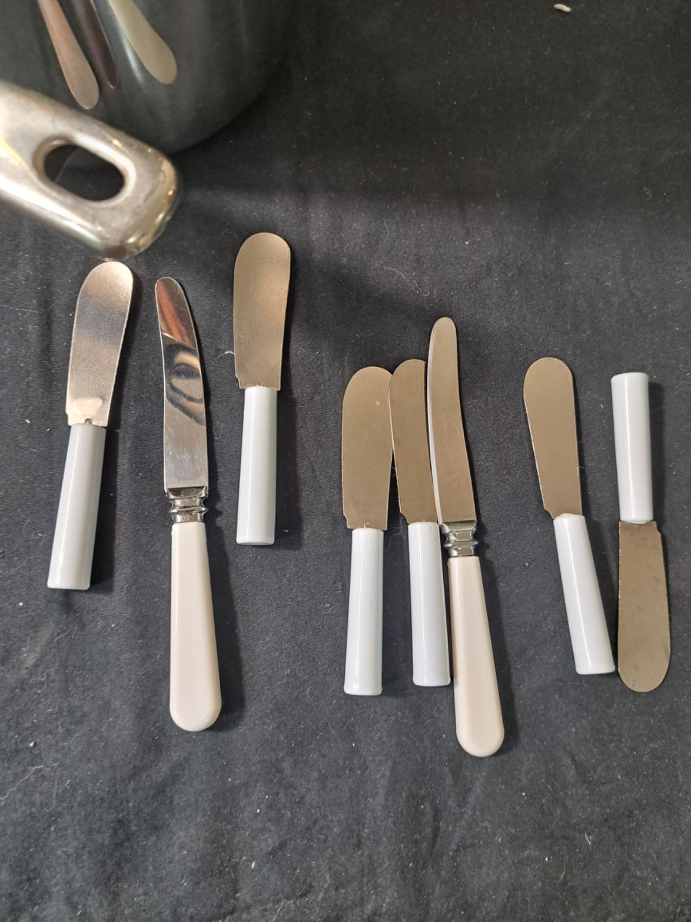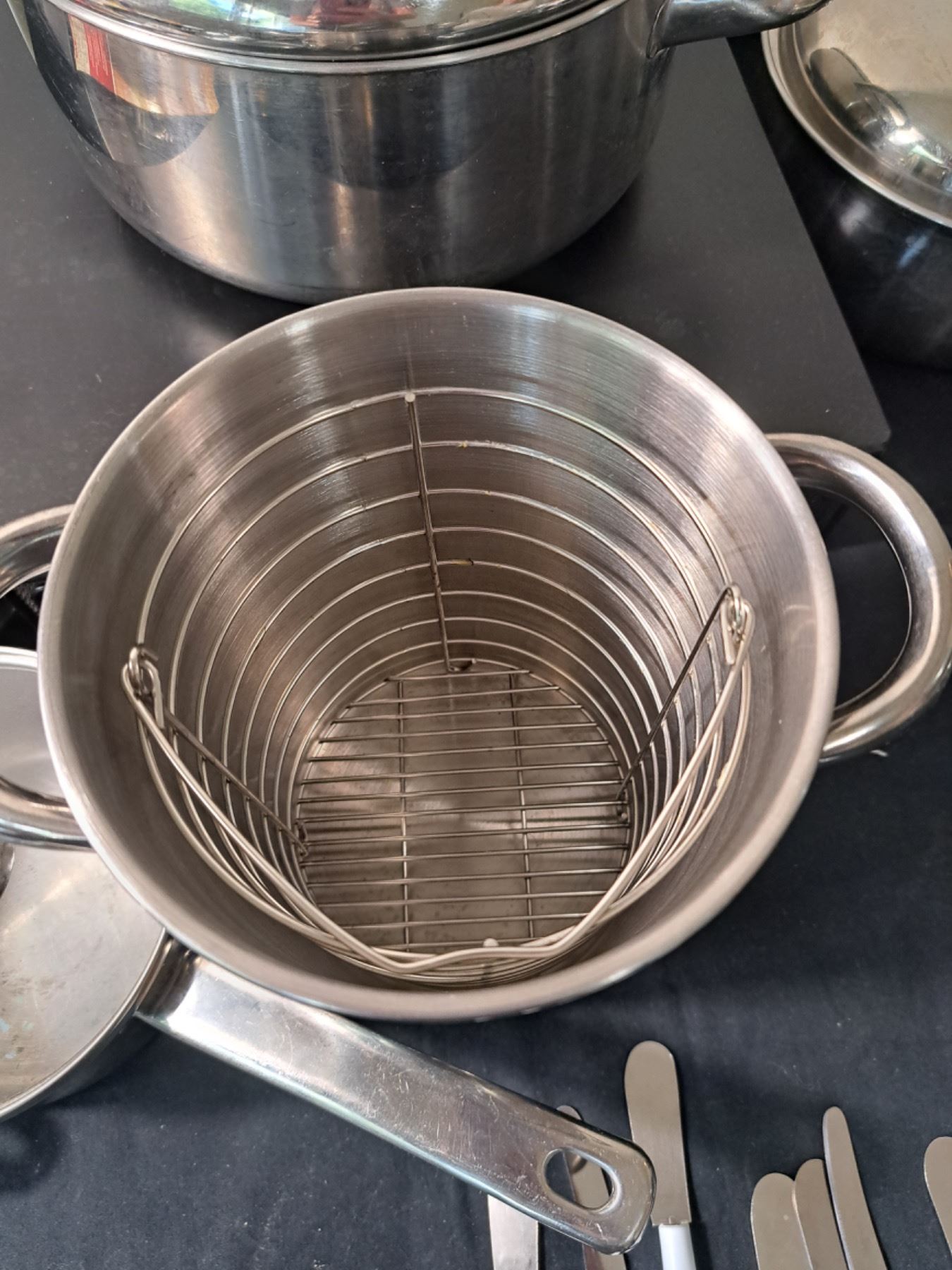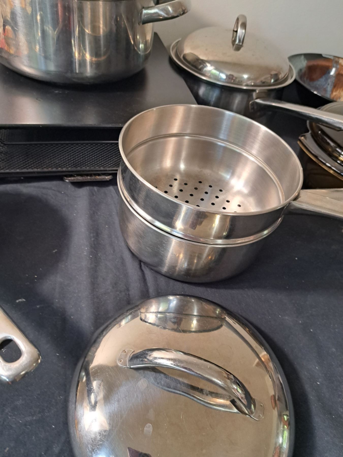 include egg poacher, cast iron, steamer, pasta pot, butter knifes