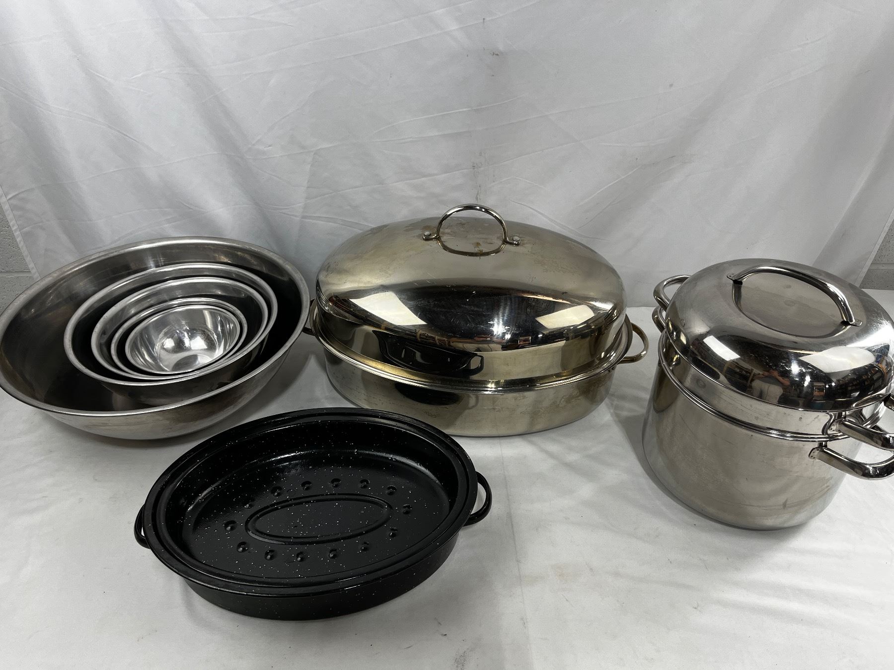 Includes 2 roasting pans, steamer pot, various mixing bowls, all in good used condition