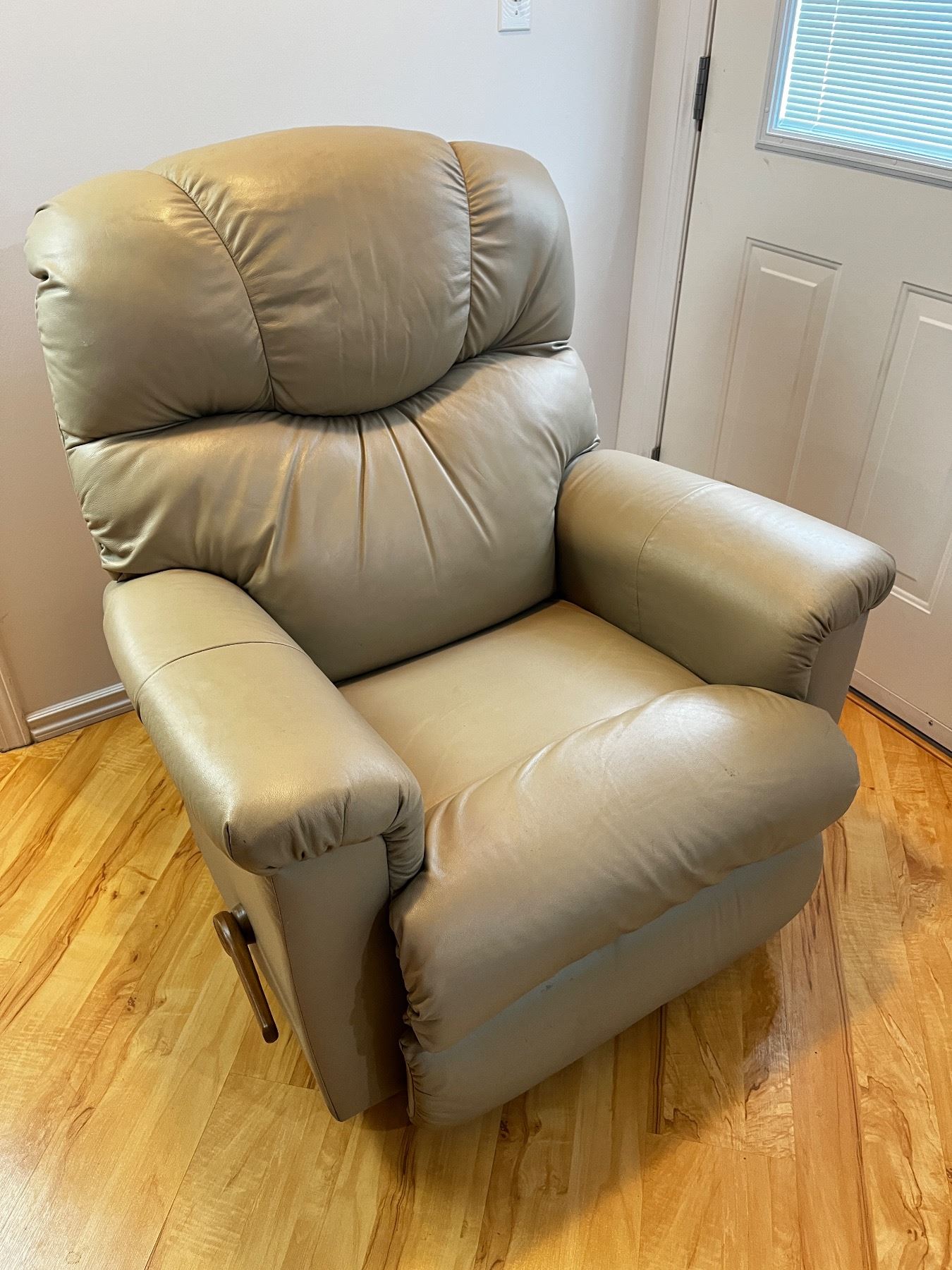 Taupe faux leather, has some small scuffs otherwise in good condition, 37"L x 31"D x 40H"