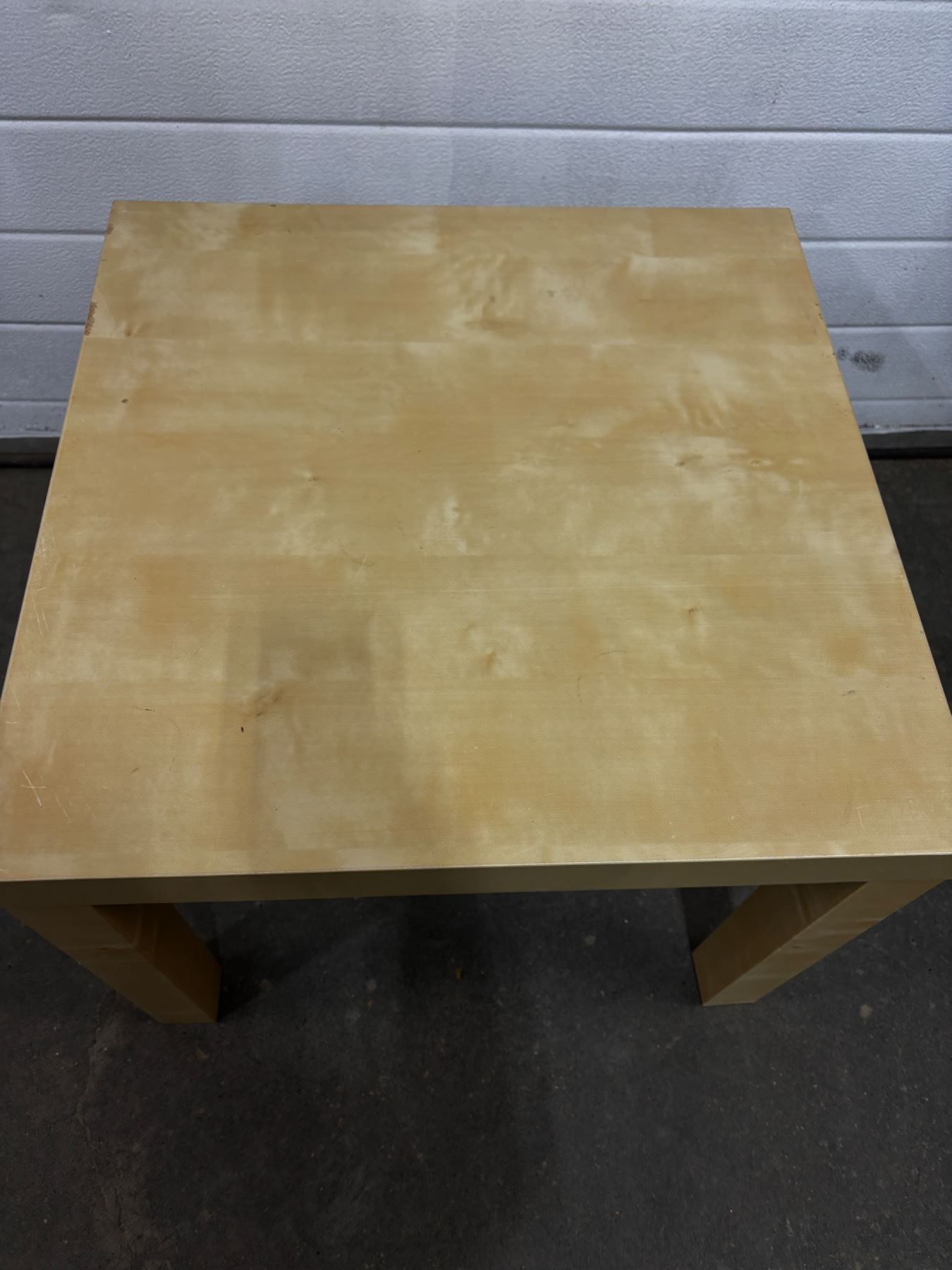 Approximately 21.5" by 21.5" and 18" tall. Wear to wood surface and legs. Some chips.
