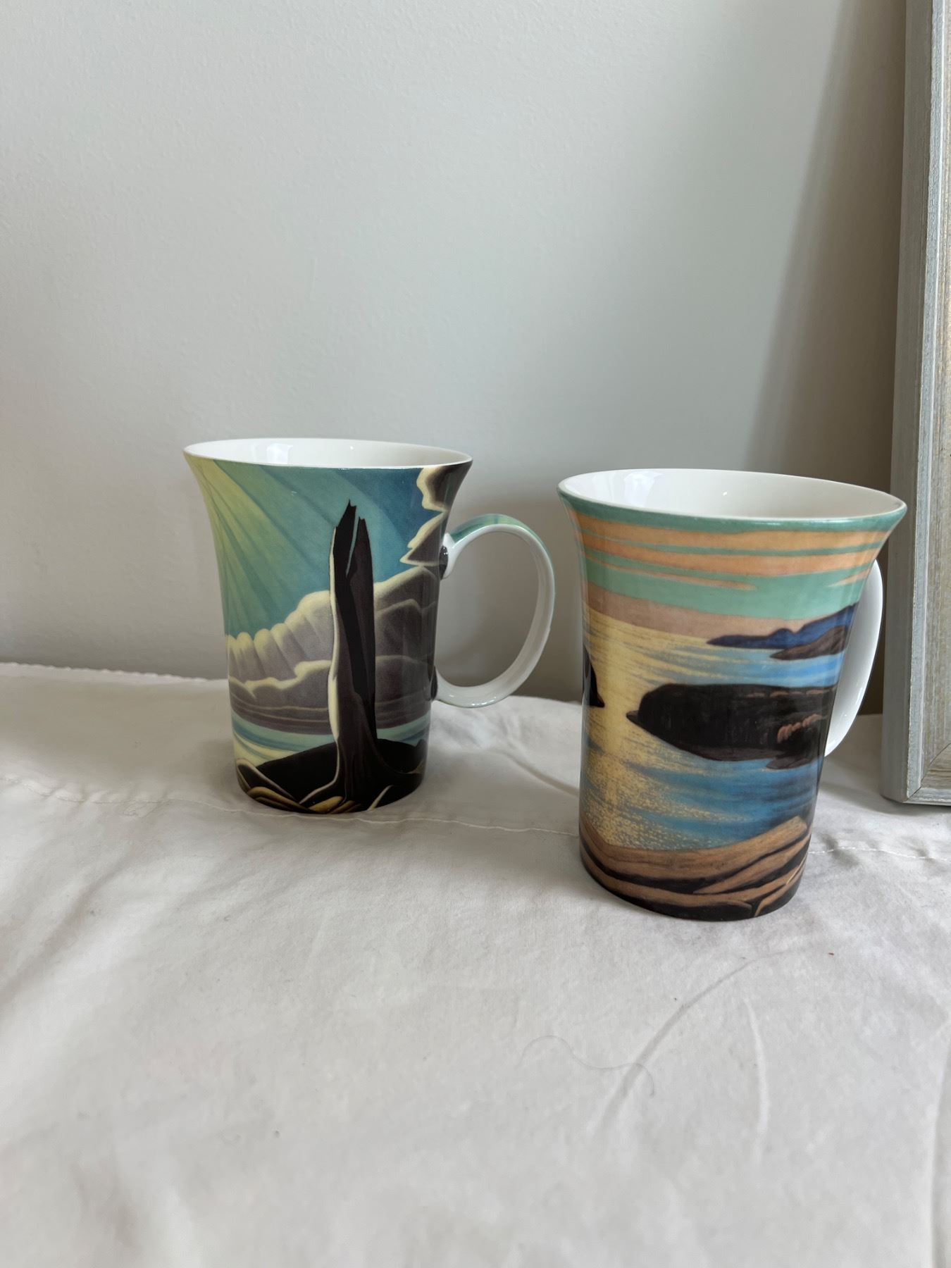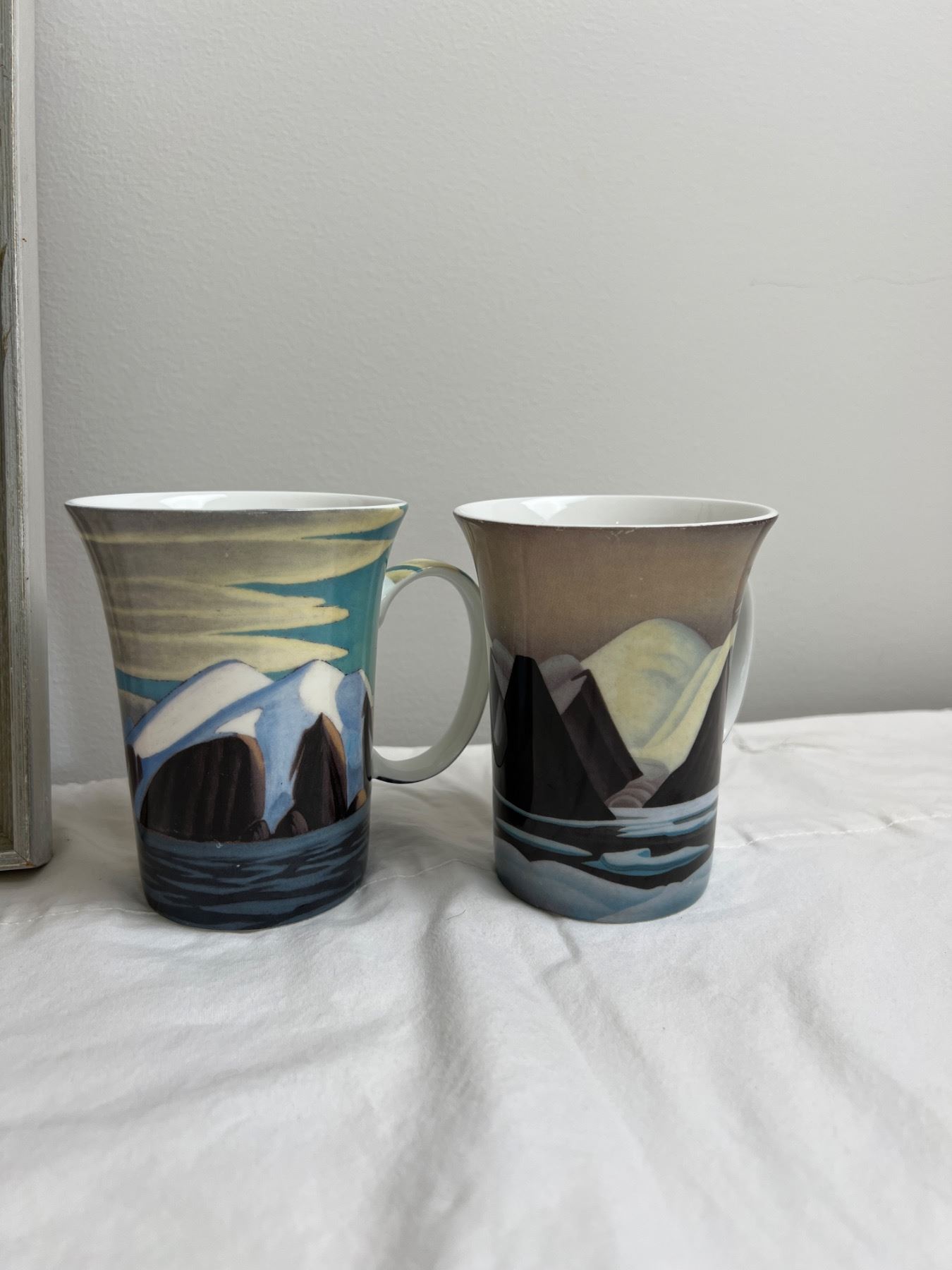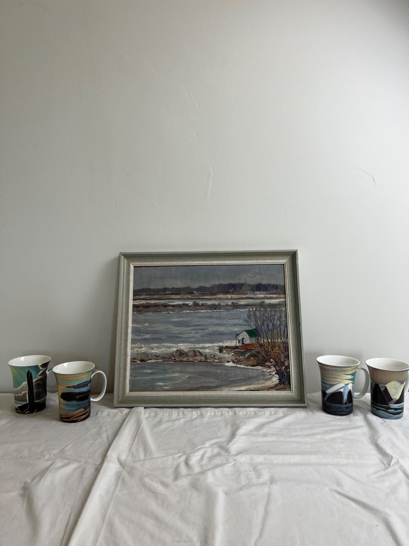 Mugs feature various depictions of Lake Superior. Artwork does not have signature but has texture. Likely oil. Measure 18" by 15"