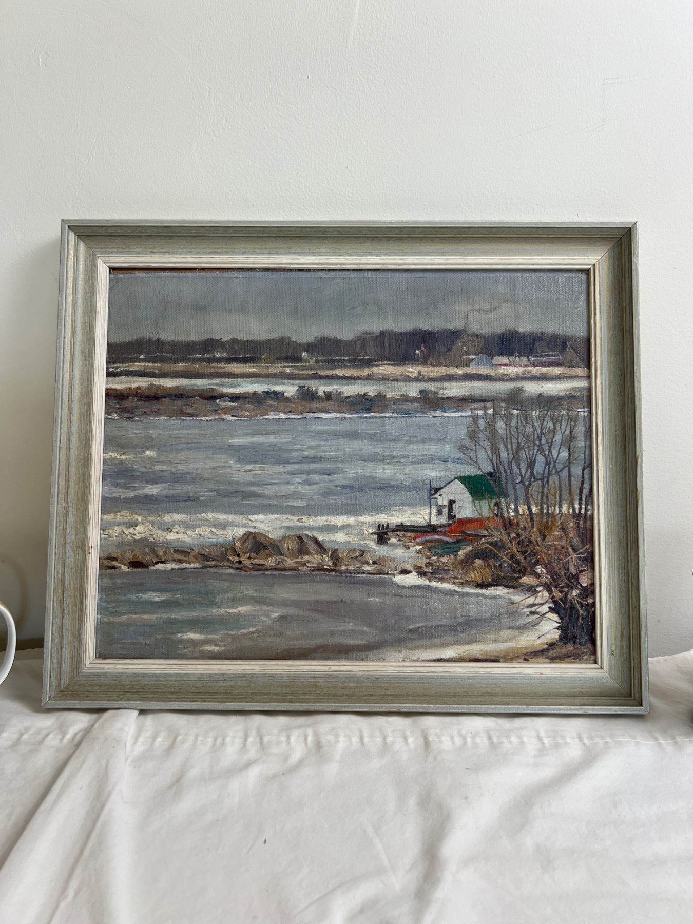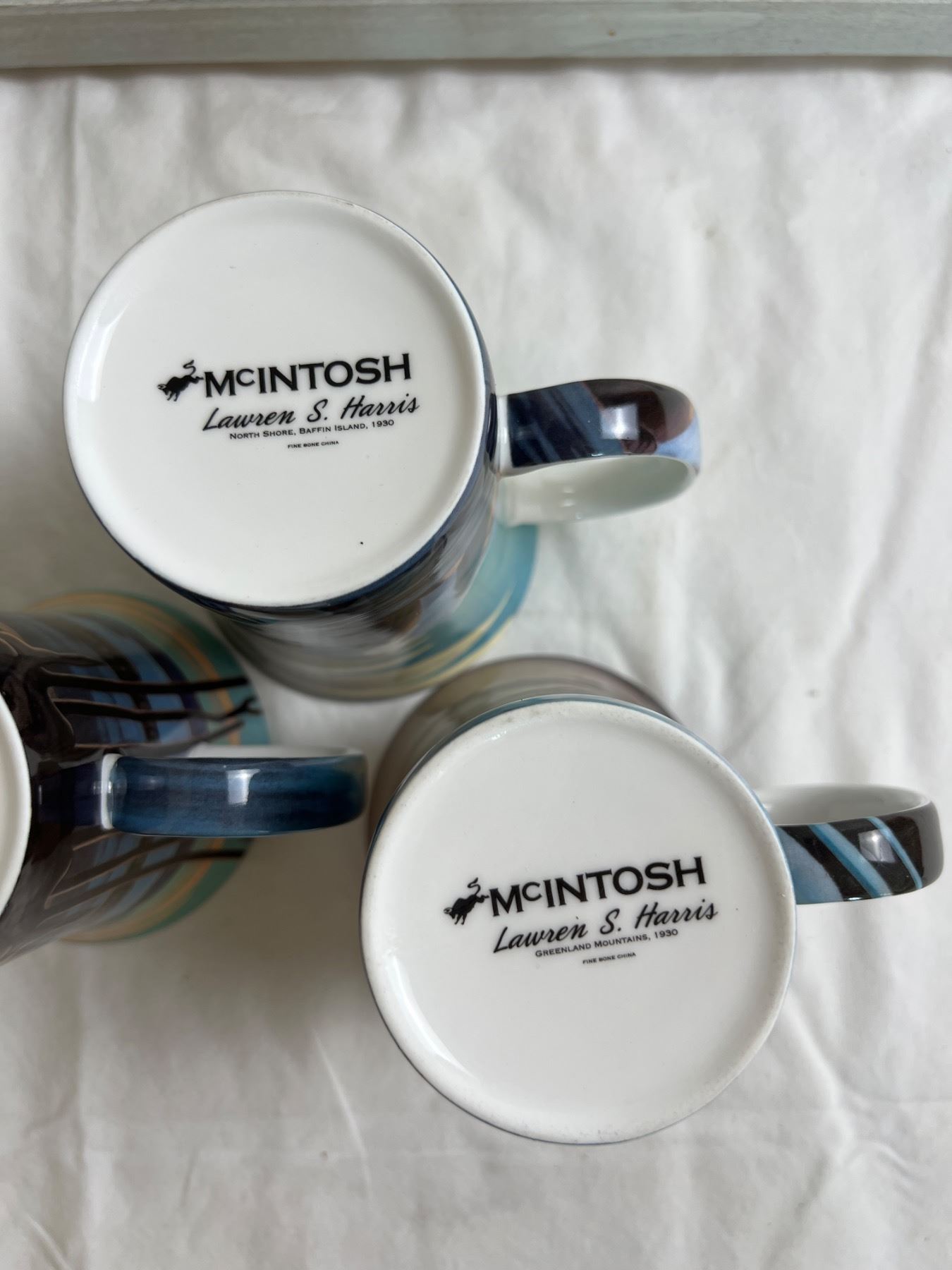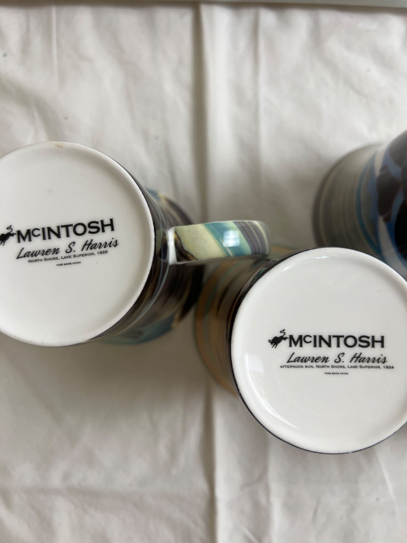 Mugs feature various depictions of Lake Superior. Artwork does not have signature but has texture. Likely oil. Measure 18" by 15"