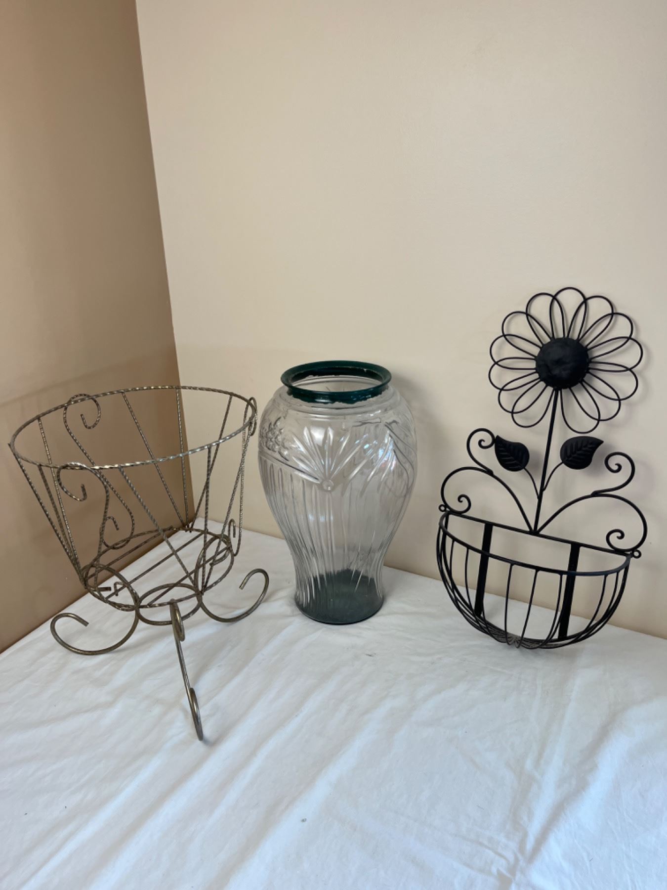 Vase is 16" Tall. Flower Basket has loose Wire
