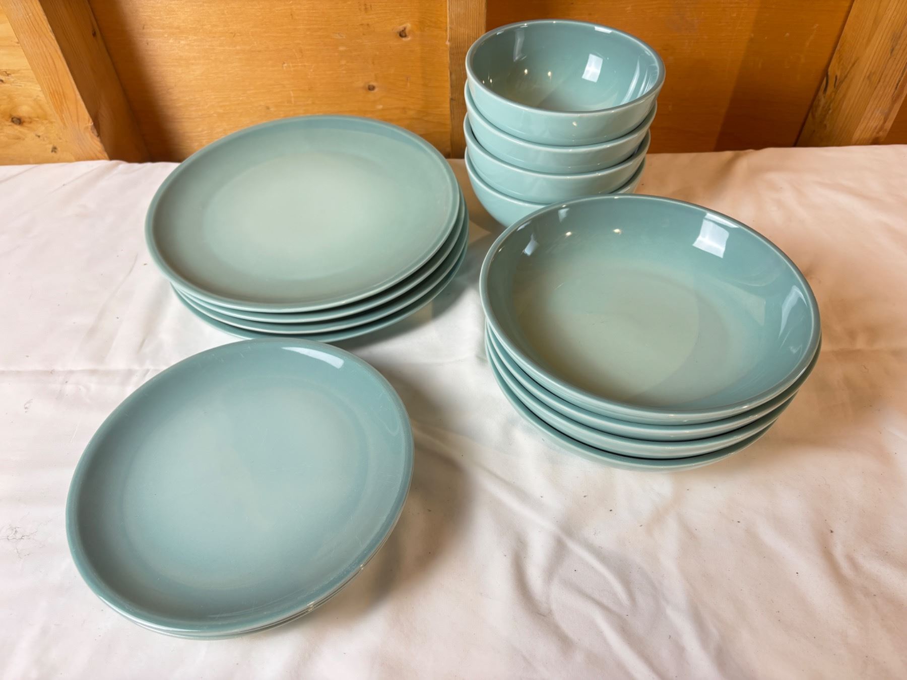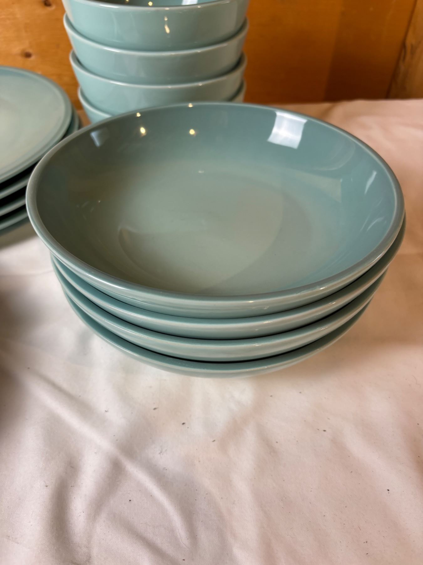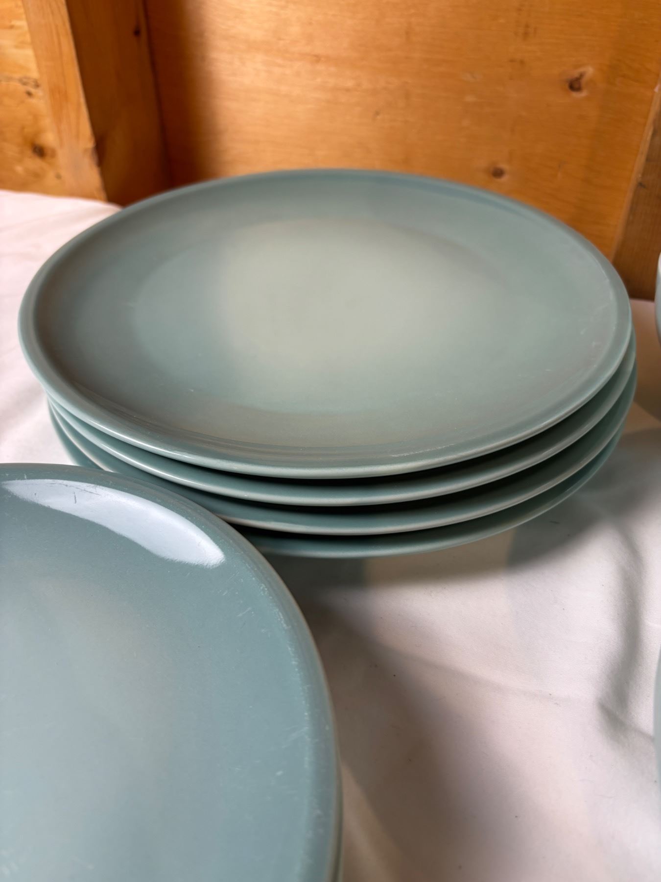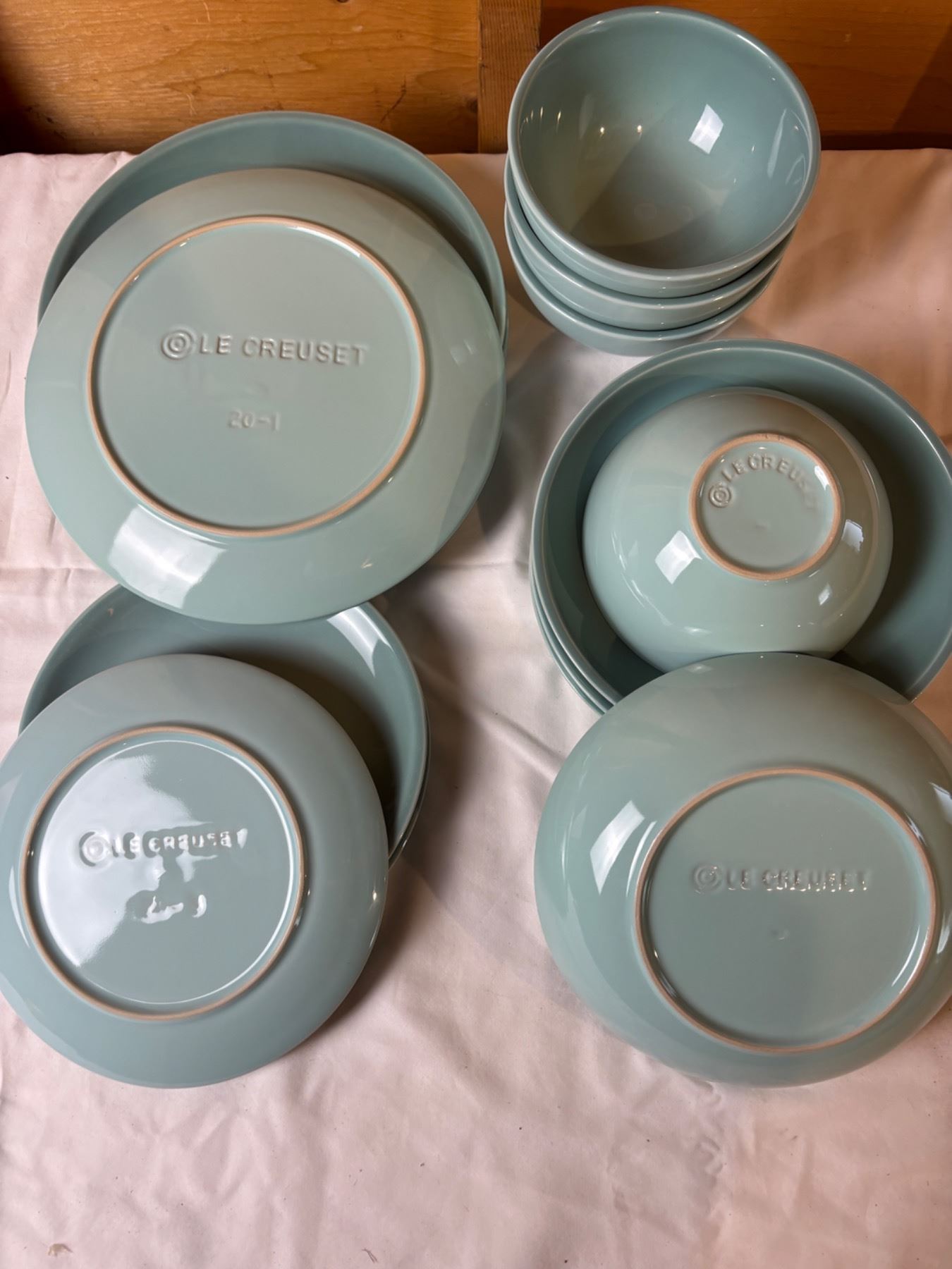 Includes, four dinner plates, three side plates, four small bowls, four large bowls, some scuffing