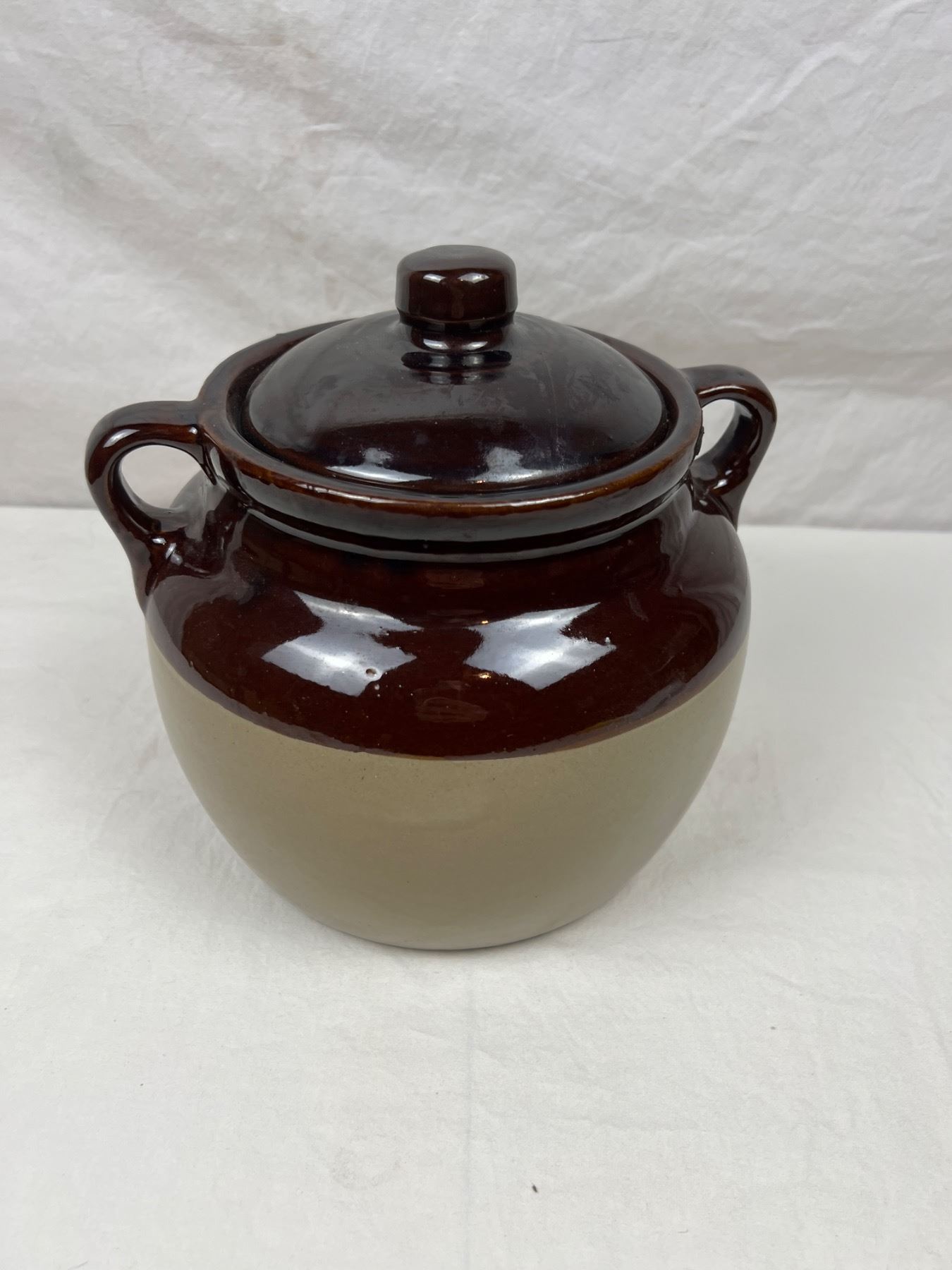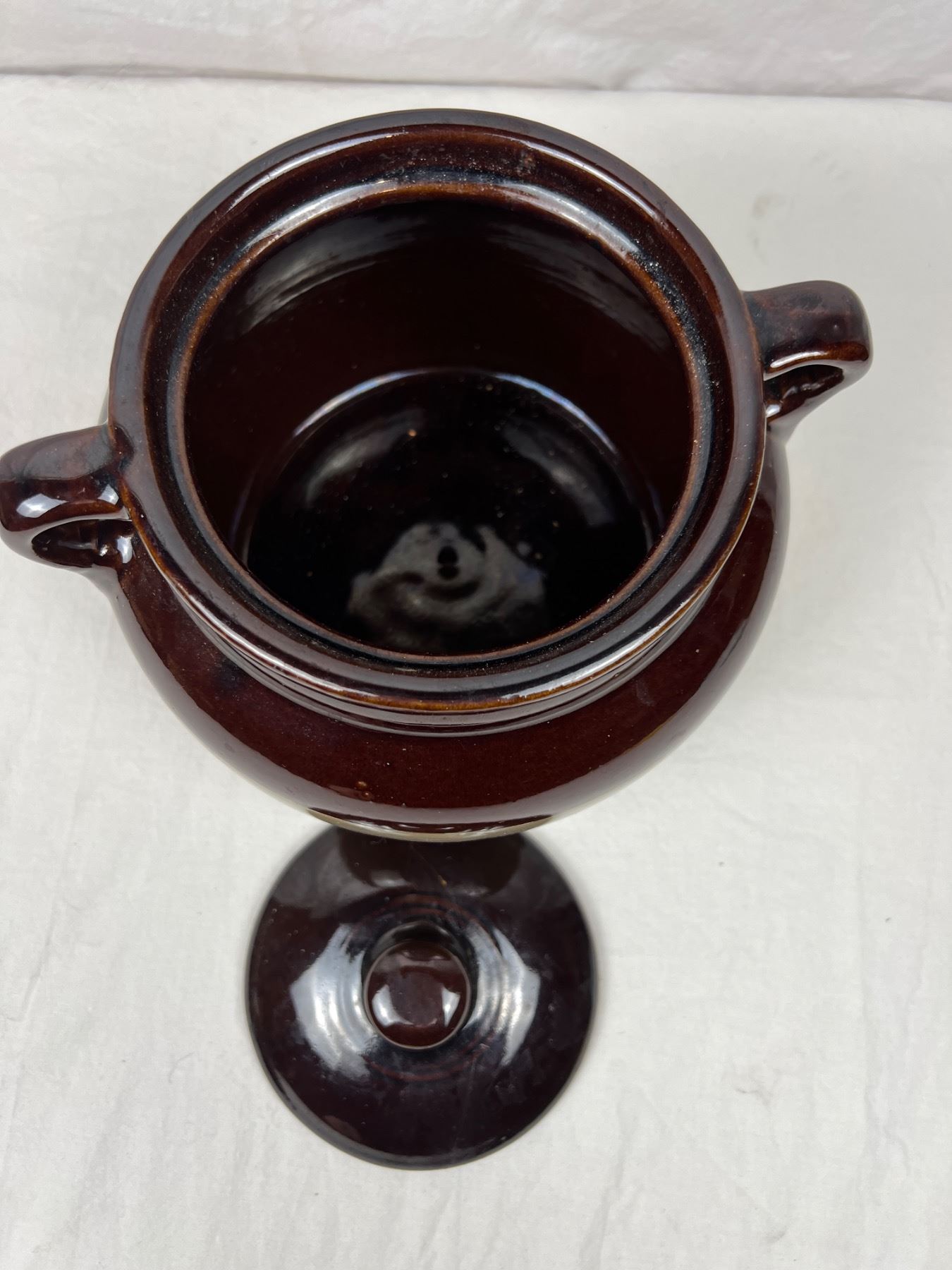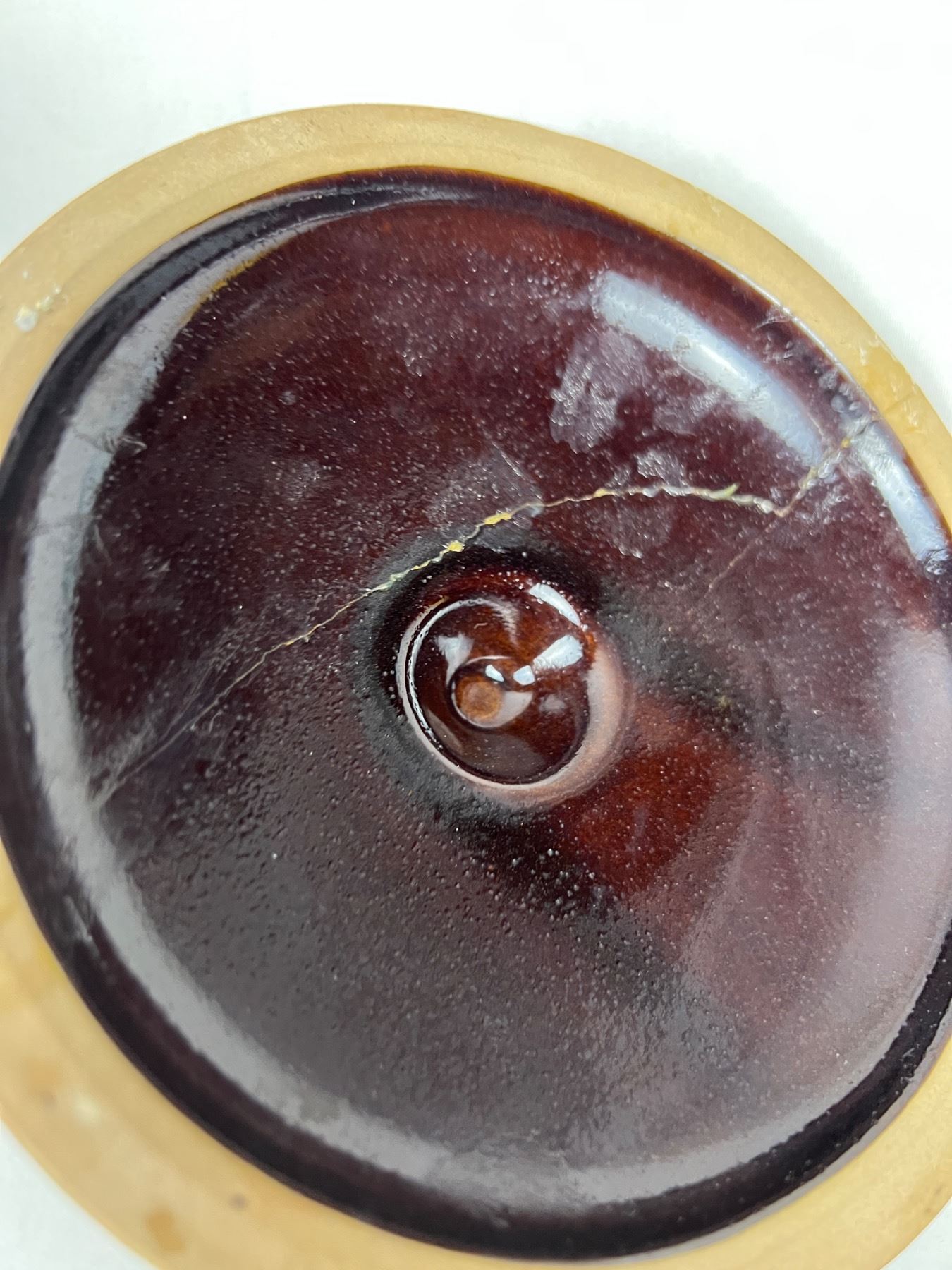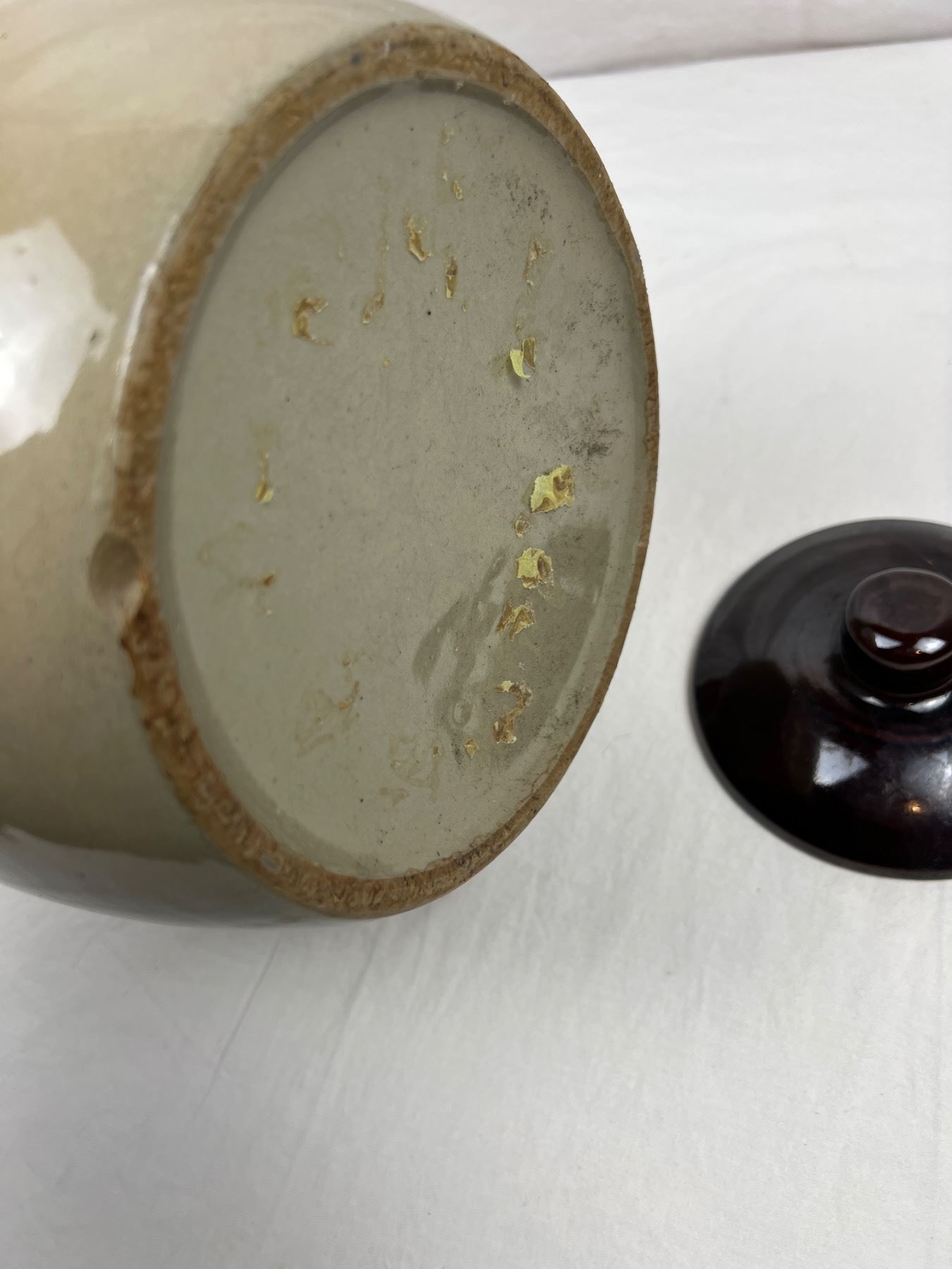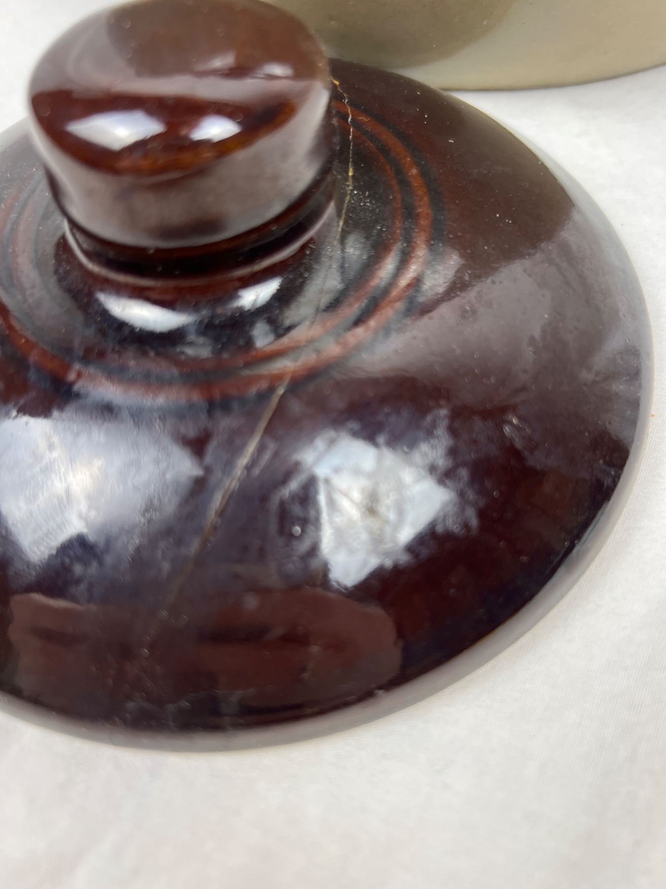 Lid was cracked and has been re-glued, 9.5"diameter x 8"H