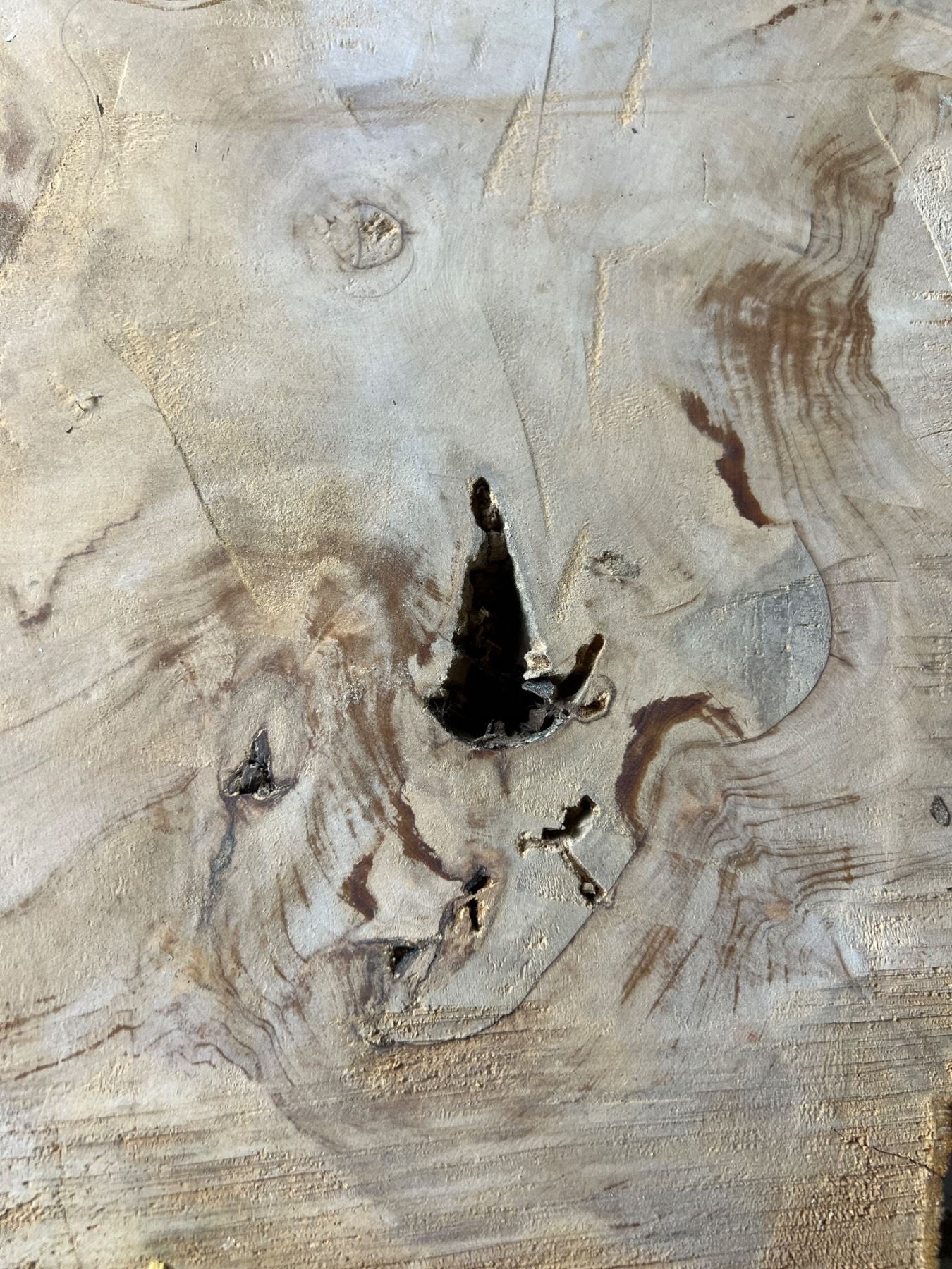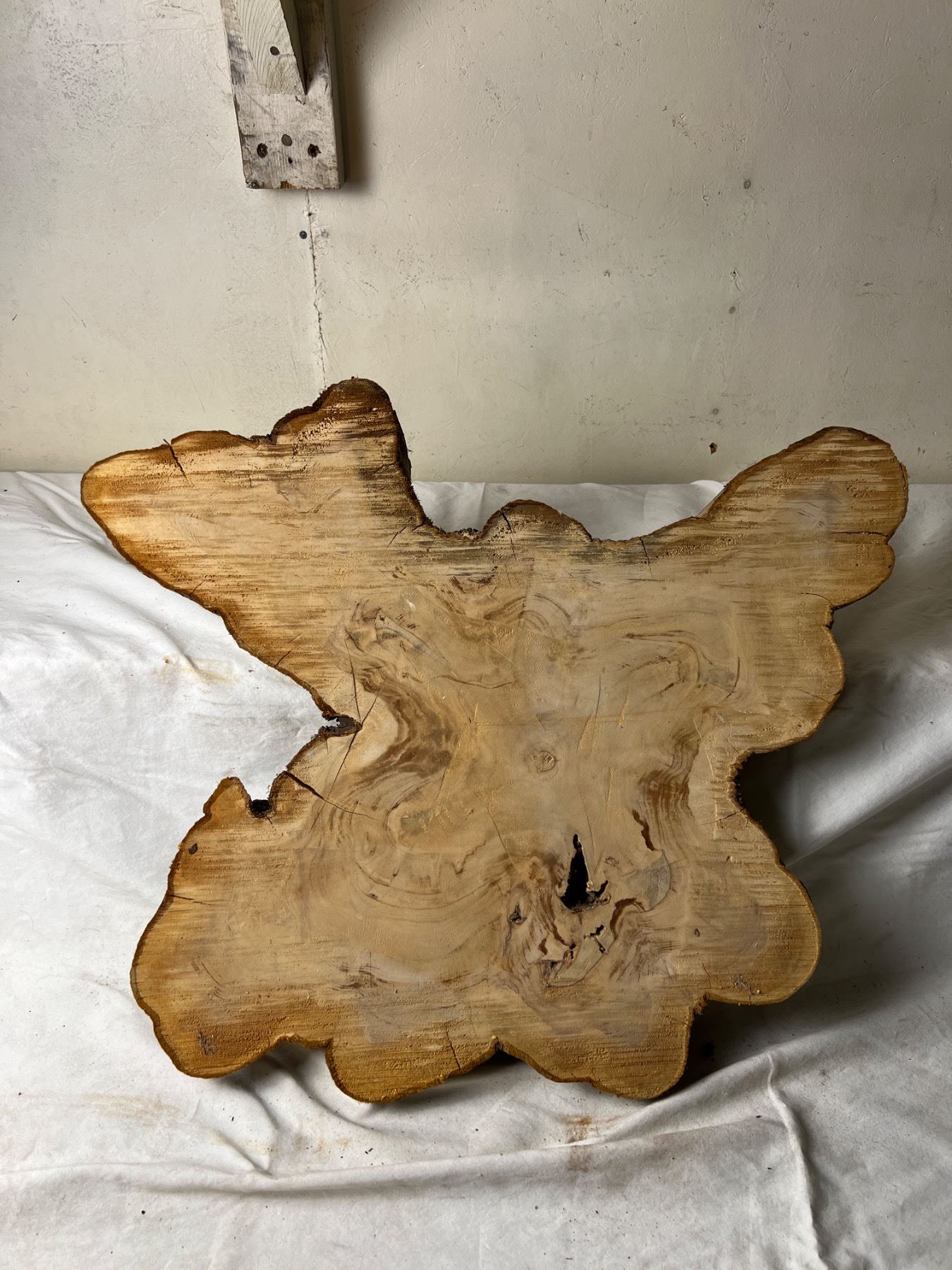 Piece measures 21.5" by 26" and 2" deep. Has hole from knot being removed.
