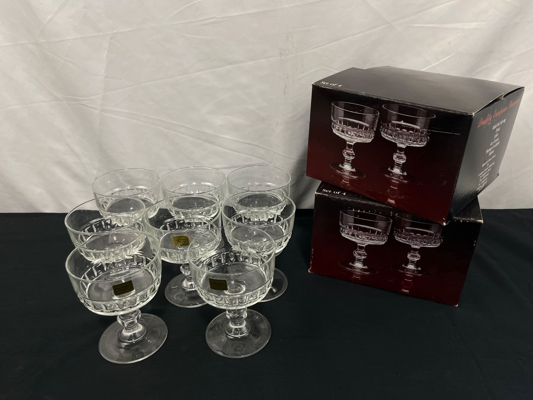 New condition in open boxes, one base is chipped, Luminarc Verrerie D'Arques France
