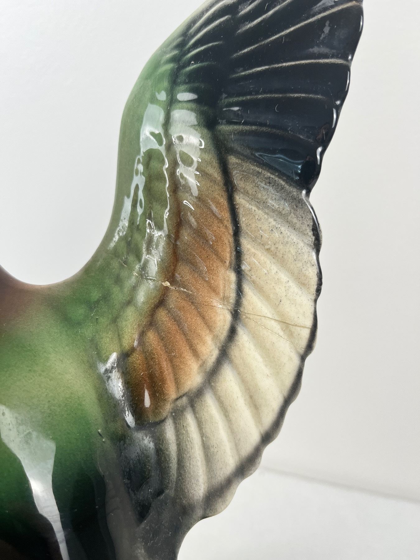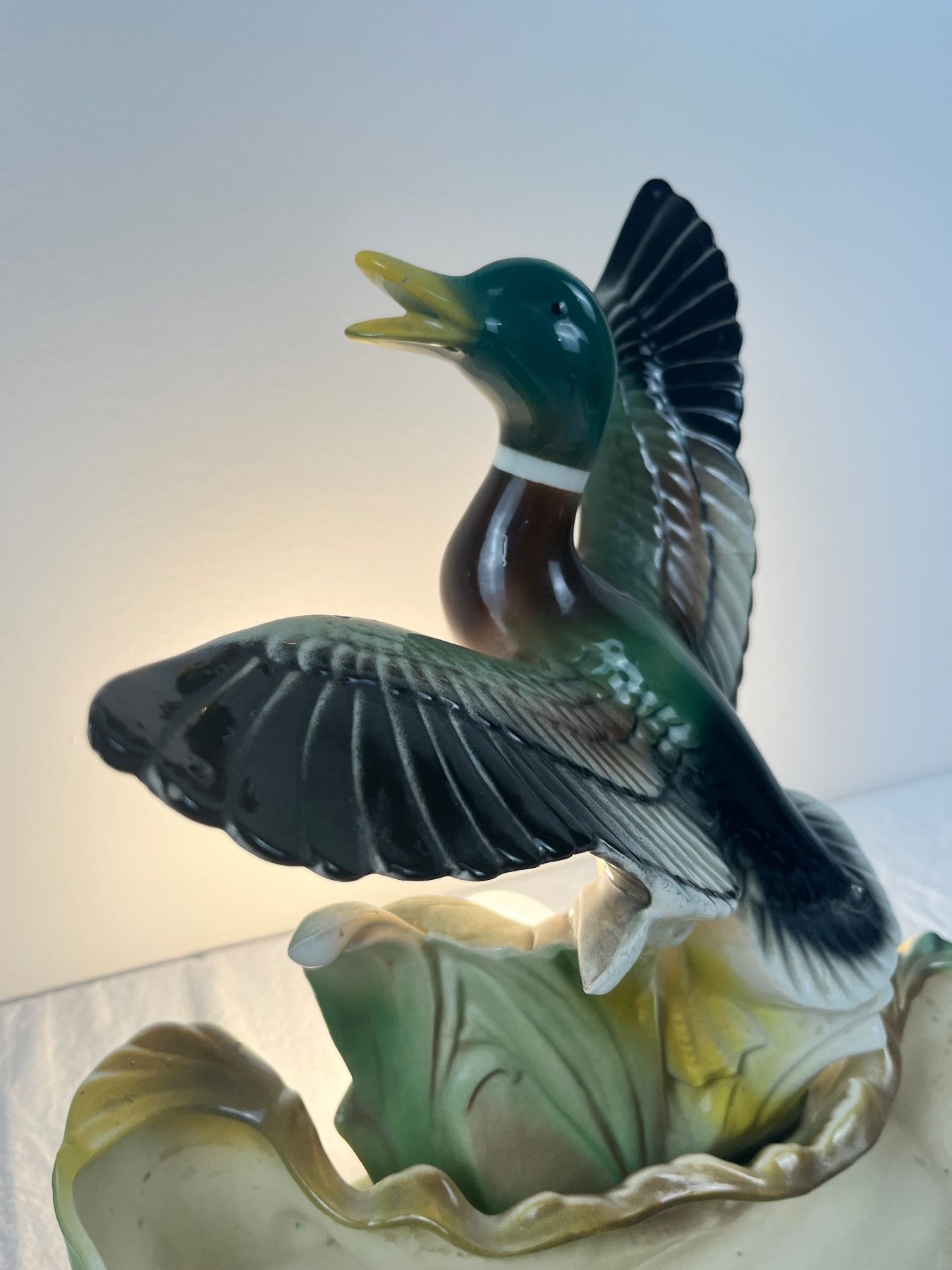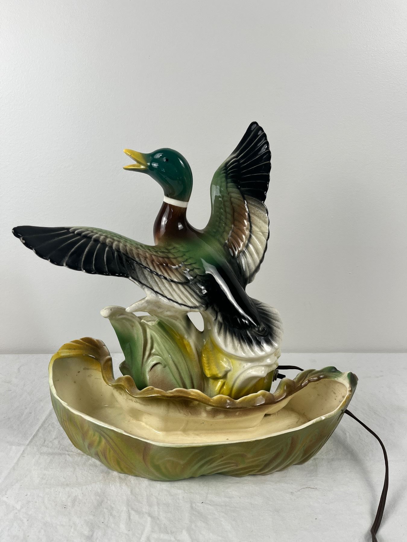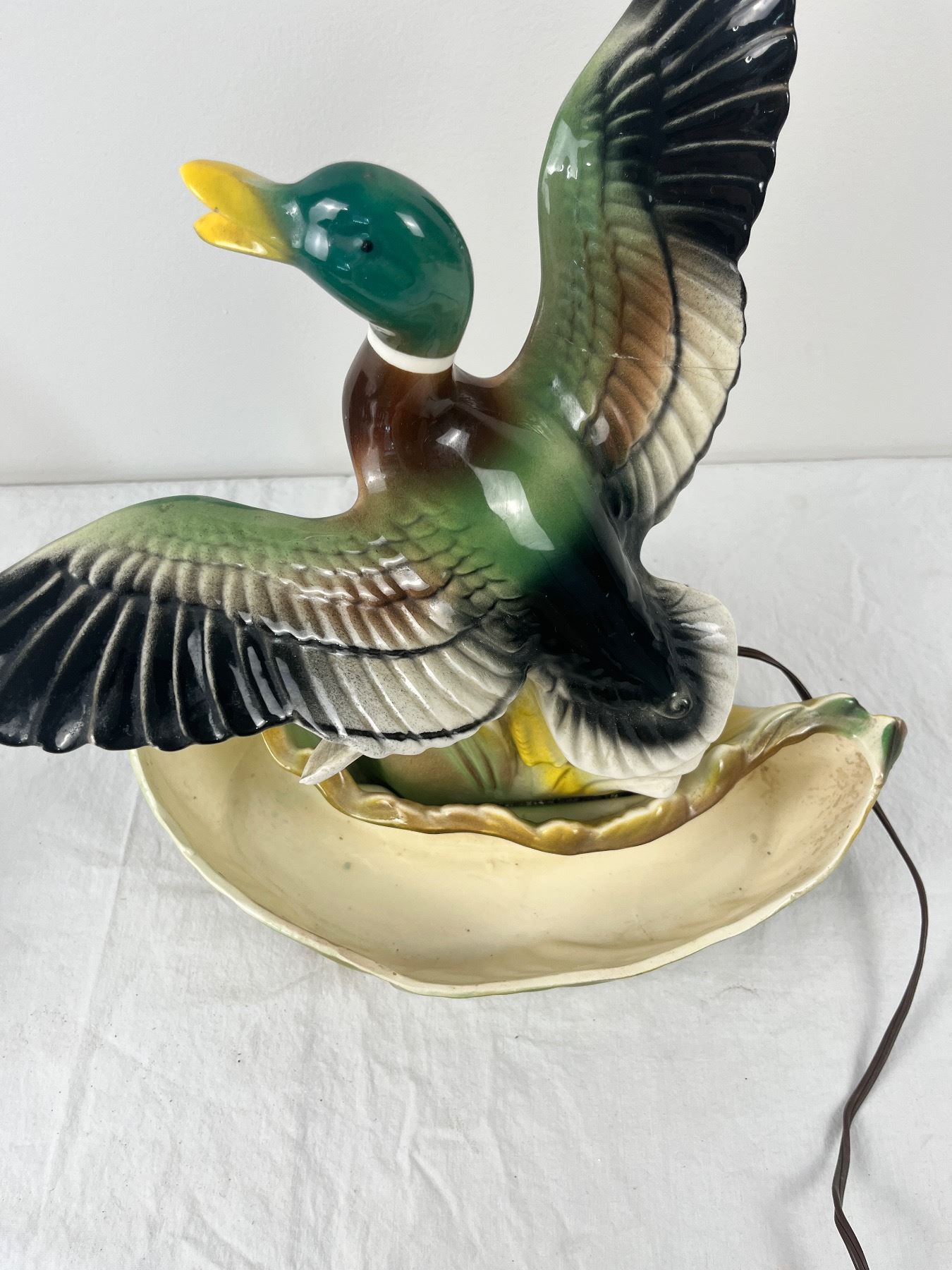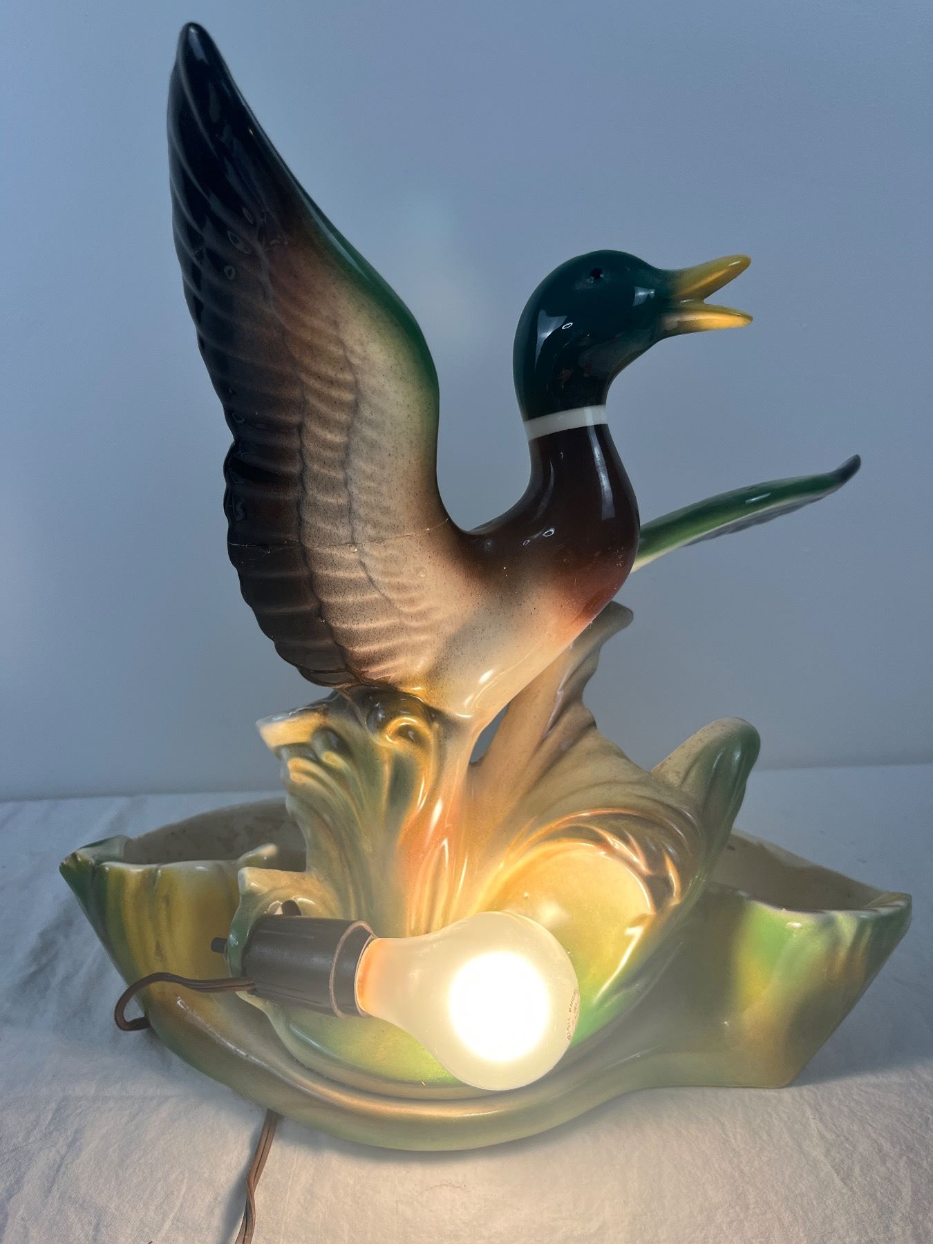 Has some chips, cracks, and repairs, lamp works
