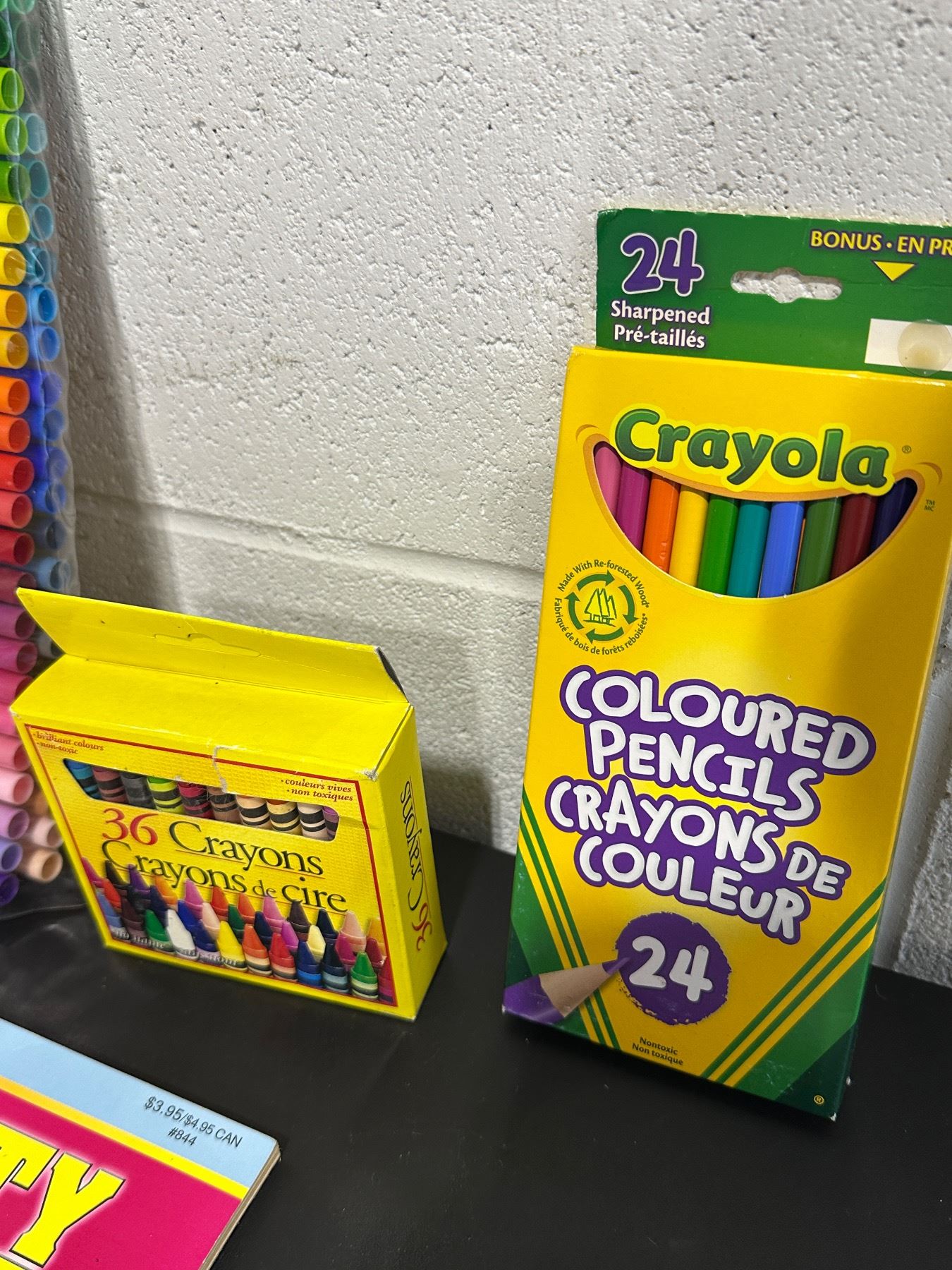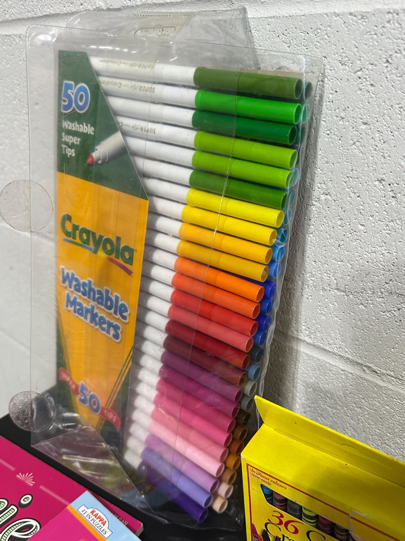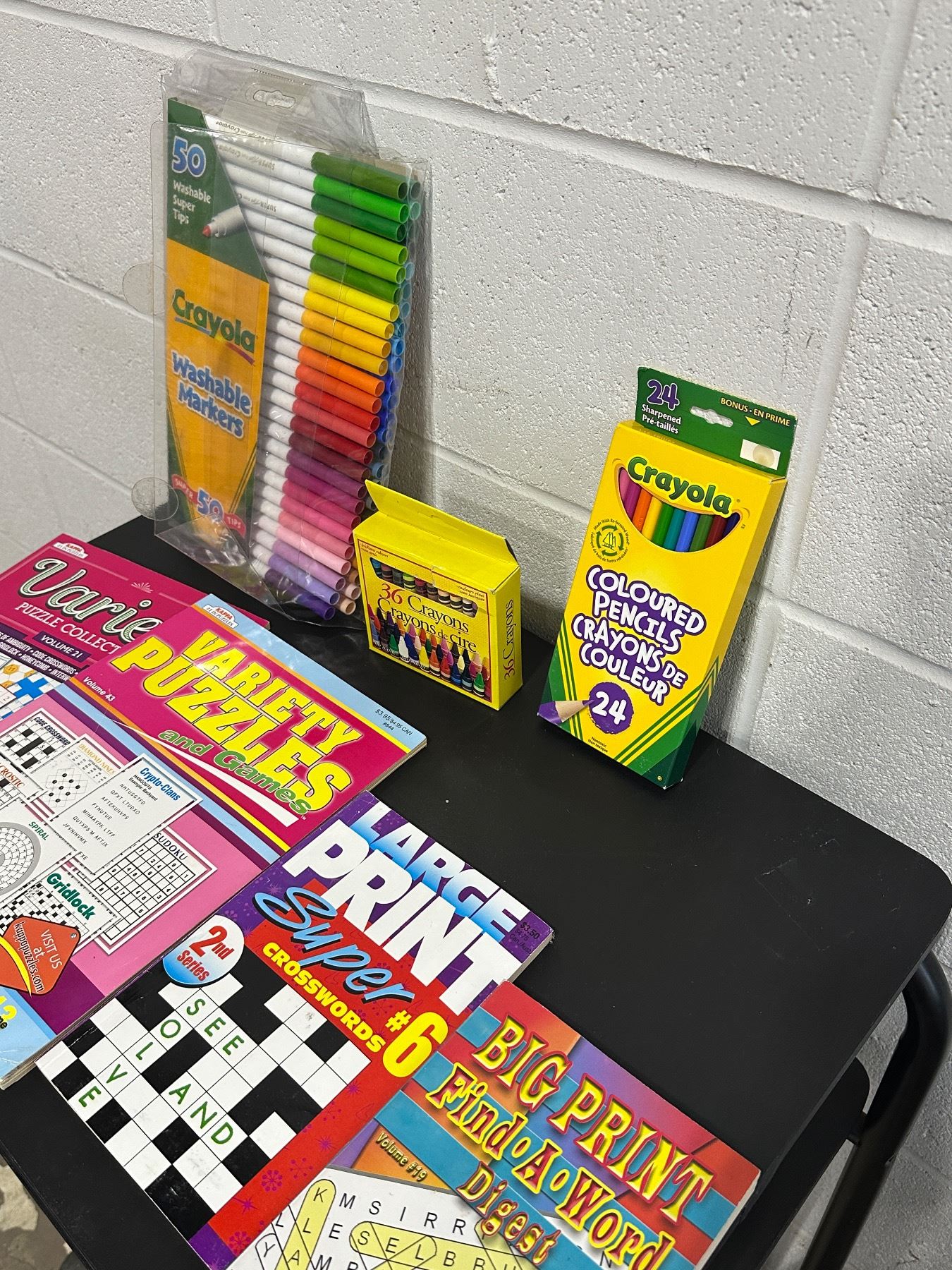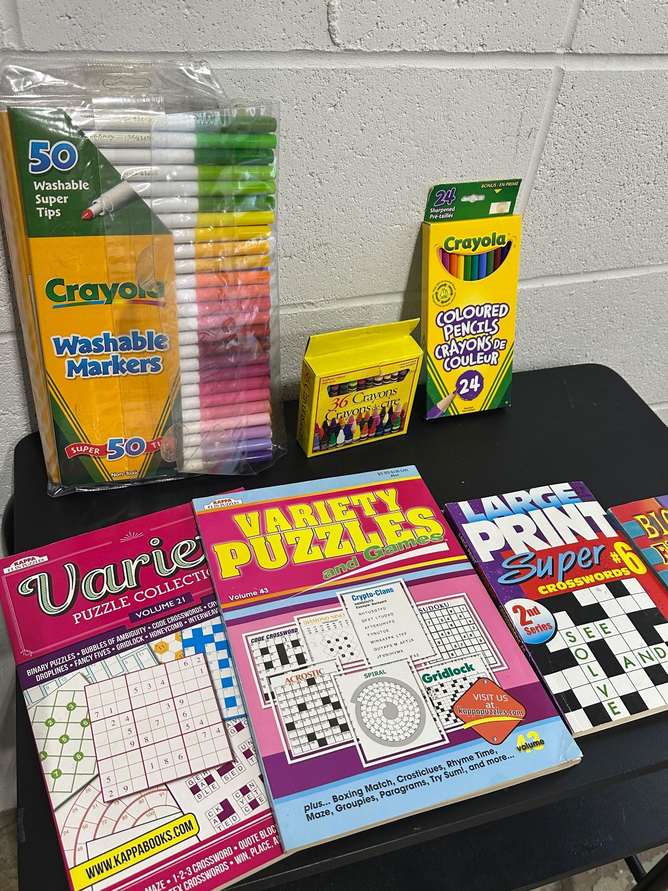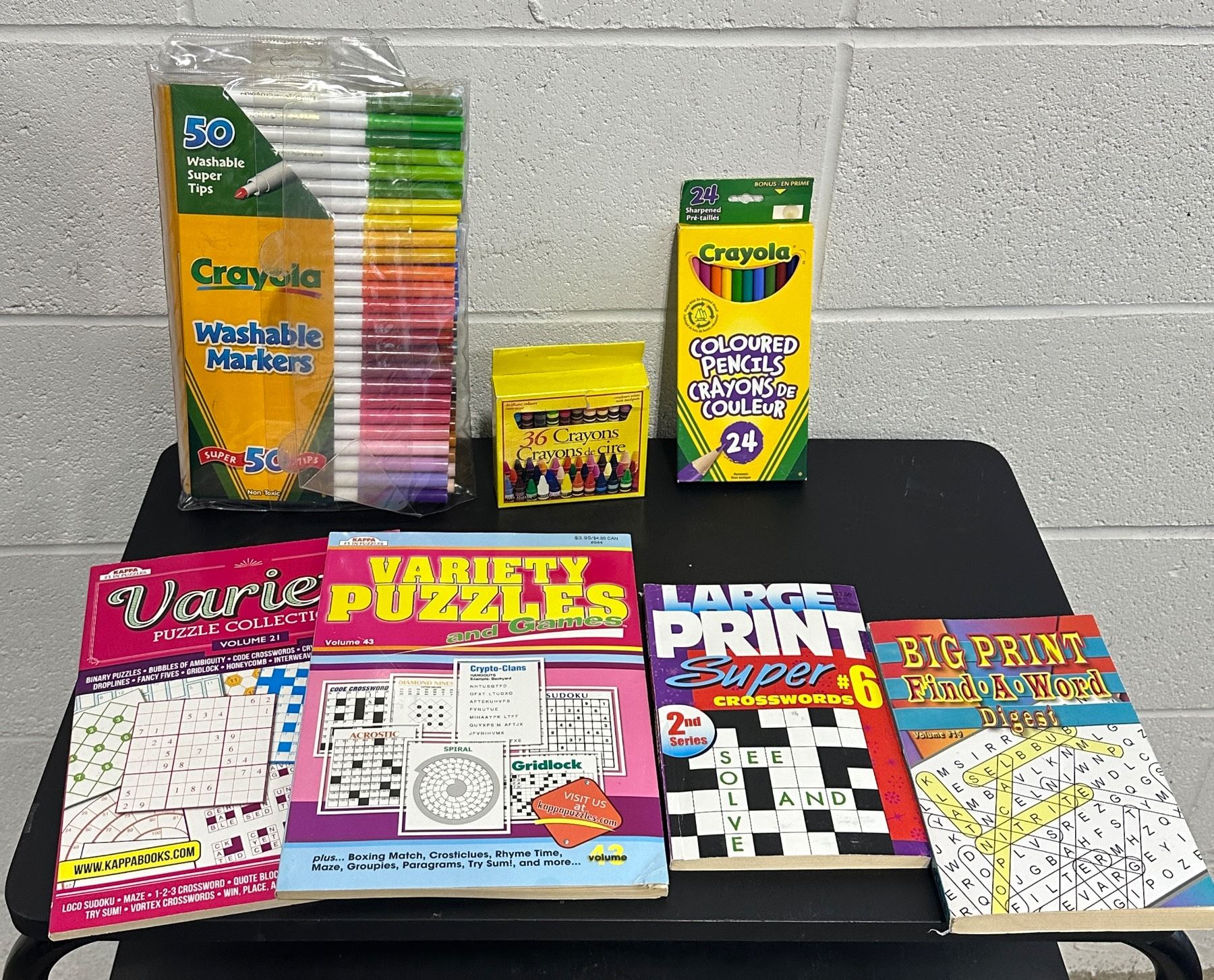 Includes word find books, variety puzzles, crayons, coloured pencils and washable markers