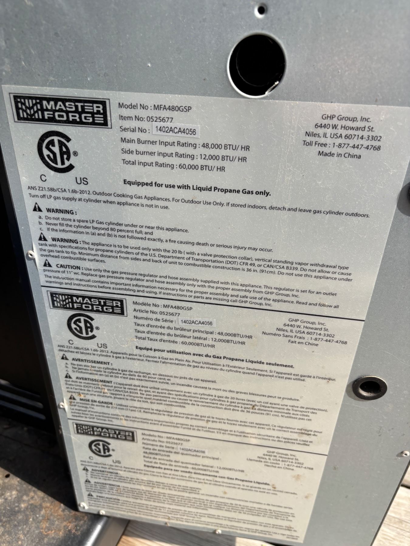 Inside needs cleaning, Includes a BBQ cover, Model MFA480GSP