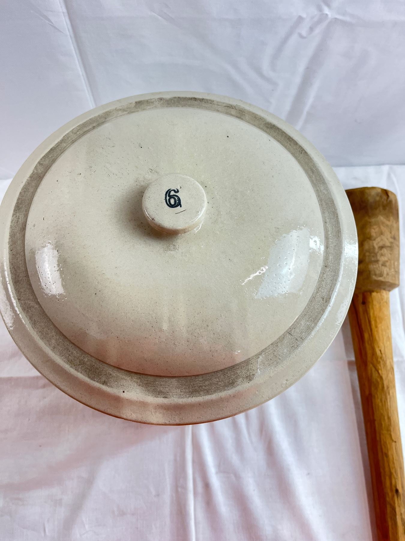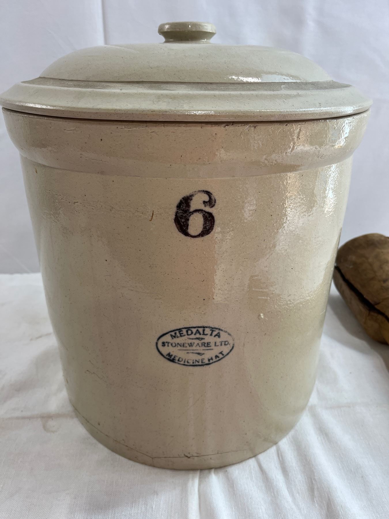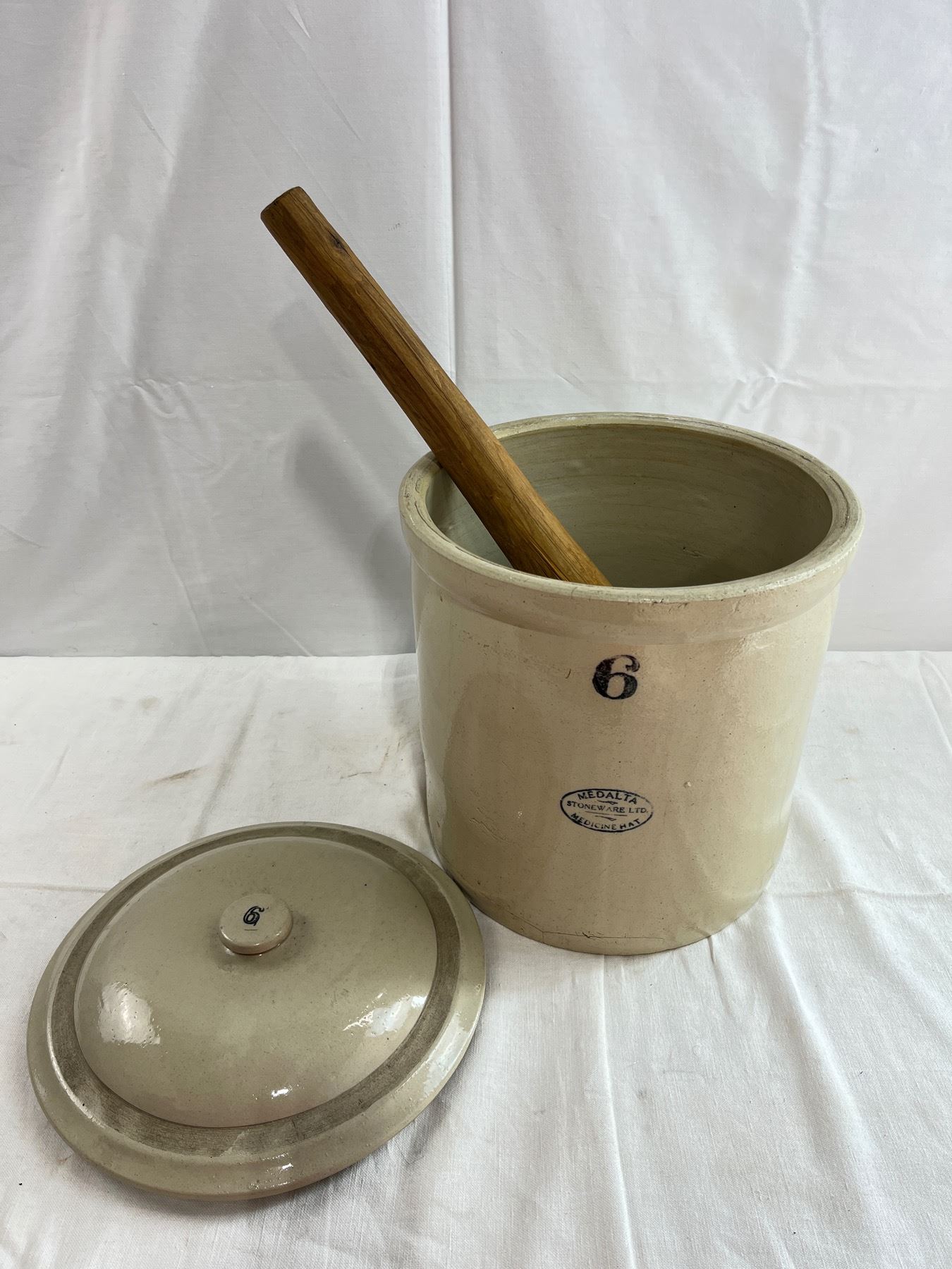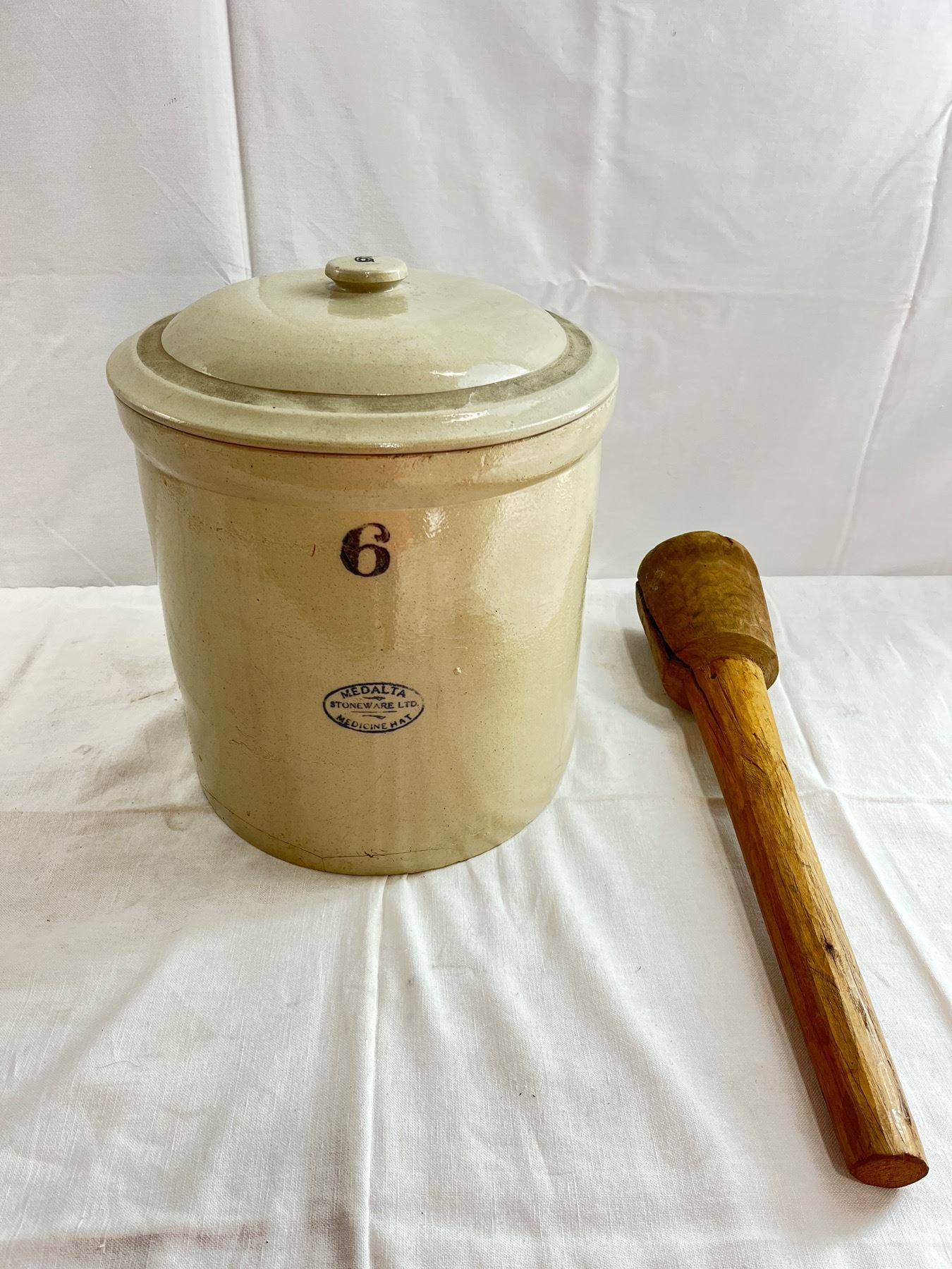 6 Gallon Medalta Crock with Lid and rustic wood masher - Crock 16" T x 13.5" round - Masher 23"L has some wear and cracks in both - 1916-24 This stamp, observed only in blue under the glaze, is presumably the second stamp used by Medalta
