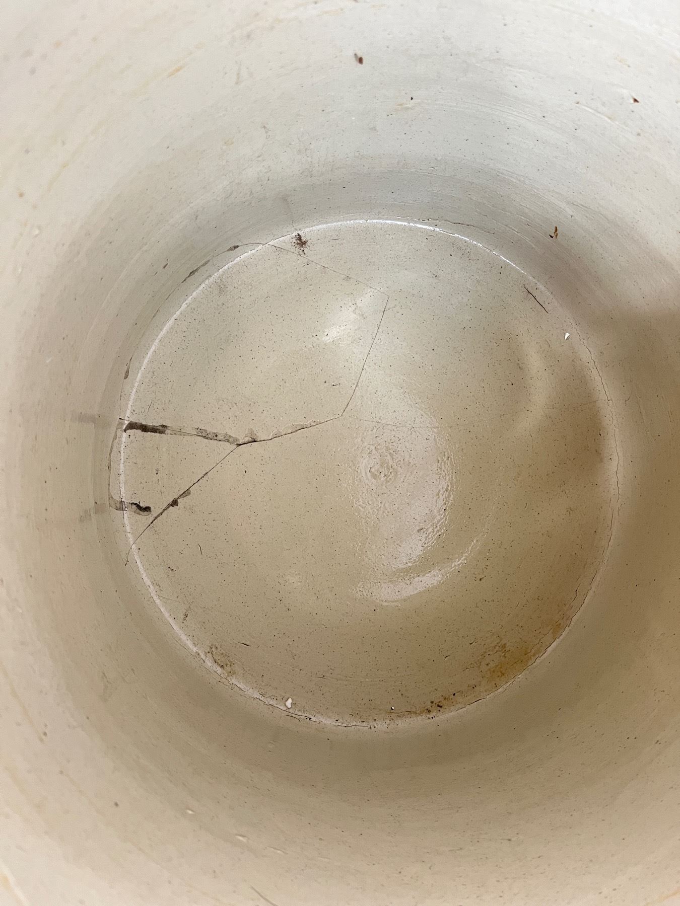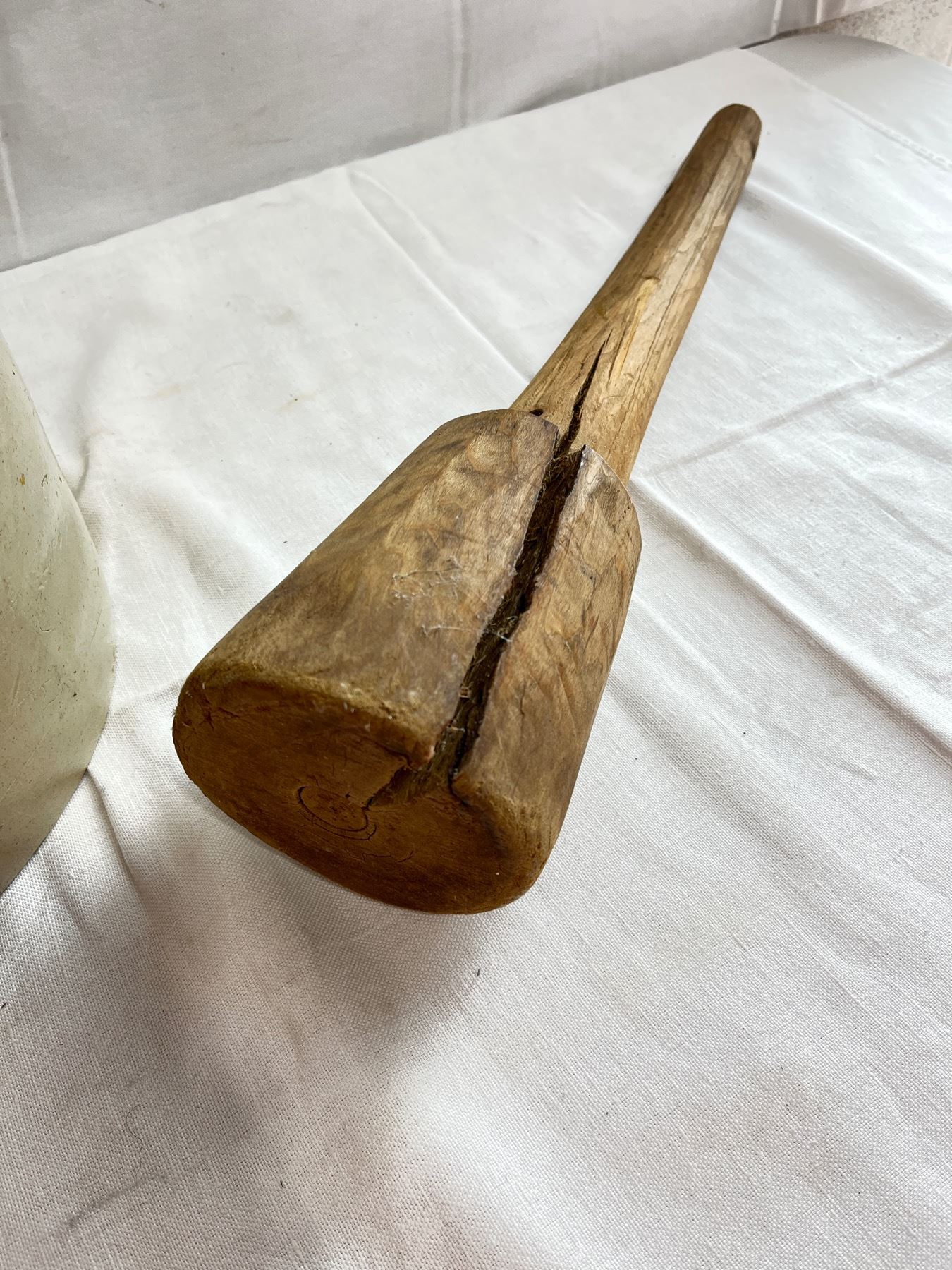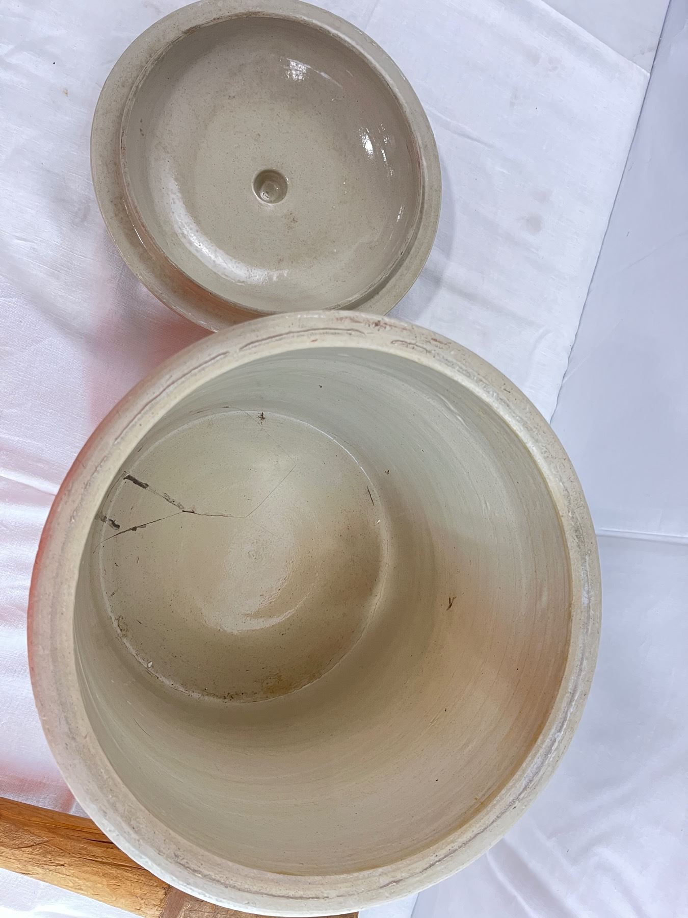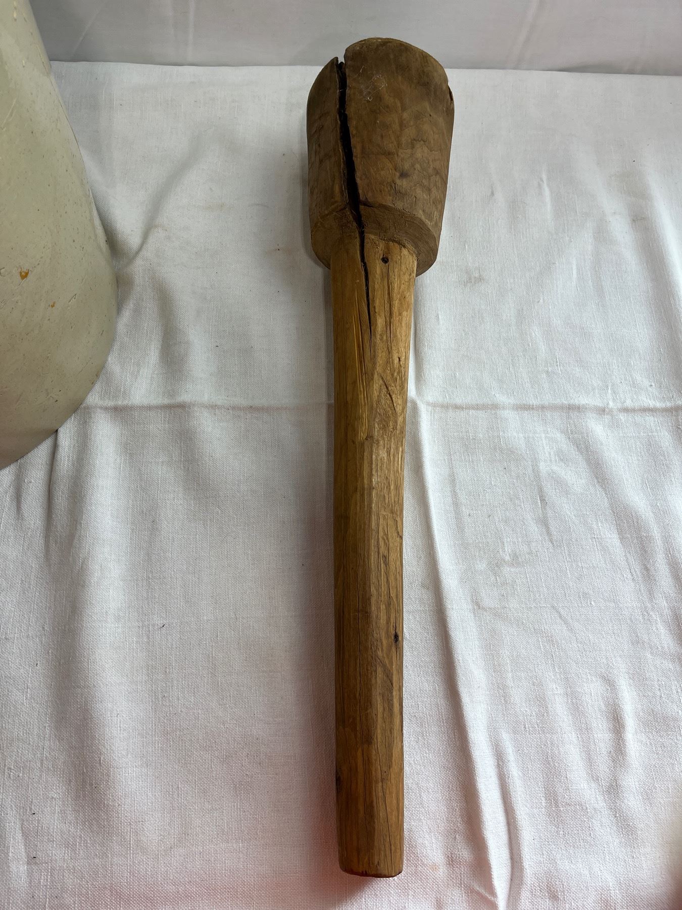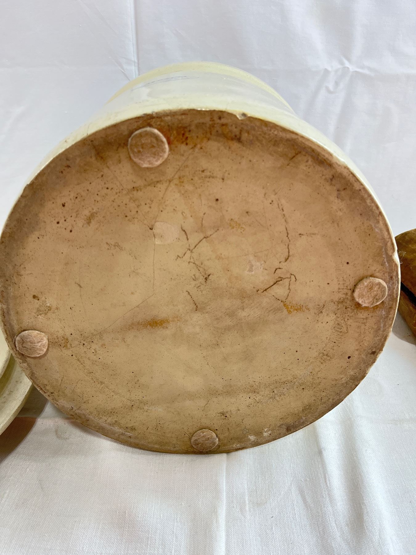 6 Gallon Medalta Crock with Lid and rustic wood masher - Crock 16" T x 13.5" round - Masher 23"L has some wear and cracks in both - 1916-24 This stamp, observed only in blue under the glaze, is presumably the second stamp used by Medalta