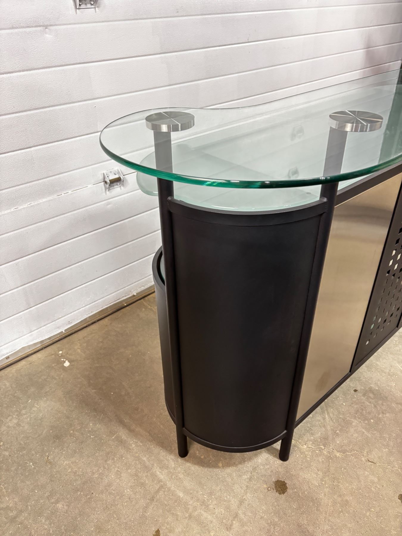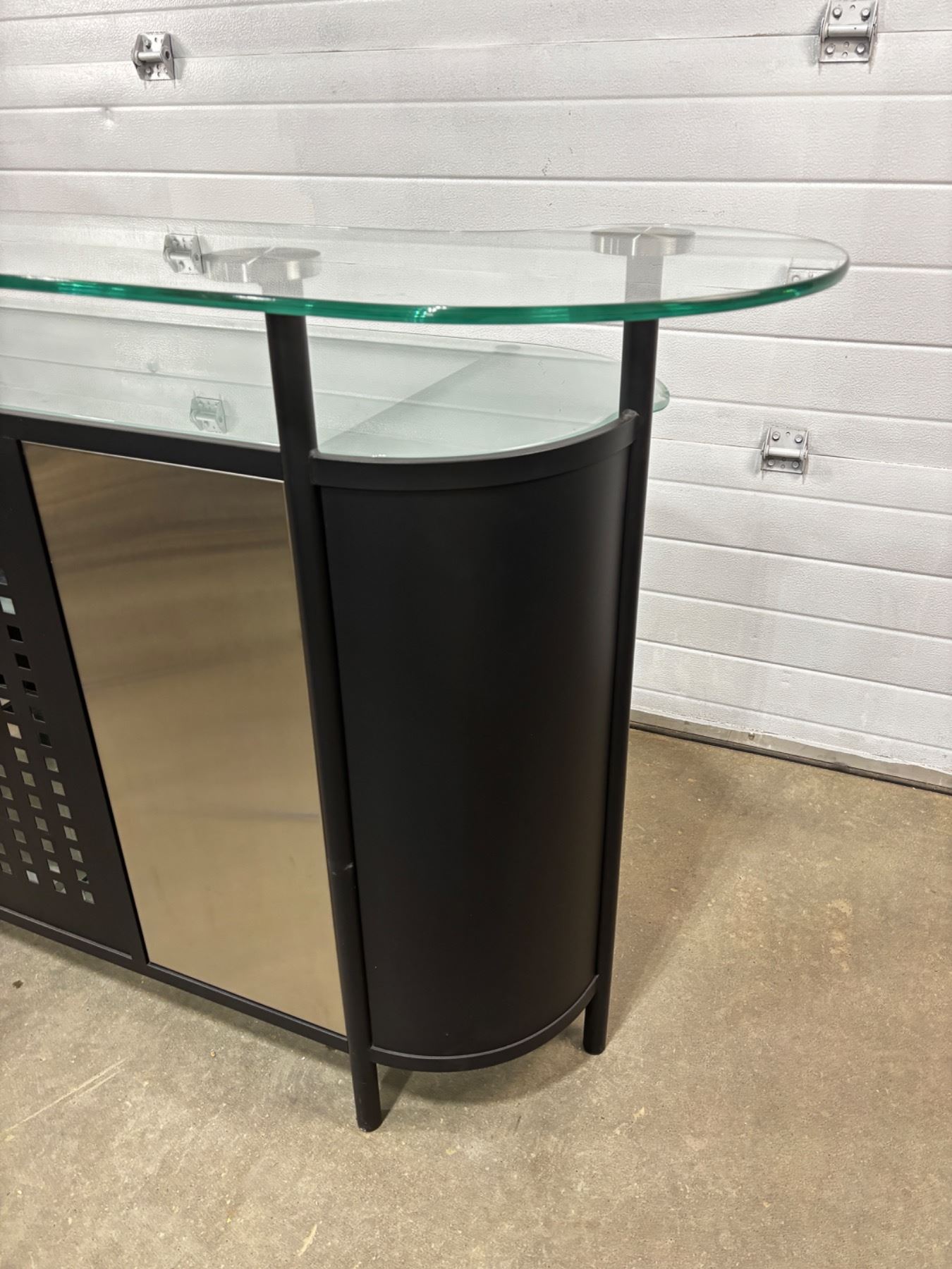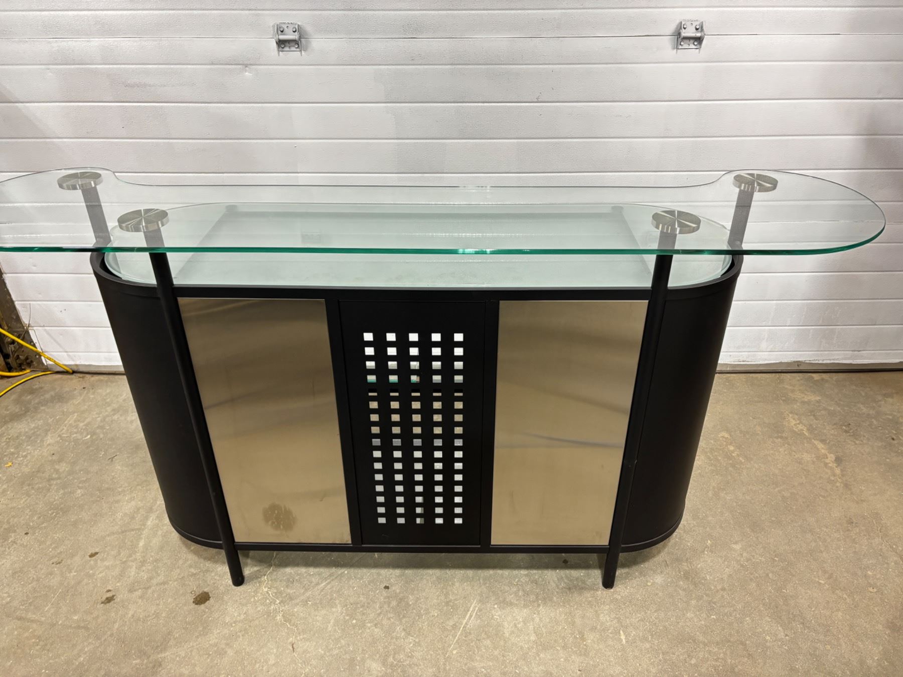 Approximately 6ft long, 26" wide and 42" tall. Please bring help, quite heavy but glass panels do come off. Some stains to metal and glass. Frosted glass panel has chip in it on right side when looking from the front.