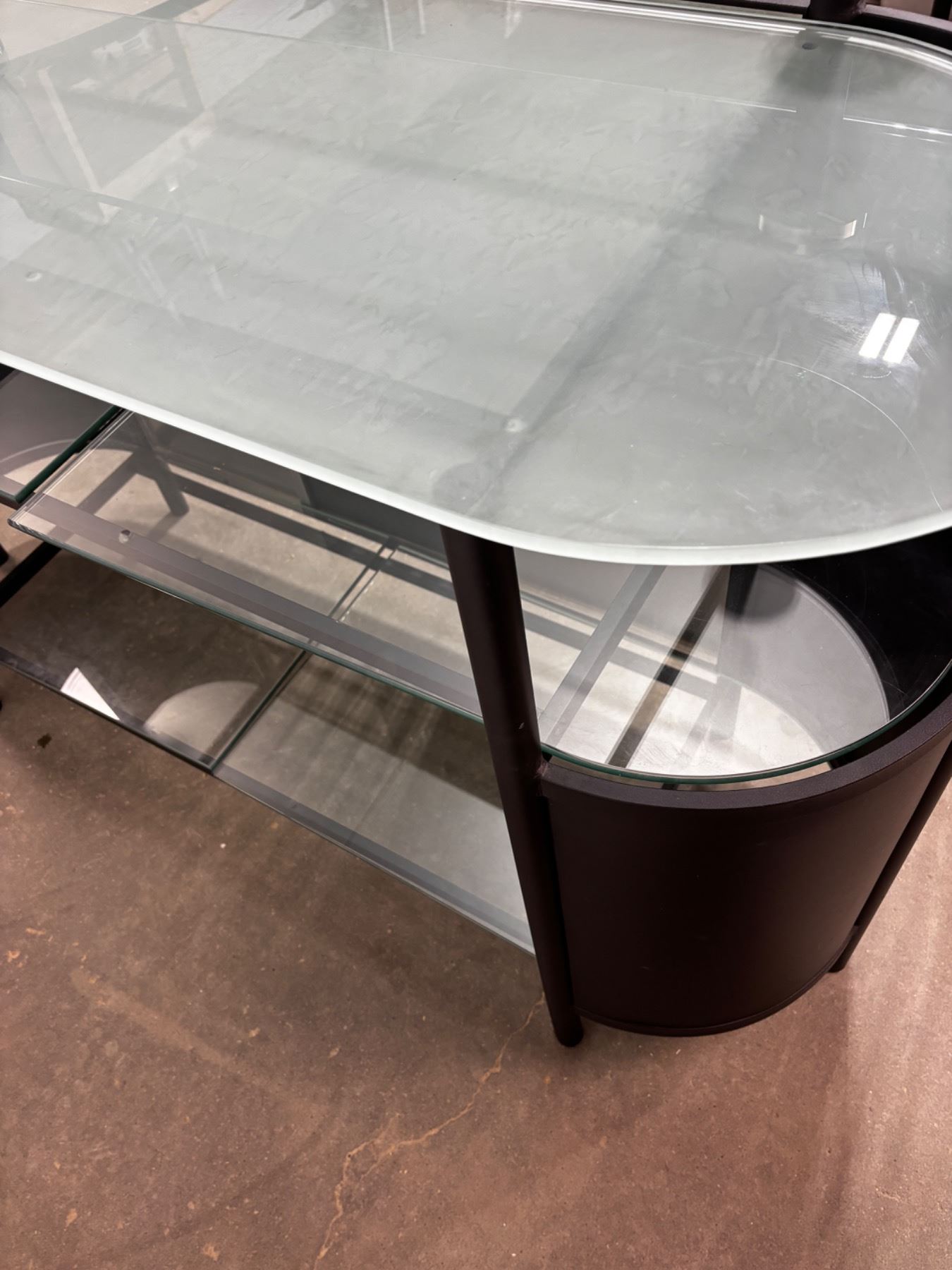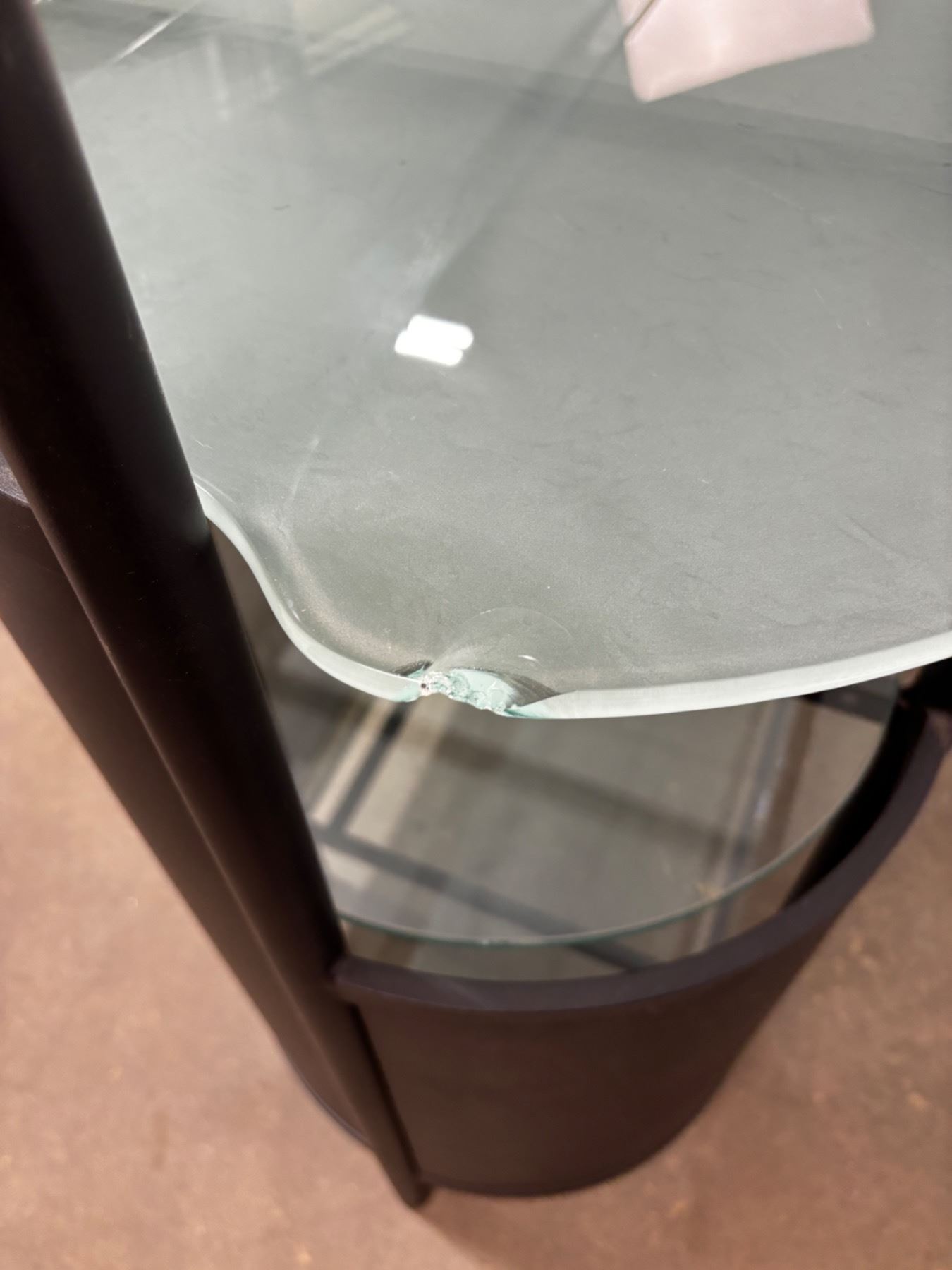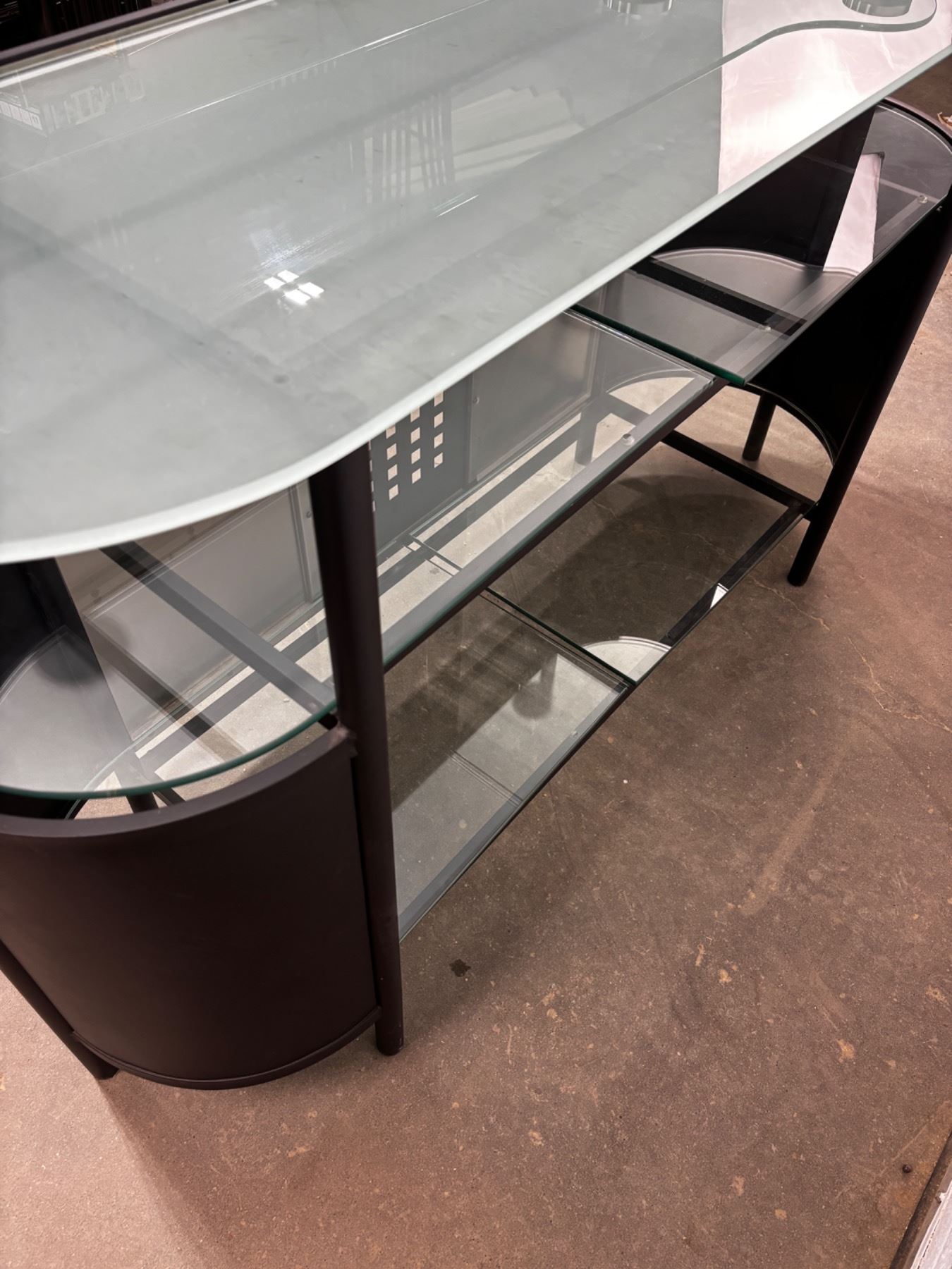 Approximately 6ft long, 26" wide and 42" tall. Please bring help, quite heavy but glass panels do come off. Some stains to metal and glass. Frosted glass panel has chip in it on right side when looking from the front.