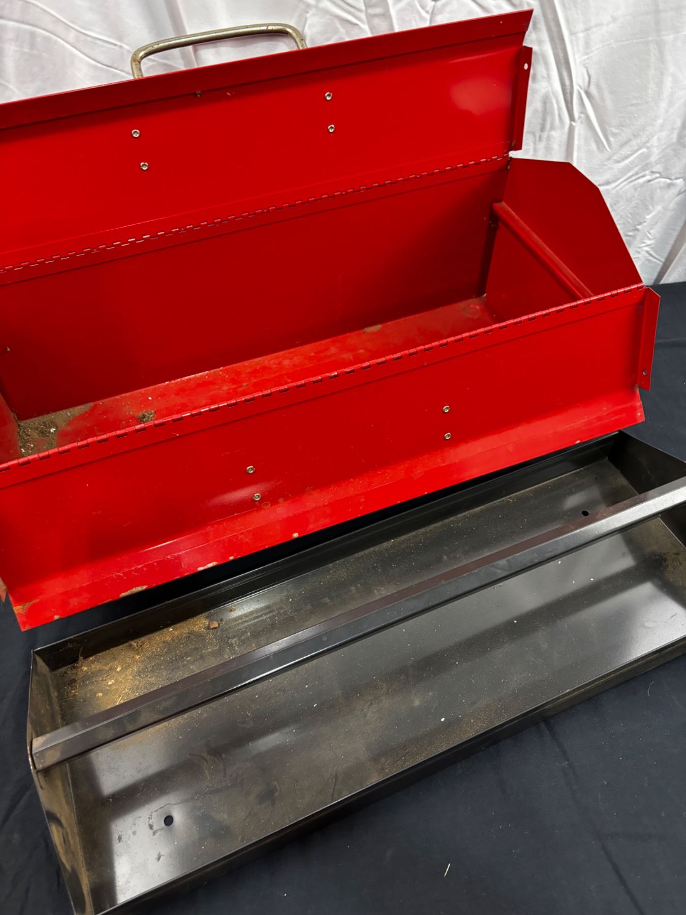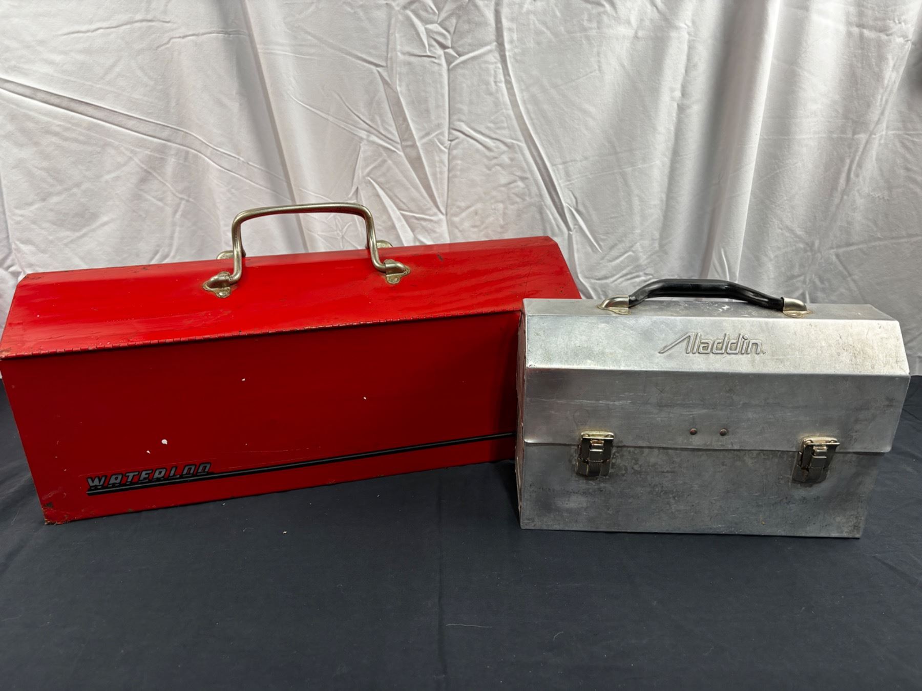 One large Waterloo toolbox in red and a smaller silver Aladdin toolbox. Waterloo is 21" long, 8" wide and 8.5" tall. Some wear and tear.