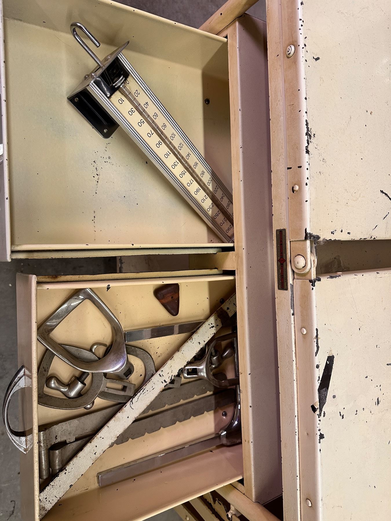 Folding table from Surgical Supplies when extended 68" long - when folded 4' long x 22.5" wide x 33" tall - Metal side table with 1 drawer and 1 cupboard 20" wide x 15.5" deep x 31" tall