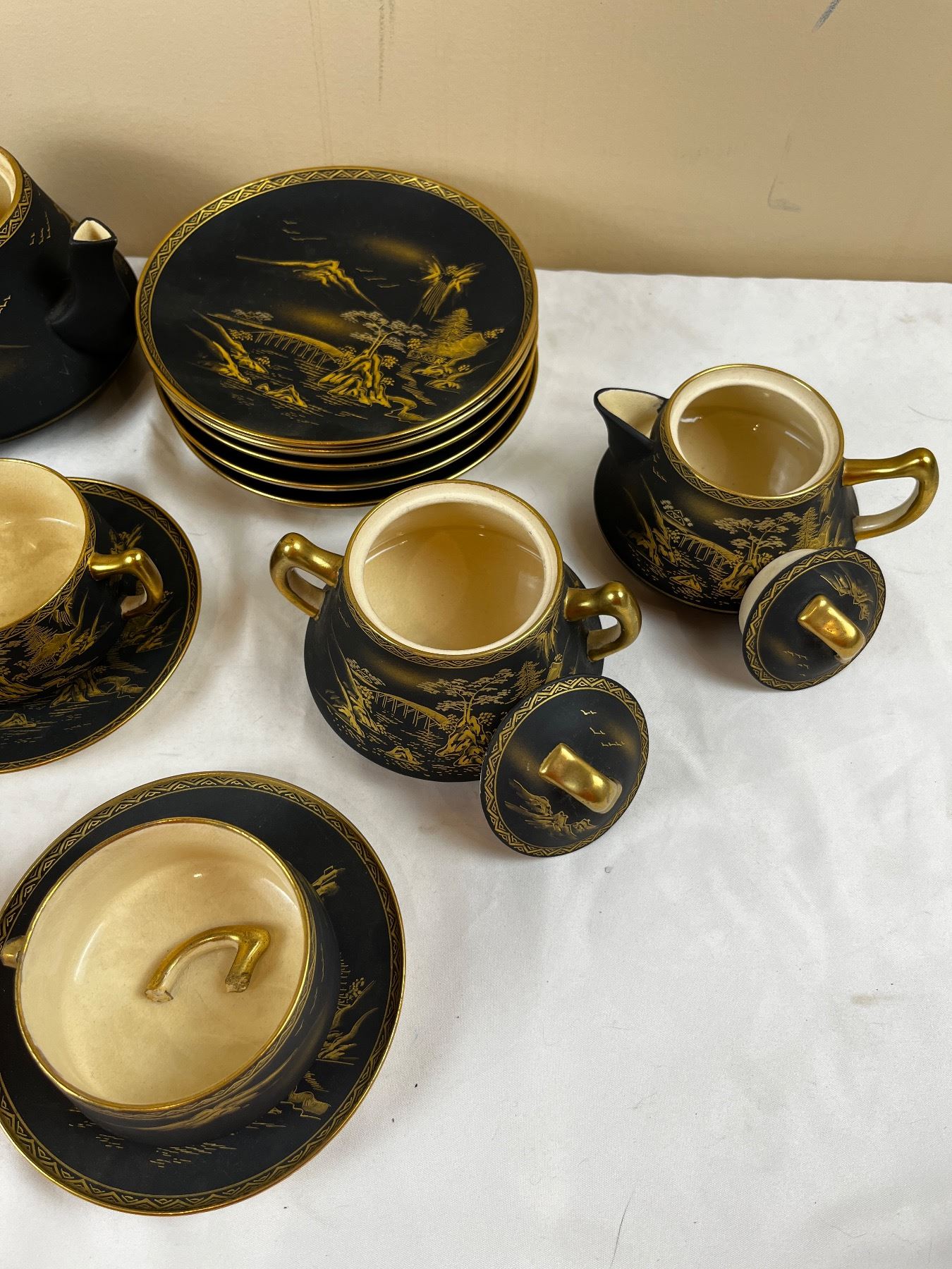 Includes 5 plates, 6 cups & saucers (one cup has a broken handle), teapot, sugar and creamer