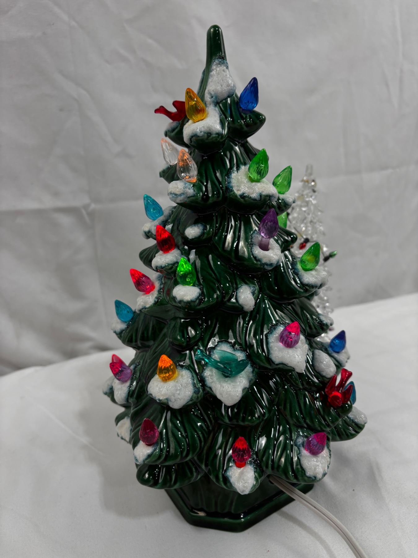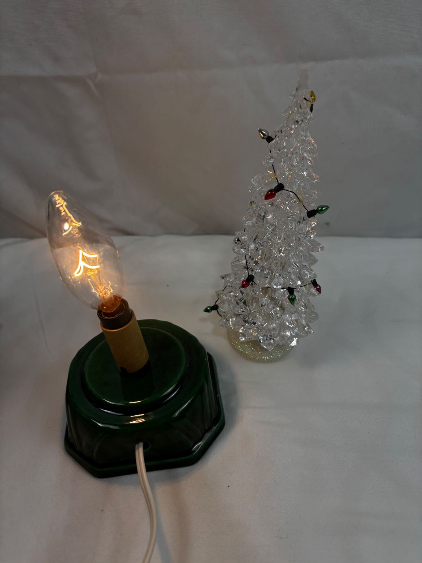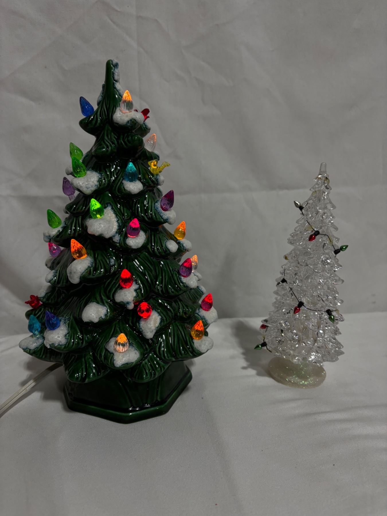 One is made of plastic and the other ceramic. Small plastic tree does not have batteries.