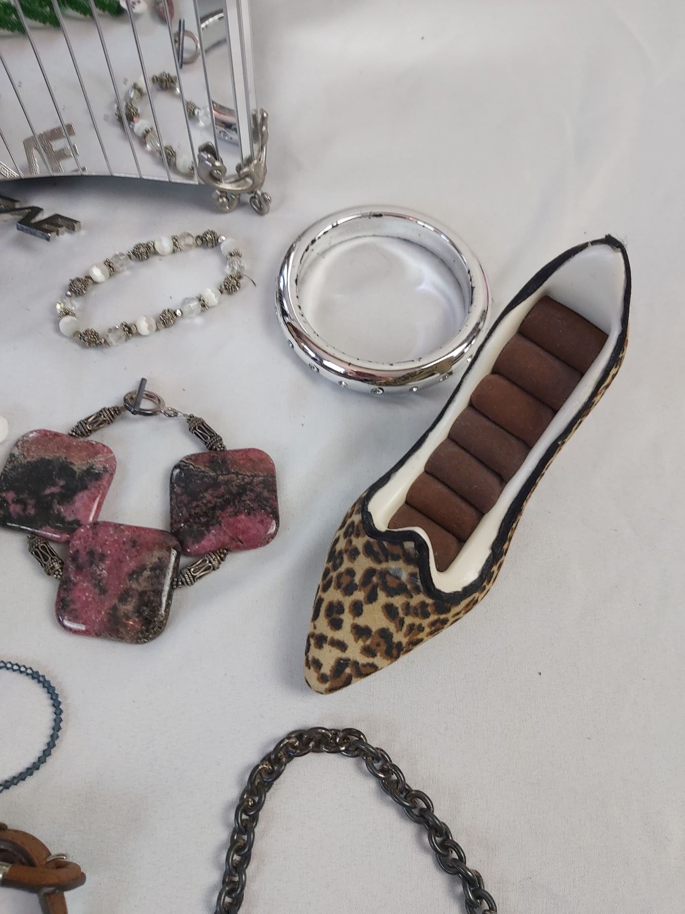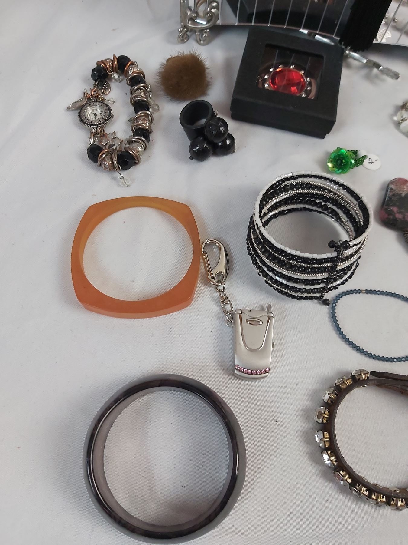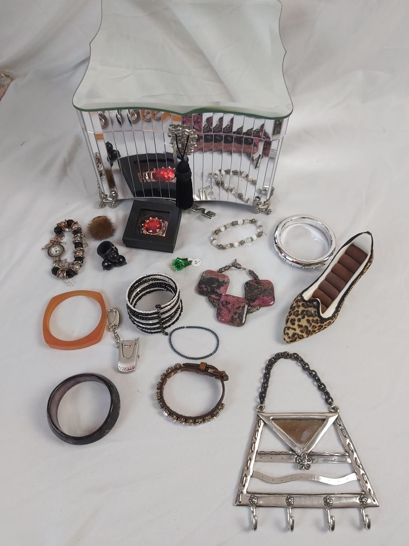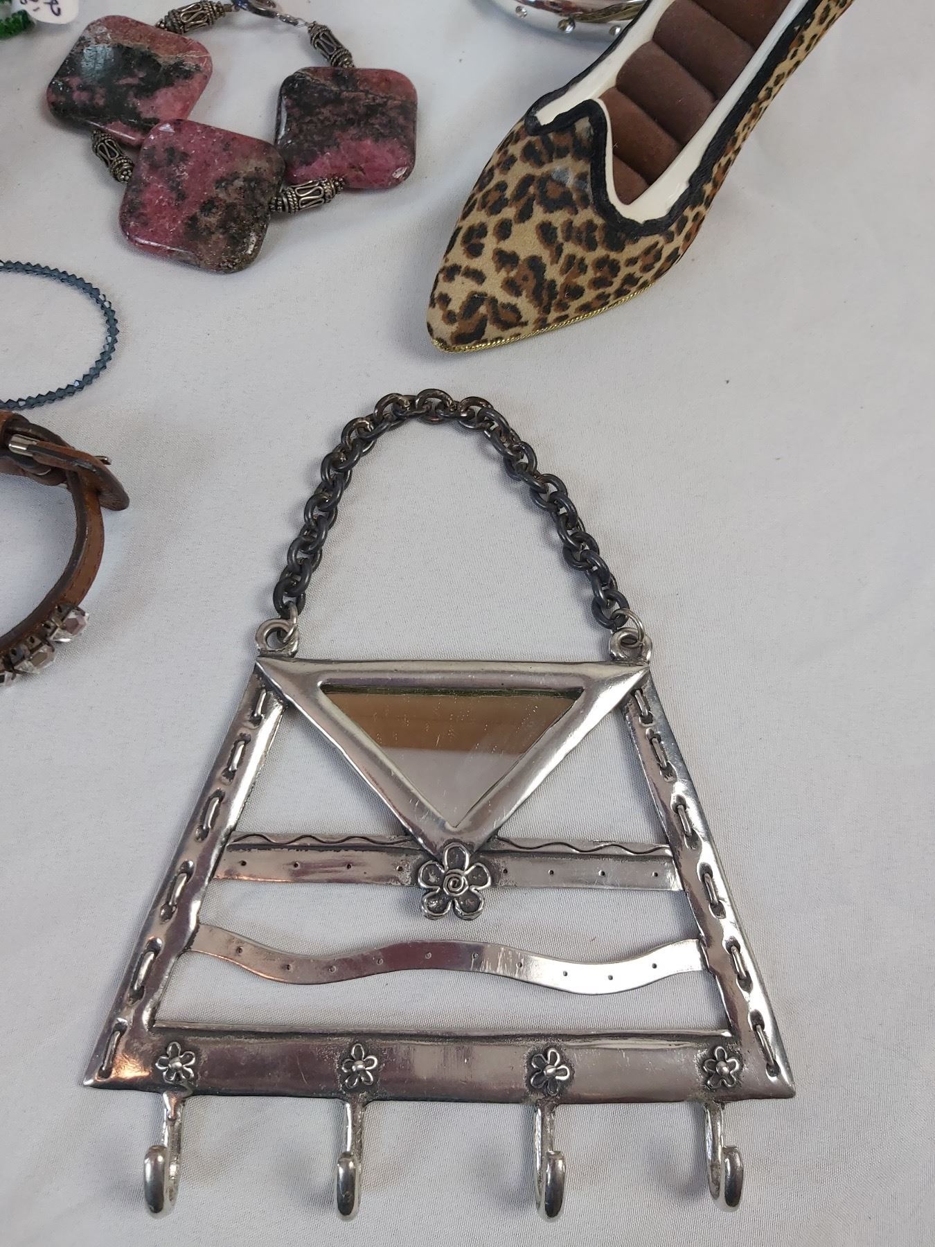 Includes various pieces of costume jewelry, ring holder, purse hook, etc.