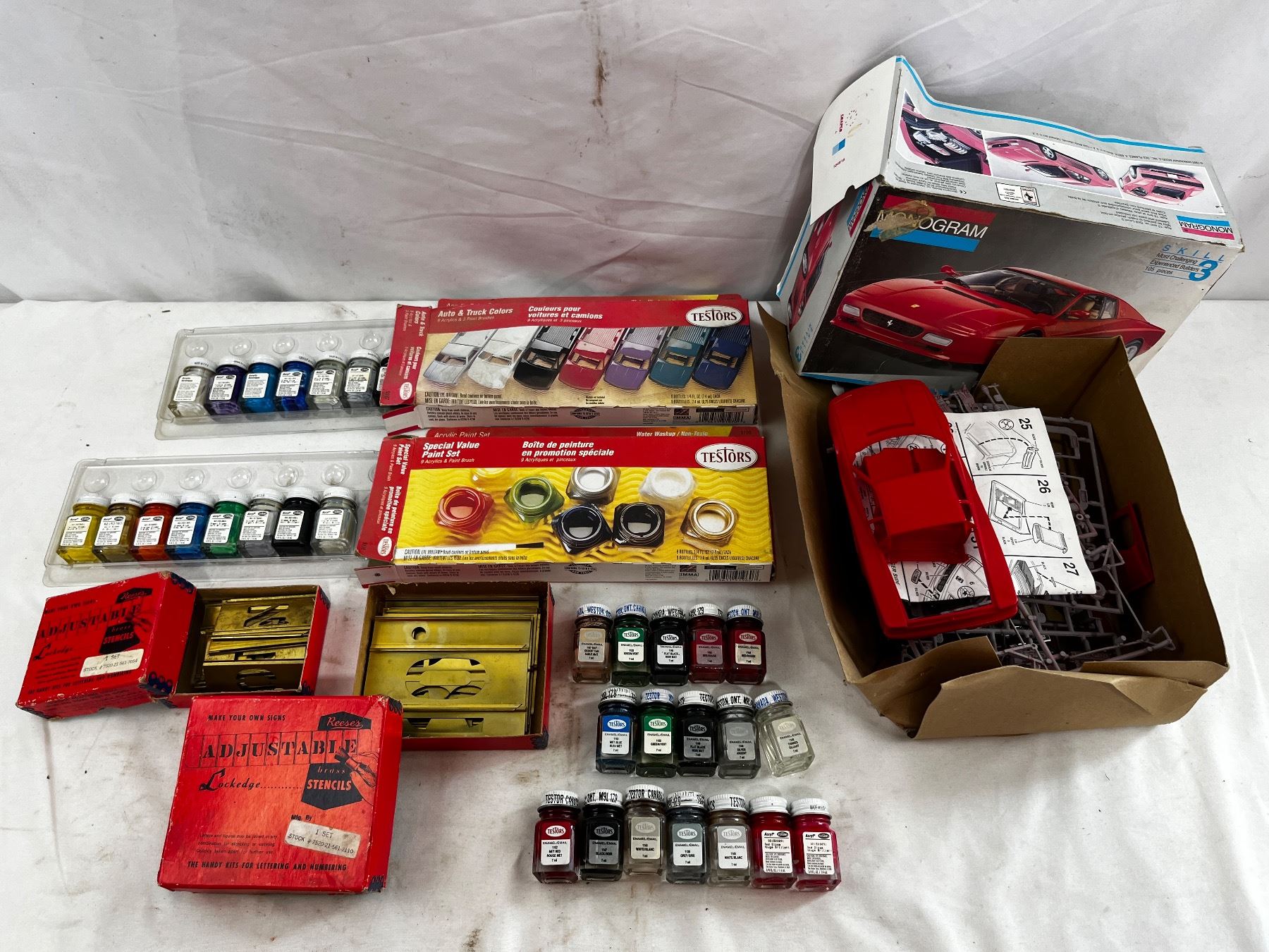 Includes Monogram Ferrari Testarossa, Adjustable Lockable Stencils, various used enamel paints