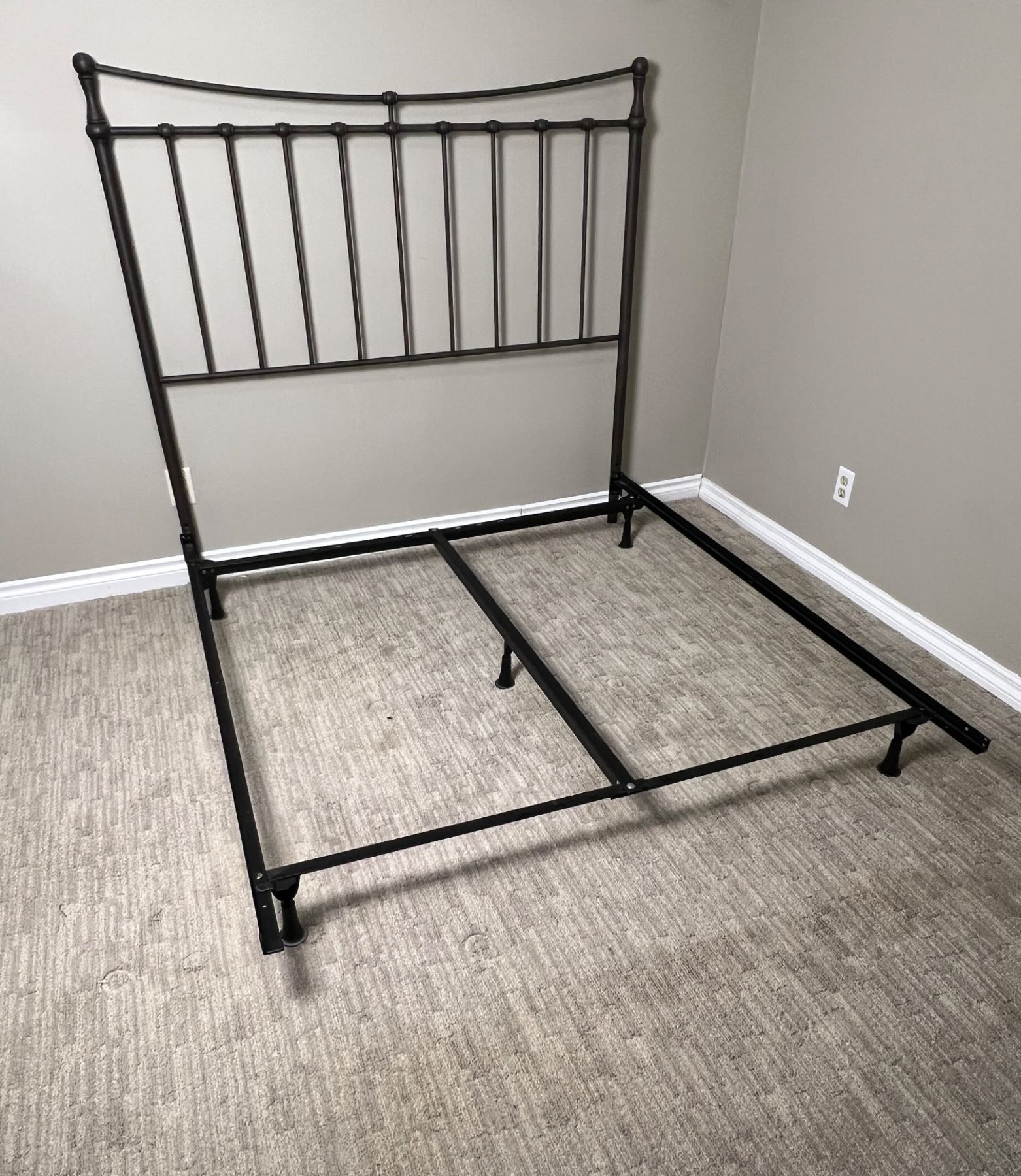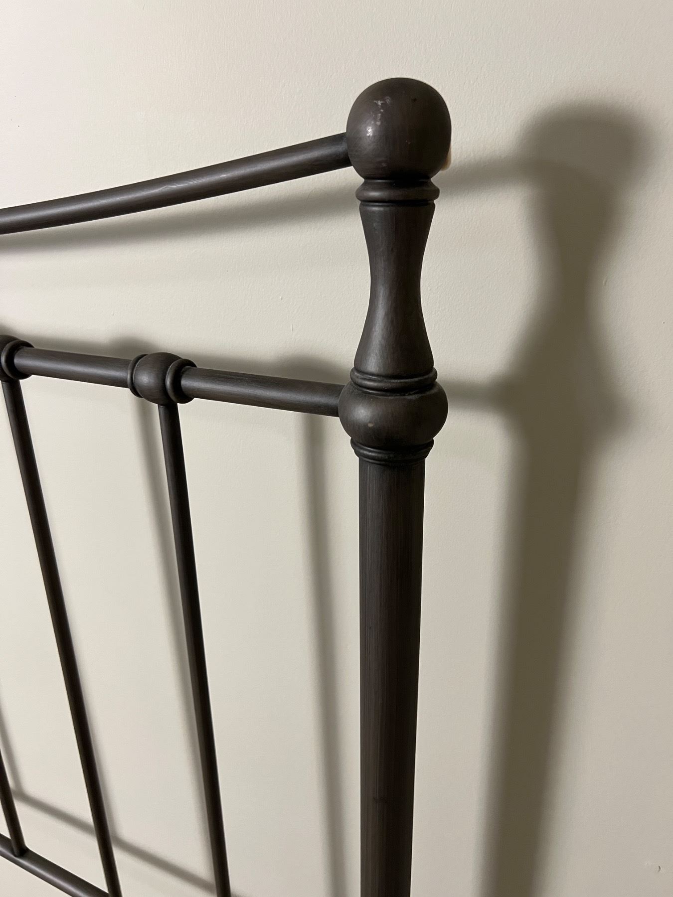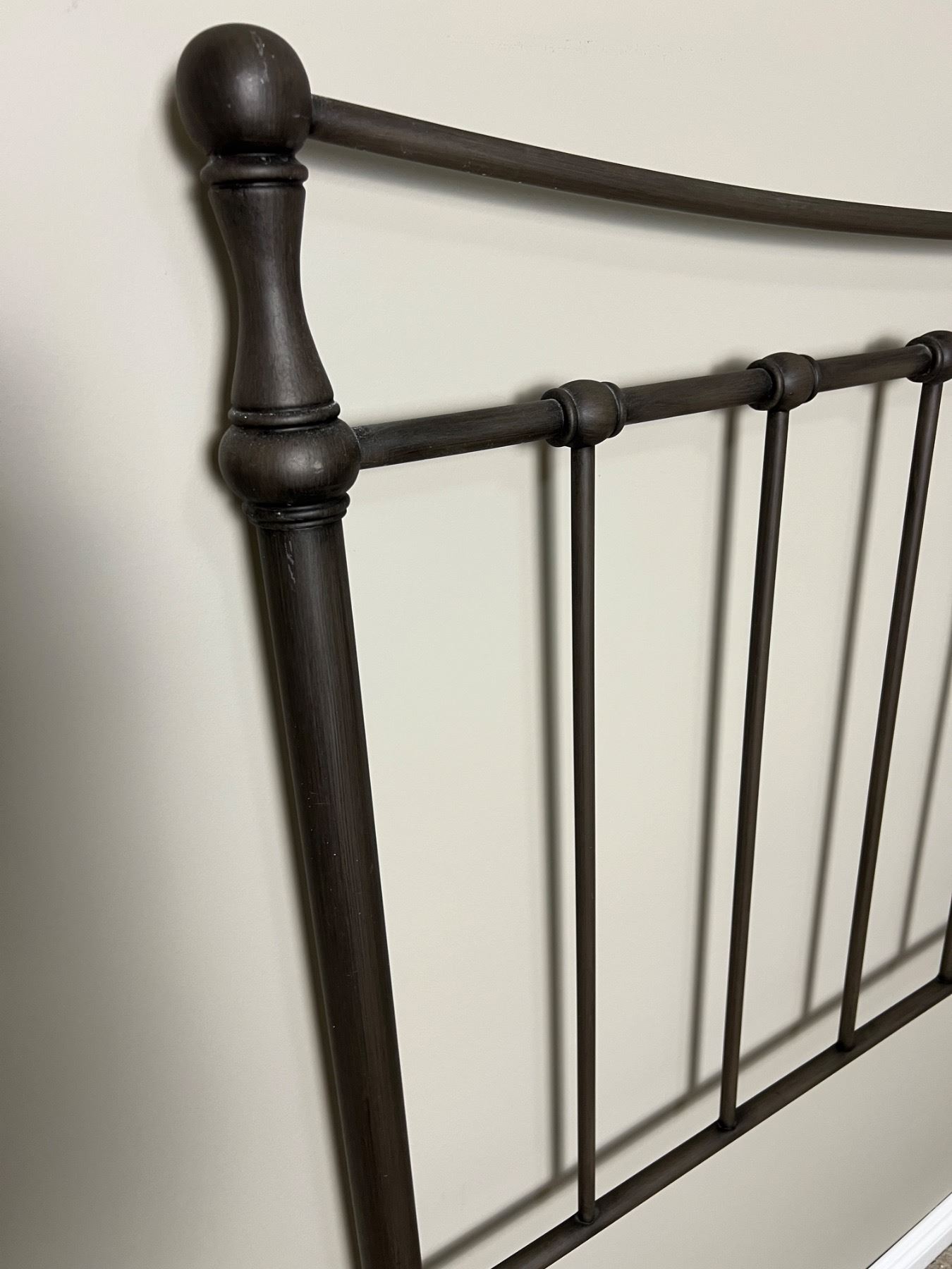 Simple brushed wood design. Headboard stands 57" tall by 72" long
