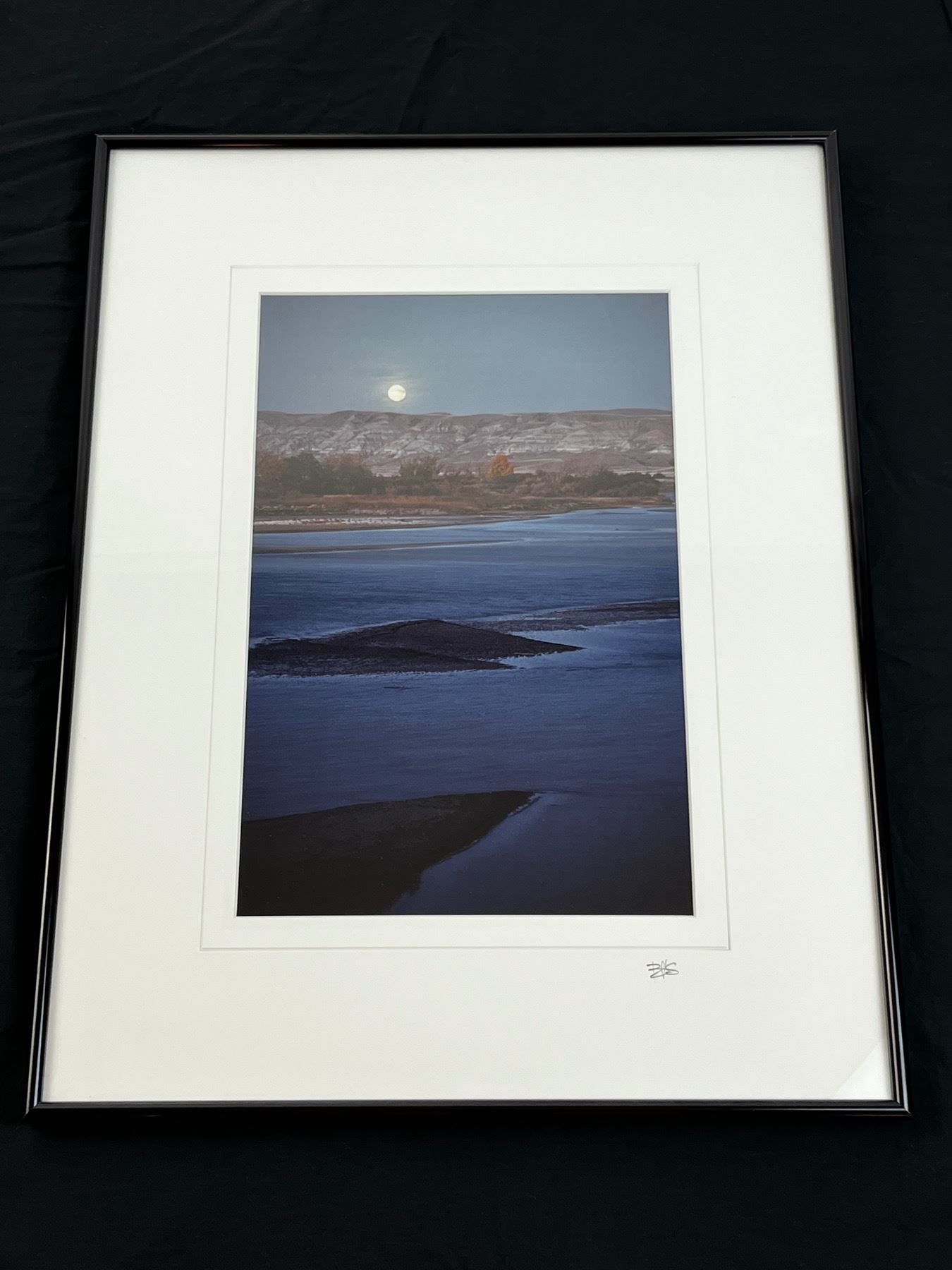 Original Alberta Landscape Photographs by Brian Van Sickle - Moon Over Red Deer River (Image 32 X 21 cm – Frame 50 X 39 cm) - Color Cibachrome - Black metal frame and archival mat - Signed