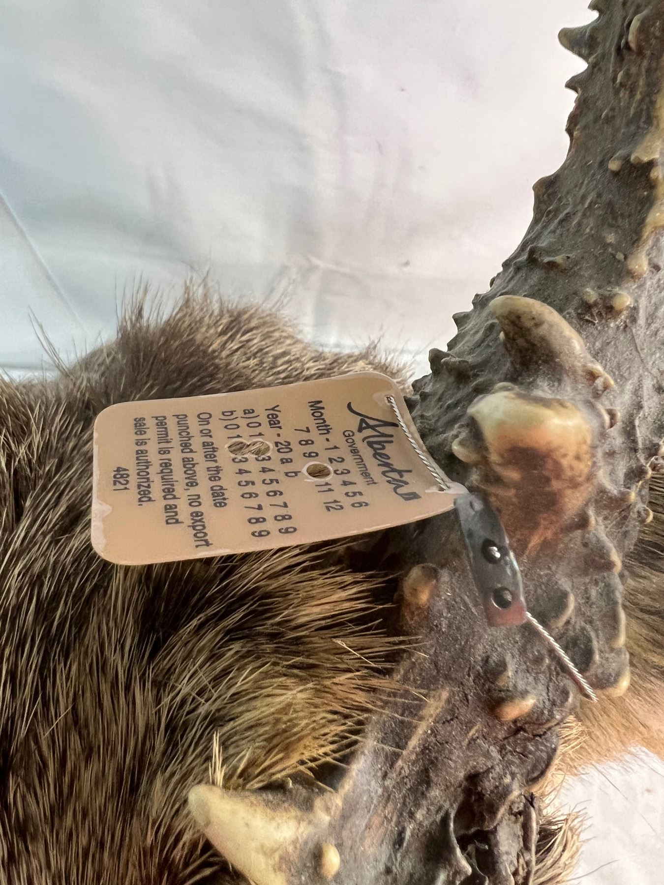 Licence number 7416873-1 - Registration mark Number 4821 - Tag Location L- Antler - Tagged by Alberta Fish and Wildlife.