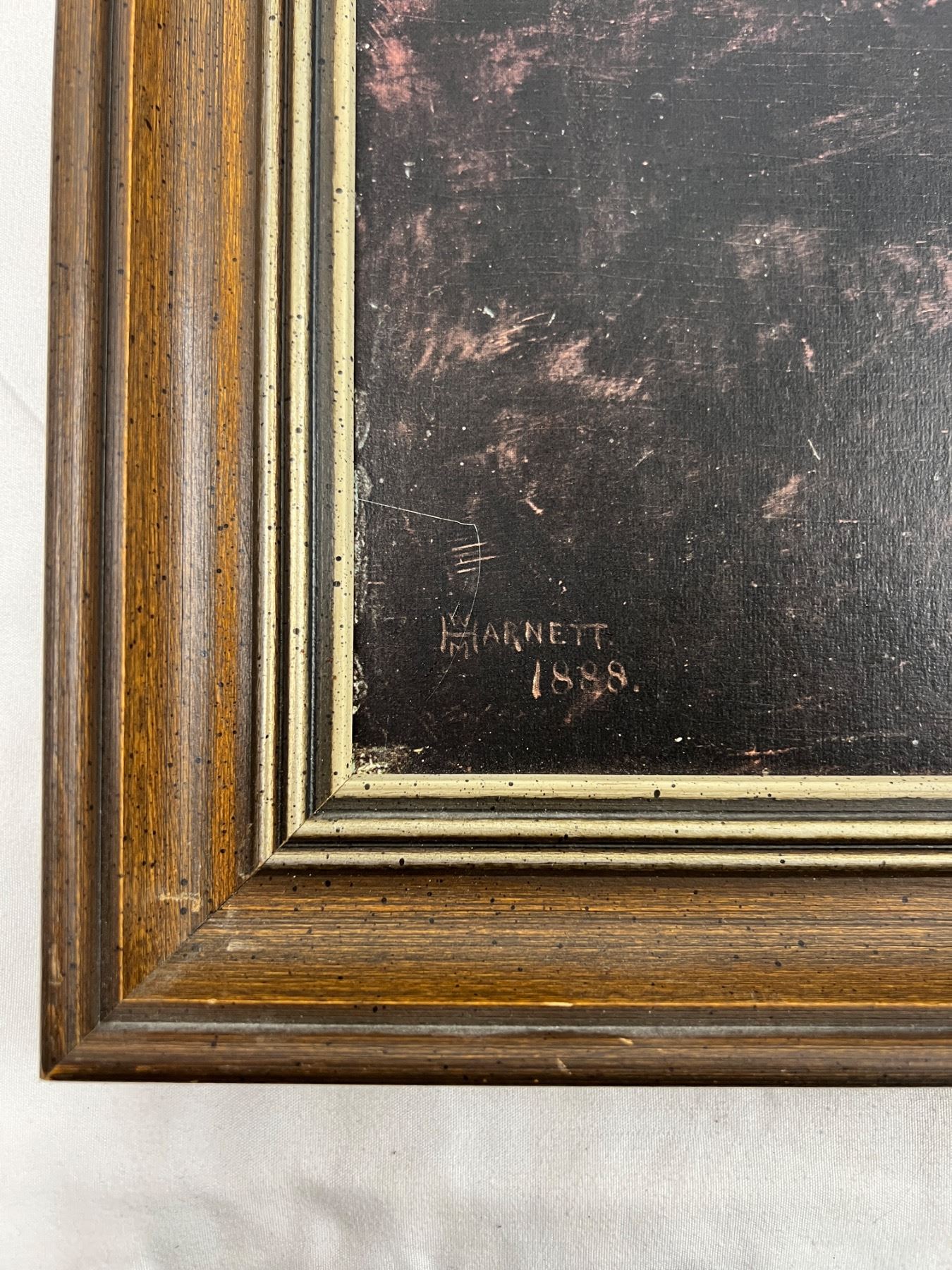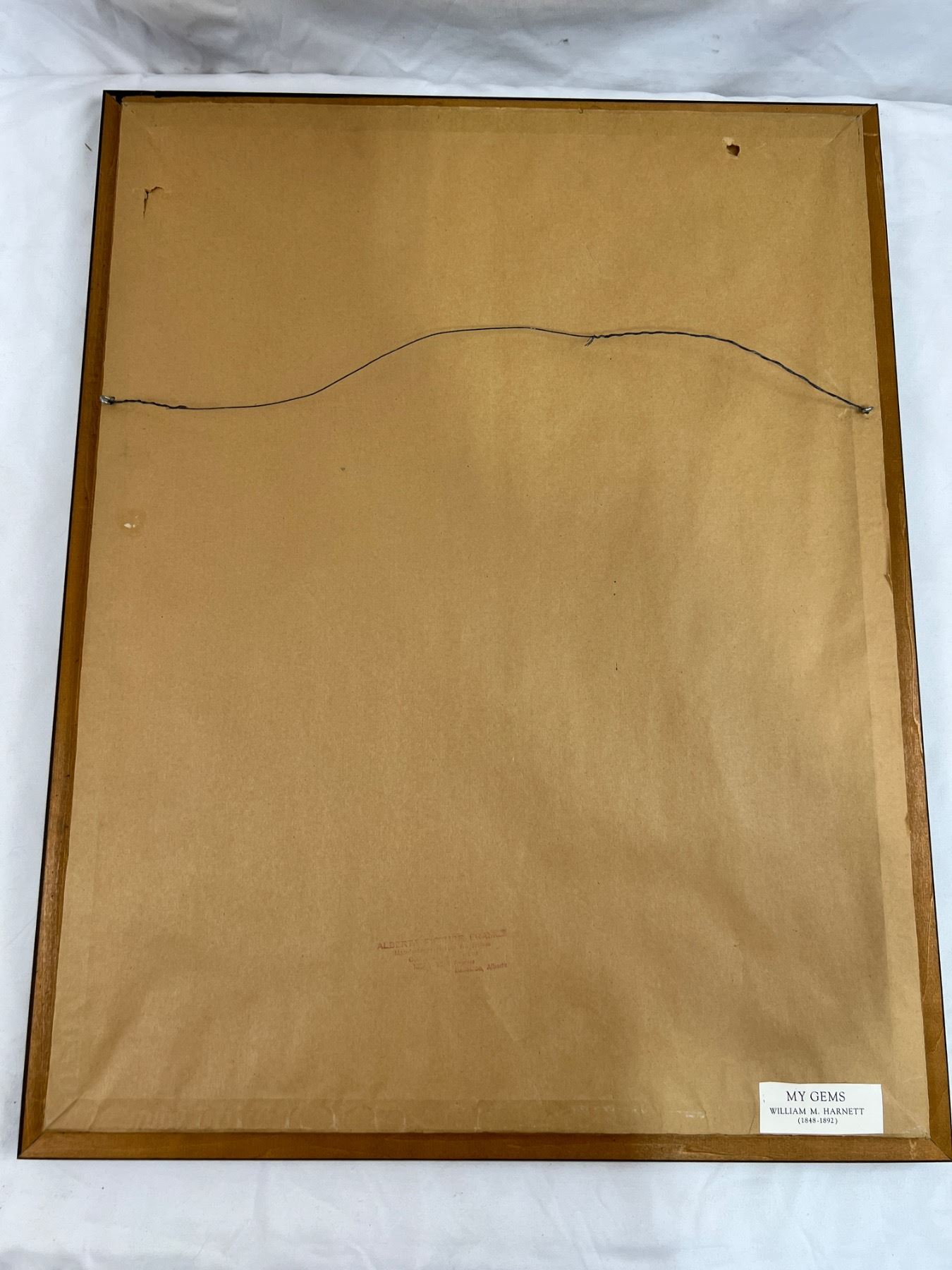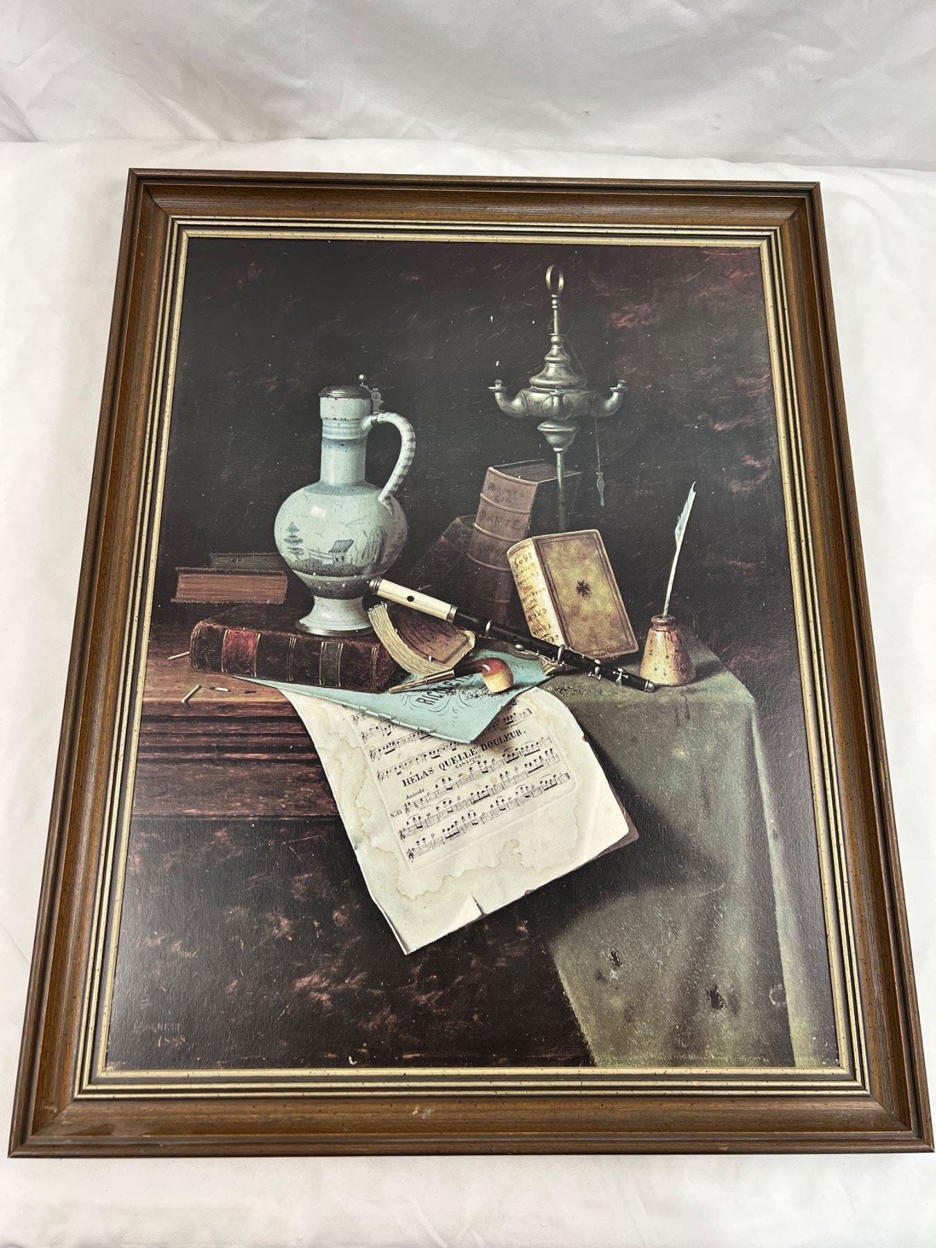 Original artist is William M. Harnett. Feels like it has been printed onto MDF. Approximately 26" by 20" . Scuffs to wood frame. Some damage to paper on rear.
