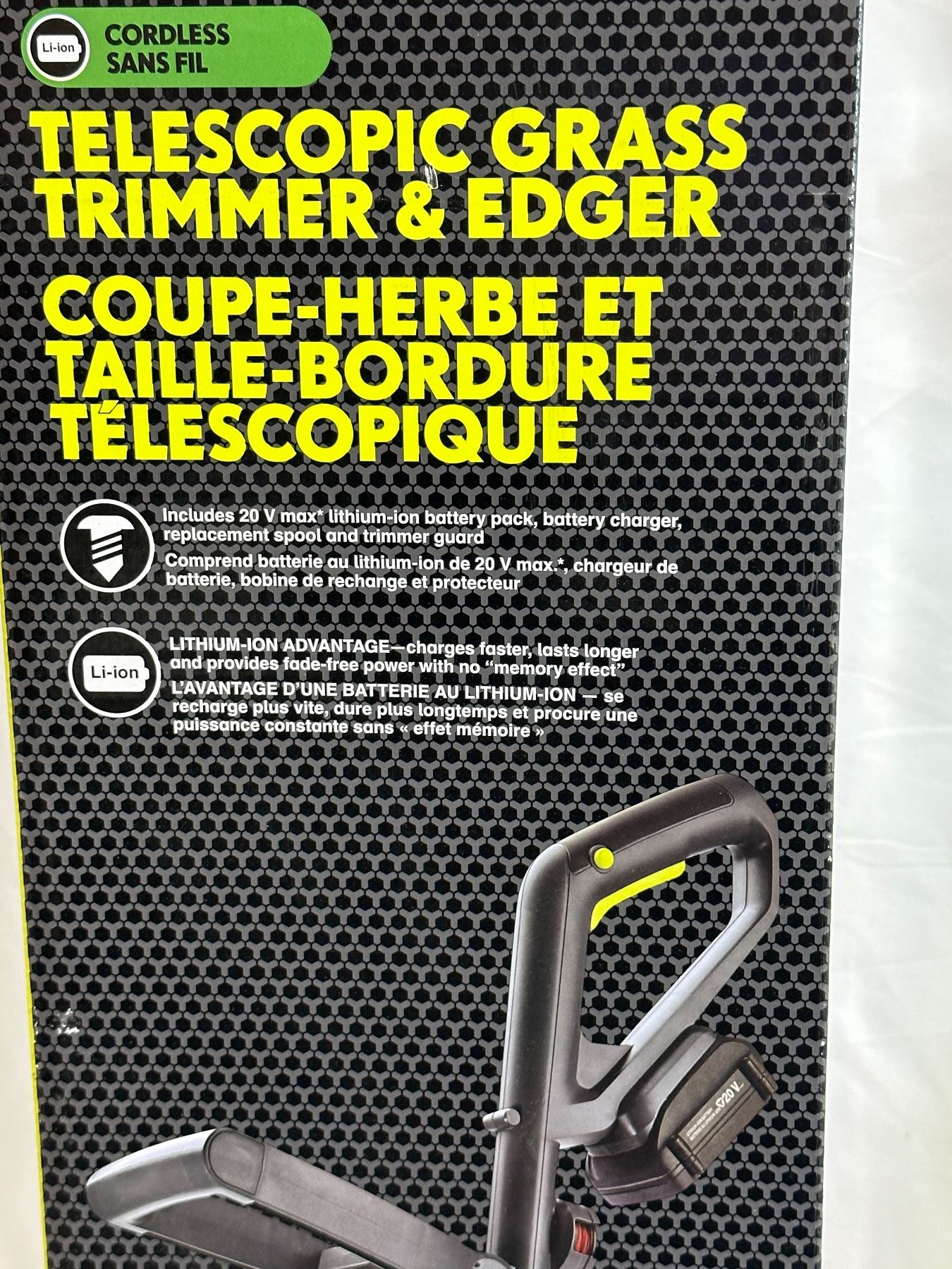 Cordless - includes 20V max lithium-ion battery pack, battery charger, replacement spool and trimmer guard - New in box - Never Used