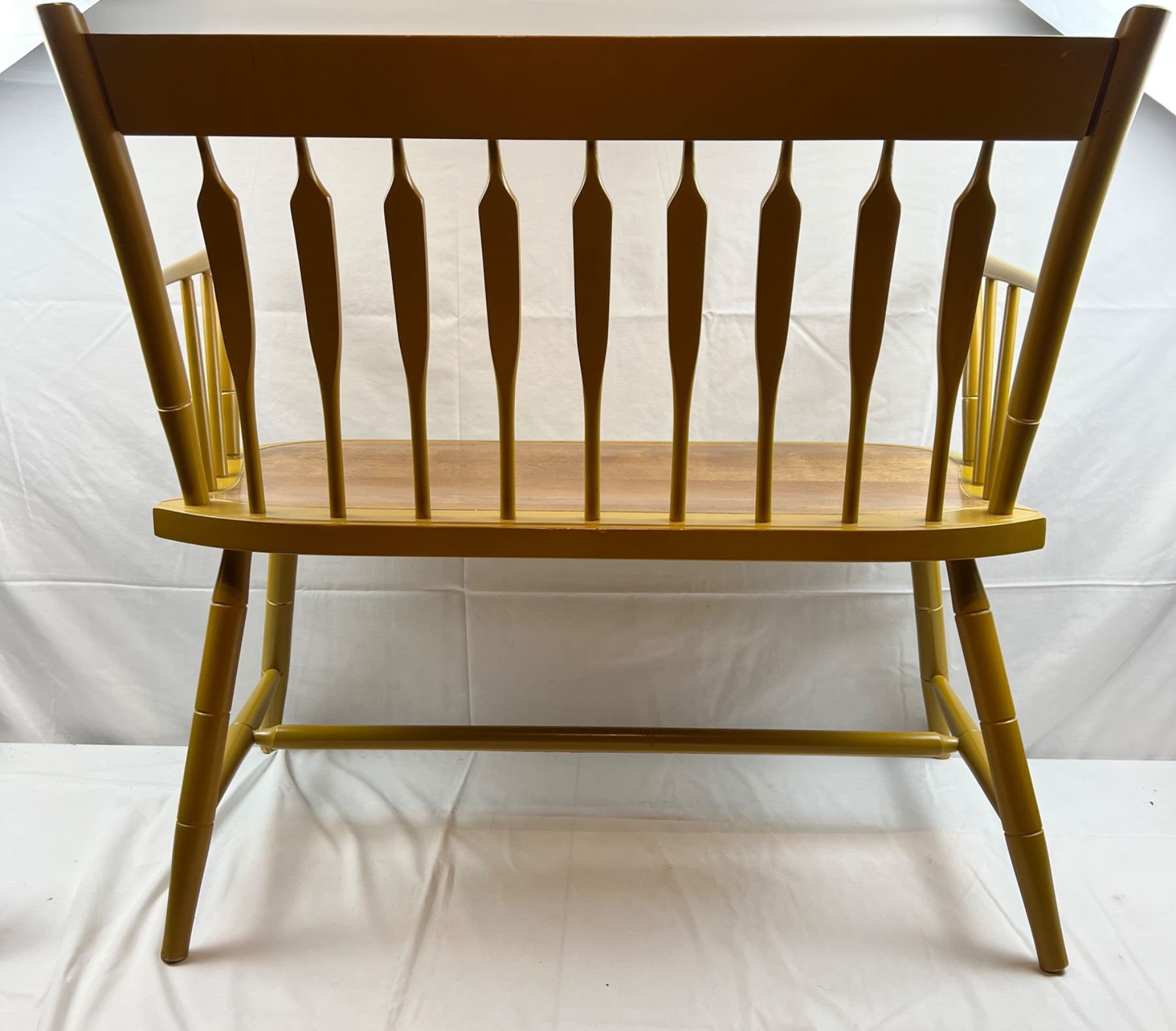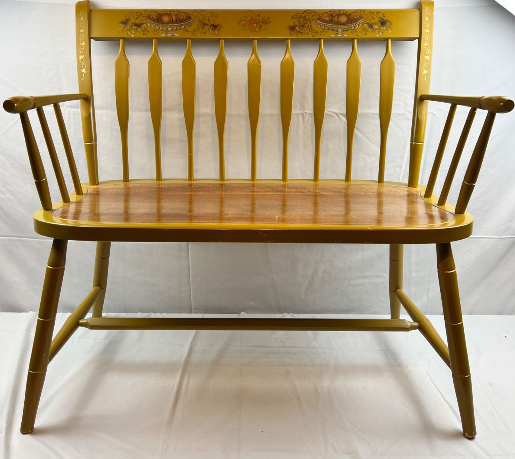 Measures 33" W by 33"H and 15"D. Some scuffs and marks to seat portion of wood.