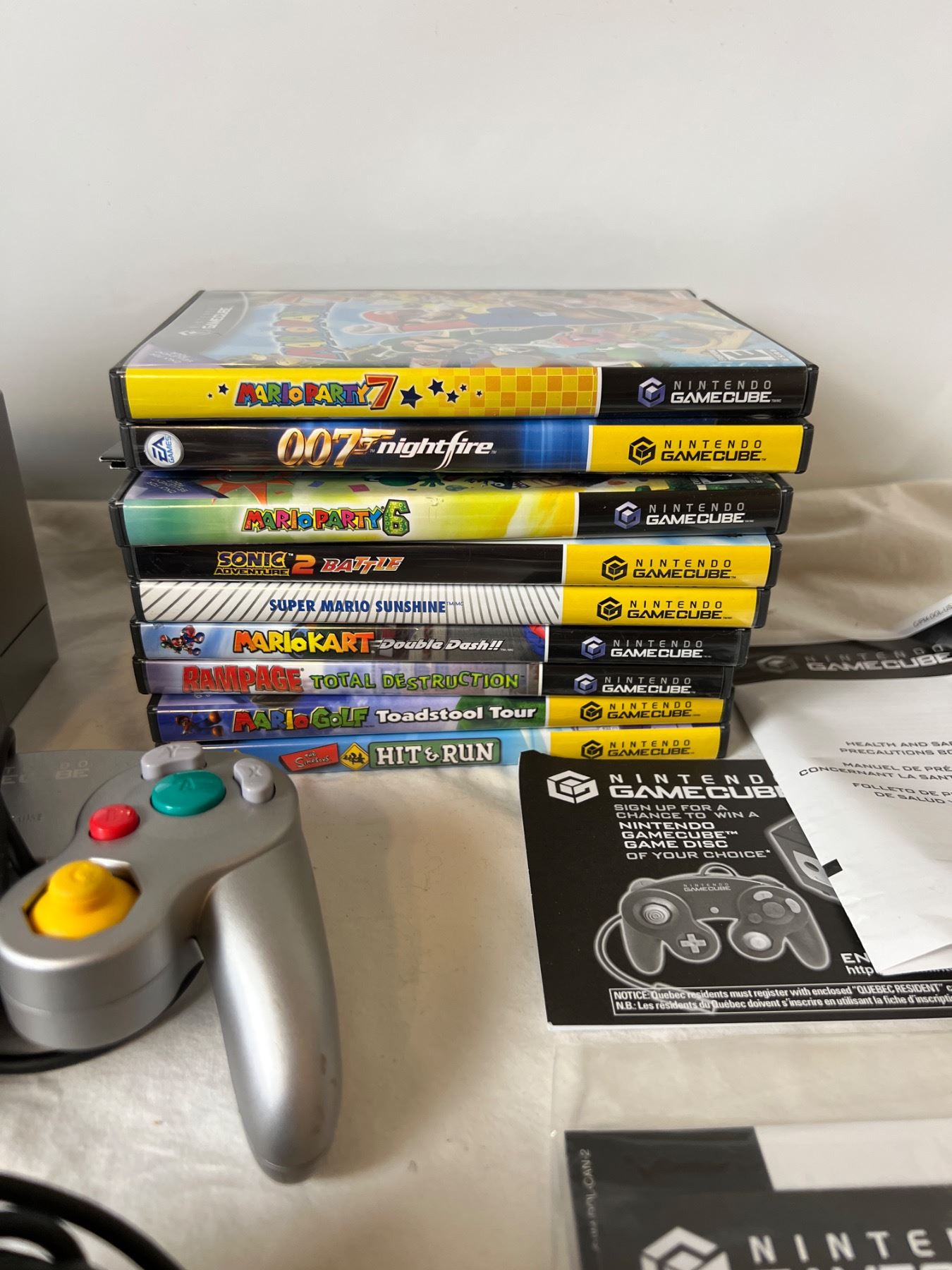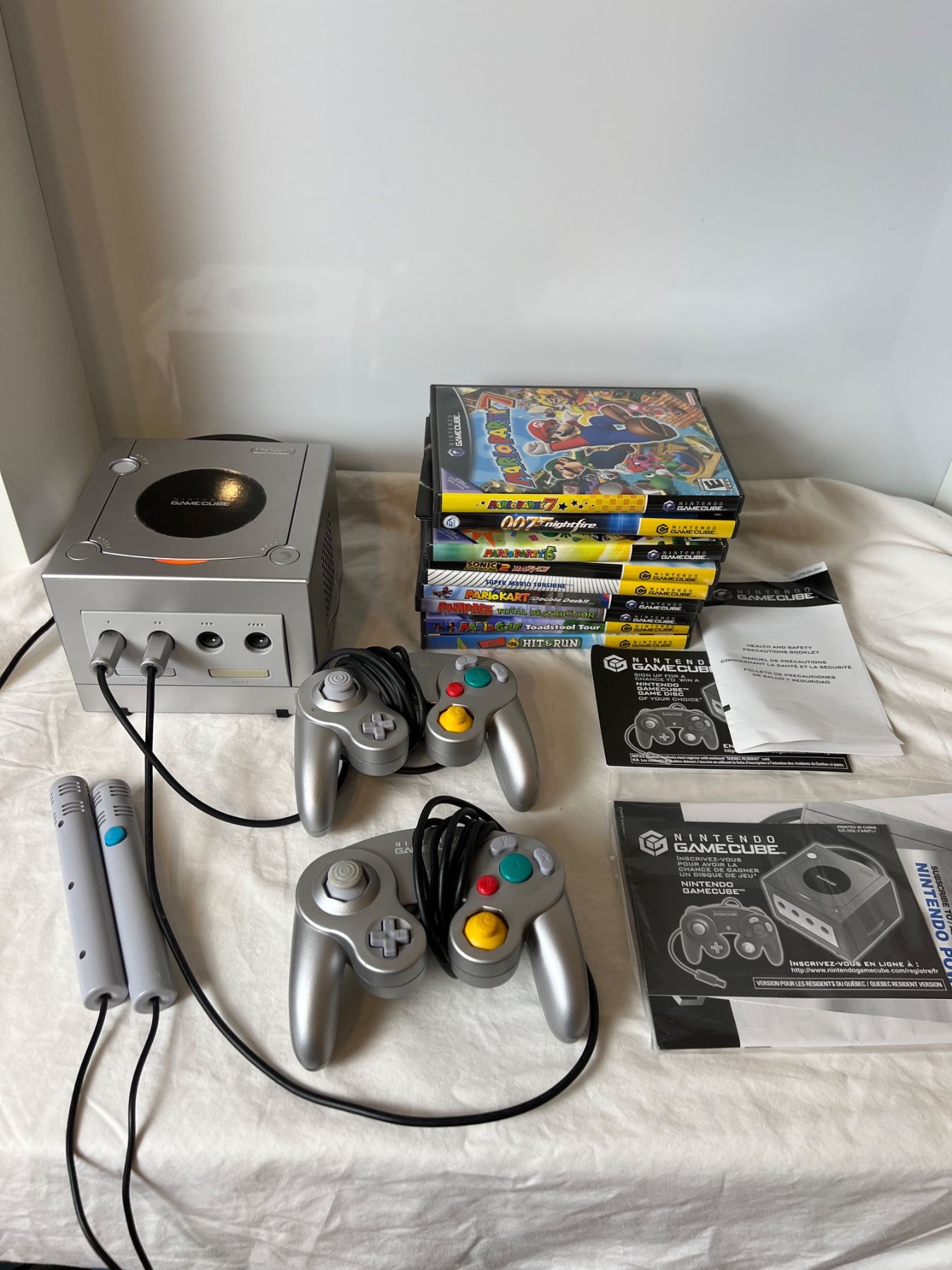 Includes two controllers and two microphones. Variety of games and console powers on, no issue opening closing disc port.