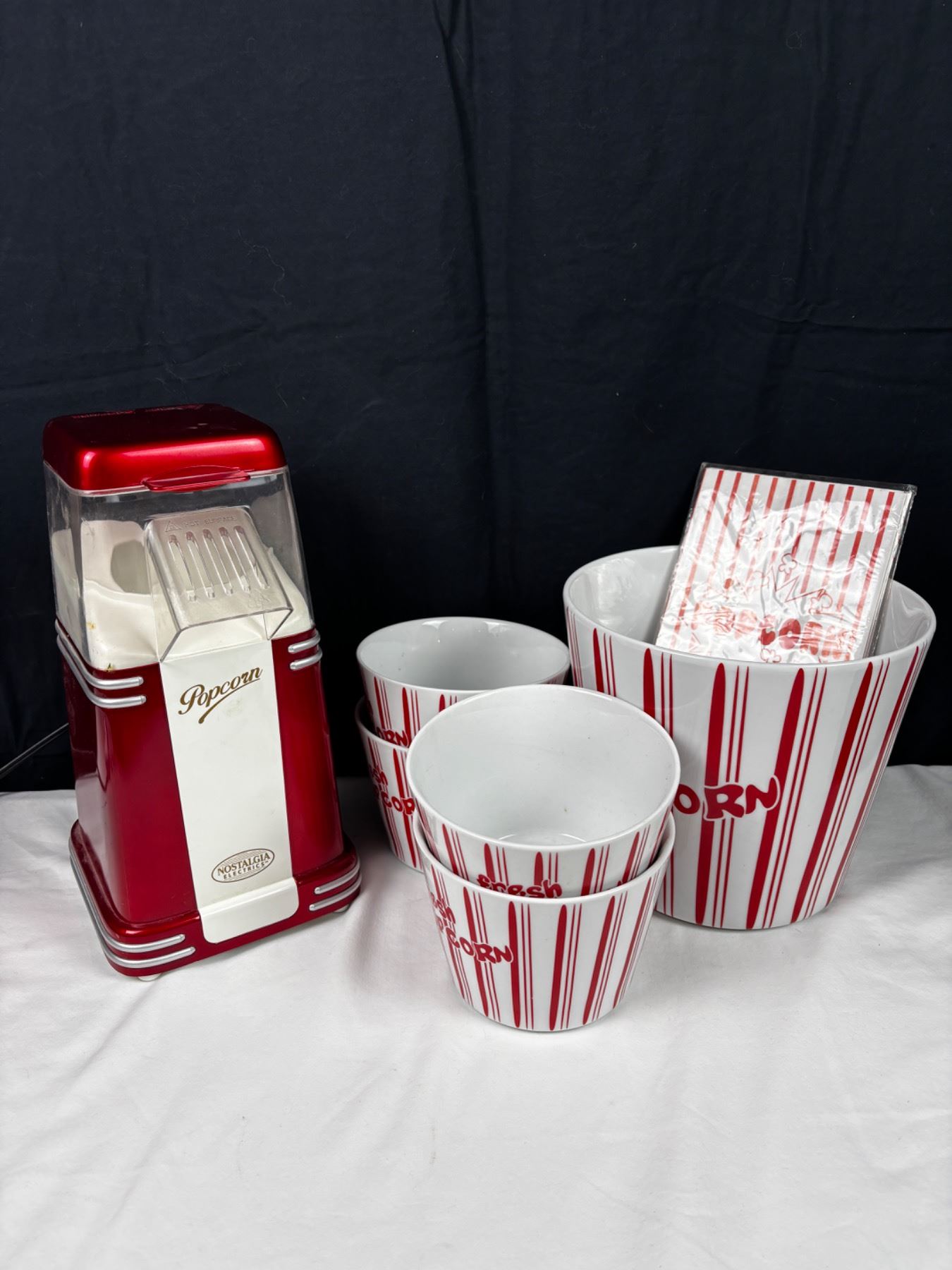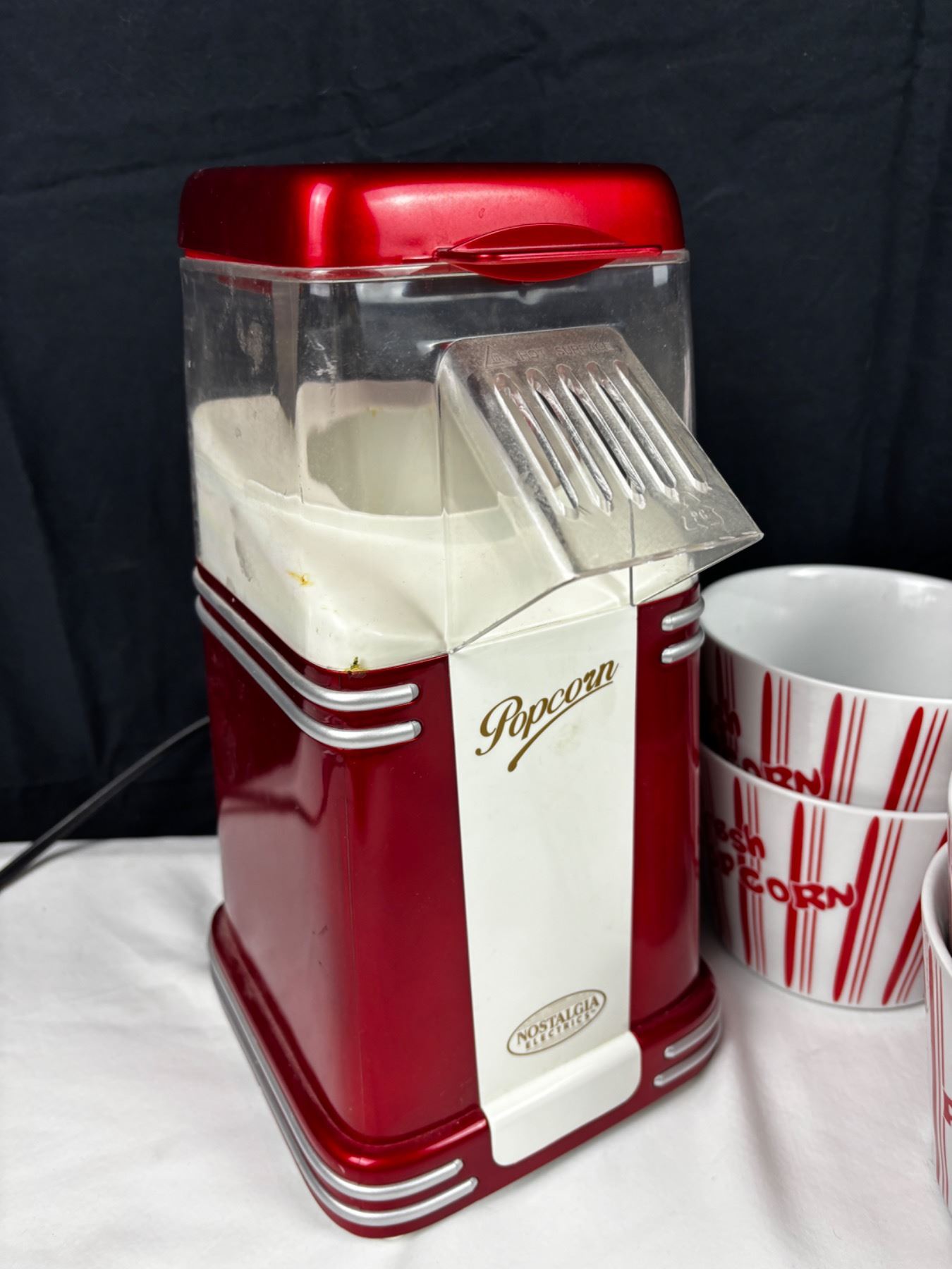 Includes, Nostalgia Electrics Popcorn Popper (turns on), 5 ceramic popcorn bowls (largest is 7.5"H), and more